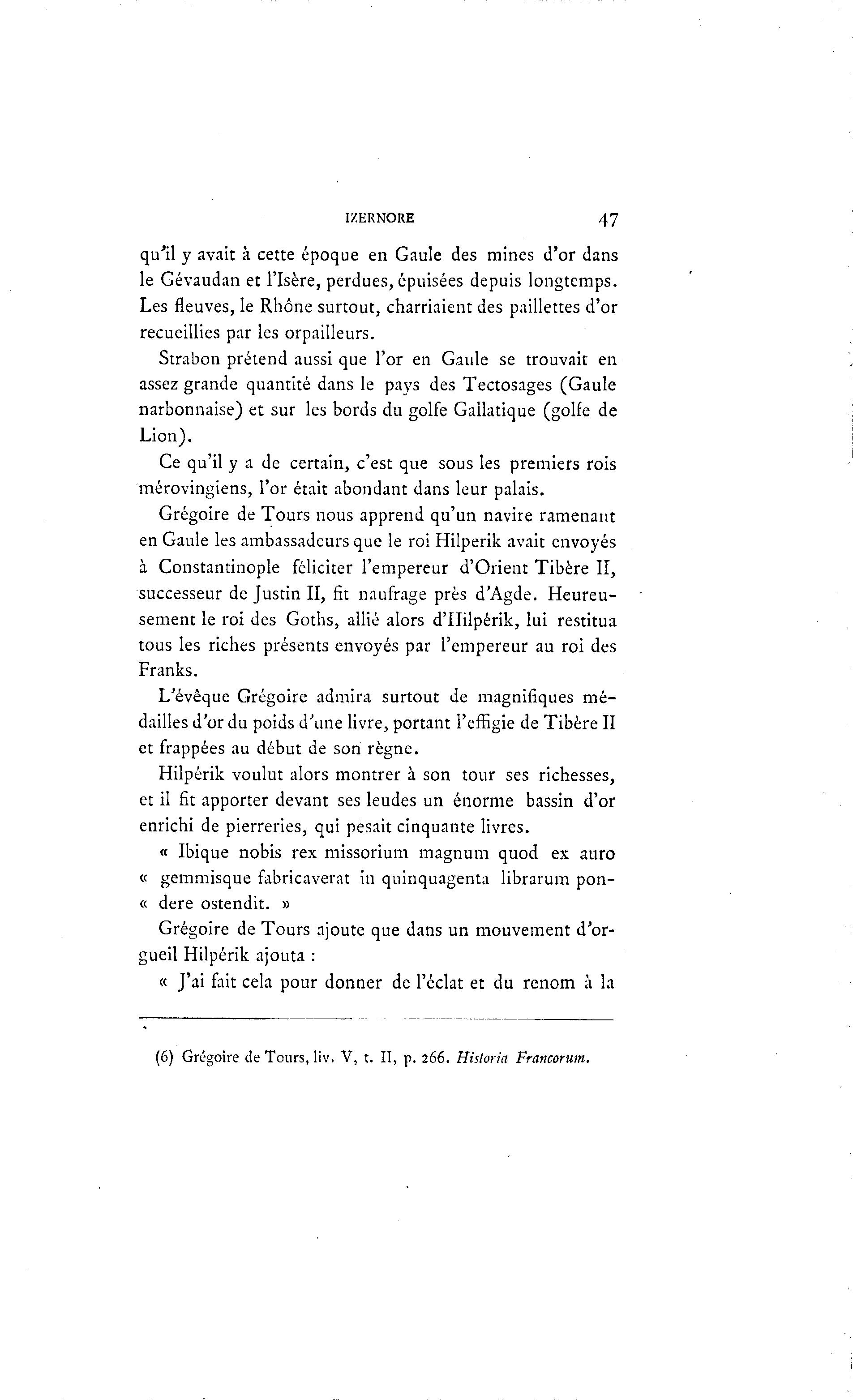 IZERNORE 47 qu'il y avait à cette époque en Gaule des mines d'or dans le Gévaudan et l'Isère, perdues, épuisées depuis longtemps. Les fleuves, le Rhône surtout, charriaient des paillettes d'or recueillies par les orpailleurs. Strabon prétend aussi que l'or en Gaule se trouvait en assez grande quantité dans le pays des Tectosages (Gaule narbonnaise) et sur les bords du golfe Gallatique (golfe de Lion). Ce qu'il y a de certain, c'est que sous les premiers rois mérovingiens, l'or était abondant dans leur palais. Grégoire de Tours nous apprend qu'un navire ramenant en Gaule les ambassadeurs que le roi Hilperik avait envoyés à Constantinople féliciter l'empereur d'Orient Tibère II, successeur de Justin II, fit naufrage près d'Agde. Heureu- sement le roi des Goths, allié alors d'Hilpérik, lui restitua tous les riches présents envoyés par l'empereur au roi des Franks. L'évêque Grégoire admira surtout de magnifiques mé- dailles d'or du poids d'une livre, portant l'effigie de Tibère II et frappées au début de son règne. Hilperik voulut alors montrer à son tour ses richesses, et il fit apporter devant ses leudes un énorme bassin d'or enrichi de pierreries, qui pesait cinquante livres. « Ibique nobis rex missorium magnum quod ex auro « gemmisque fabricaverat in quinquagenta librarum pon- c dere ostendit. » e Grégoire de Tours ajoute que dans un mouvement d'or- gueil Hilperik ajouta : « J'ai fait cela pour donner de l'éclat et du renom à la (6) Grégoire de Tours, liv. V, t. II, p. 266. Historia Francorum.