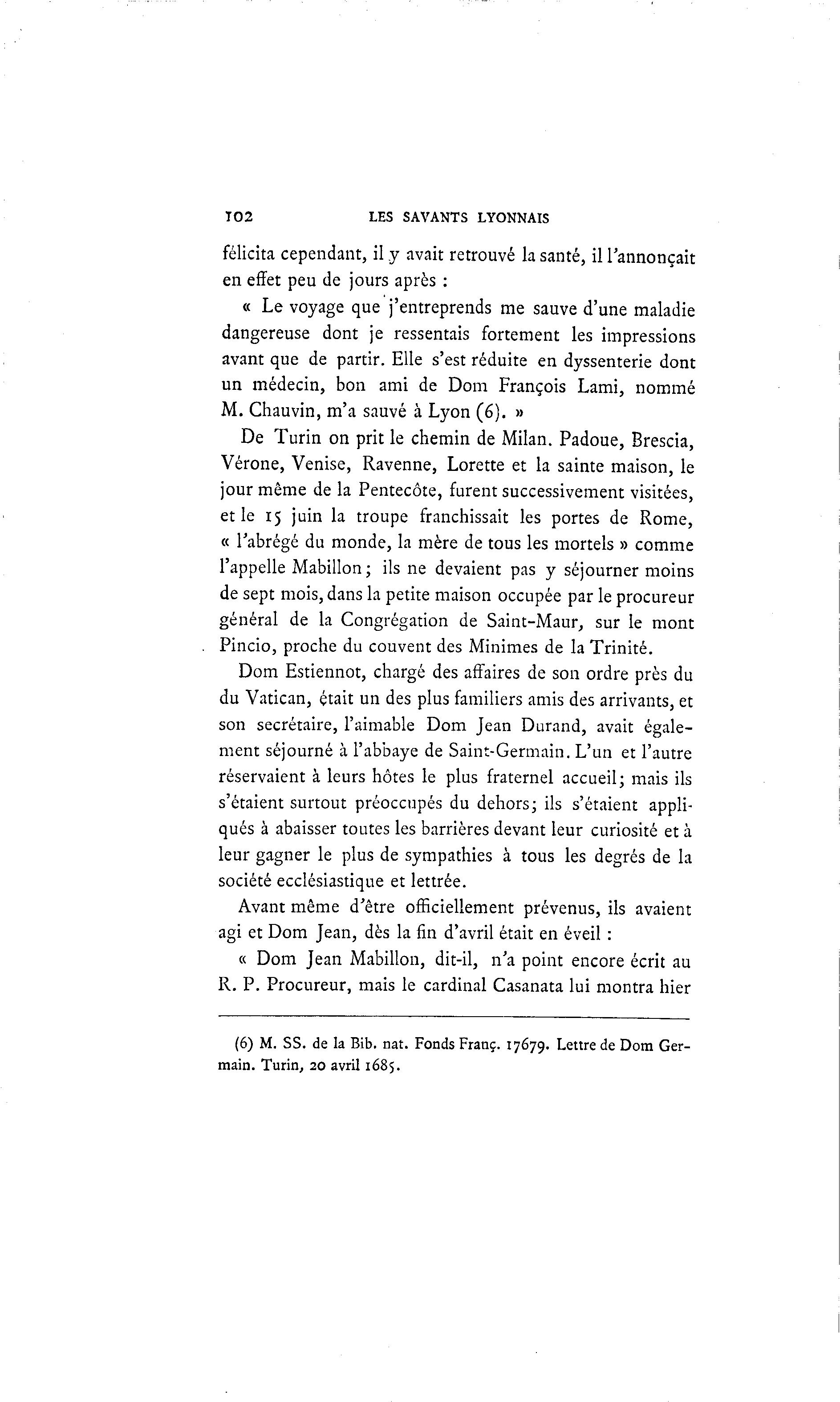 102 LES SAVANTS LYONNAIS félicita cependant, il y avait retrouvé la santé, il l'annonçait en effet peu de jours après : « Le voyage que j'entreprends me sauve d'une maladie dangereuse dont je ressentais fortement les impressions avant que de partir. Elle s'est réduite en dyssenterie dont un médecin, bon ami de Dom François Lami, nommé M. Chauvin, m'a sauvé à Lyon (6). » De Turin on prit le chemin de Milan. Padoue, Brescia, Vérone, Venise, Ravenne, Lorette et la sainte maison, le jour même de la Pentecôte, furent successivement visitées, et le 15 juin la troupe franchissait les portes de Rome, « l'abrégé du monde, la mère de tous les mortels » comme l'appelle Mabillon; ils ne devaient pas y séjourner moins de sept mois, dans la petite maison occupée par le procureur général de la Congrégation de Saint-Maur, sur le mont Pincio, proche du couvent des Minimes de la Trinité. Dom Estiennot, chargé des affaires de son ordre près du du Vatican, était un des plus familiers amis des arrivants, et son secrétaire, l'aimable Dom Jean Durand, avait égale- ment séjourné à l'abbaye de Saint-Germain. L'un et l'autre réservaient à leurs hôtes le plus fraternel accueil; mais ils s'étaient surtout préoccupés du dehors; ils s'étaient appli- qués à abaisser toutes les barrières devant leur curiosité et à leur gagner le plus de sympathies à tous les degrés de la société ecclésiastique et lettrée. Avant même d'être officiellement prévenus, ils avaient agi et Dom Jean, dès la fin d'avril était en éveil : « Dom Jean Mabillon, dit-il, n'a point encore écrit au R. P. Procureur, mais le cardinal Casanata lui montra hier (6) M. SS. de la Bib. nat. Fonds Franc. 17679. Lettre de Dora Ger- main. Turin, 20 avril 1685.