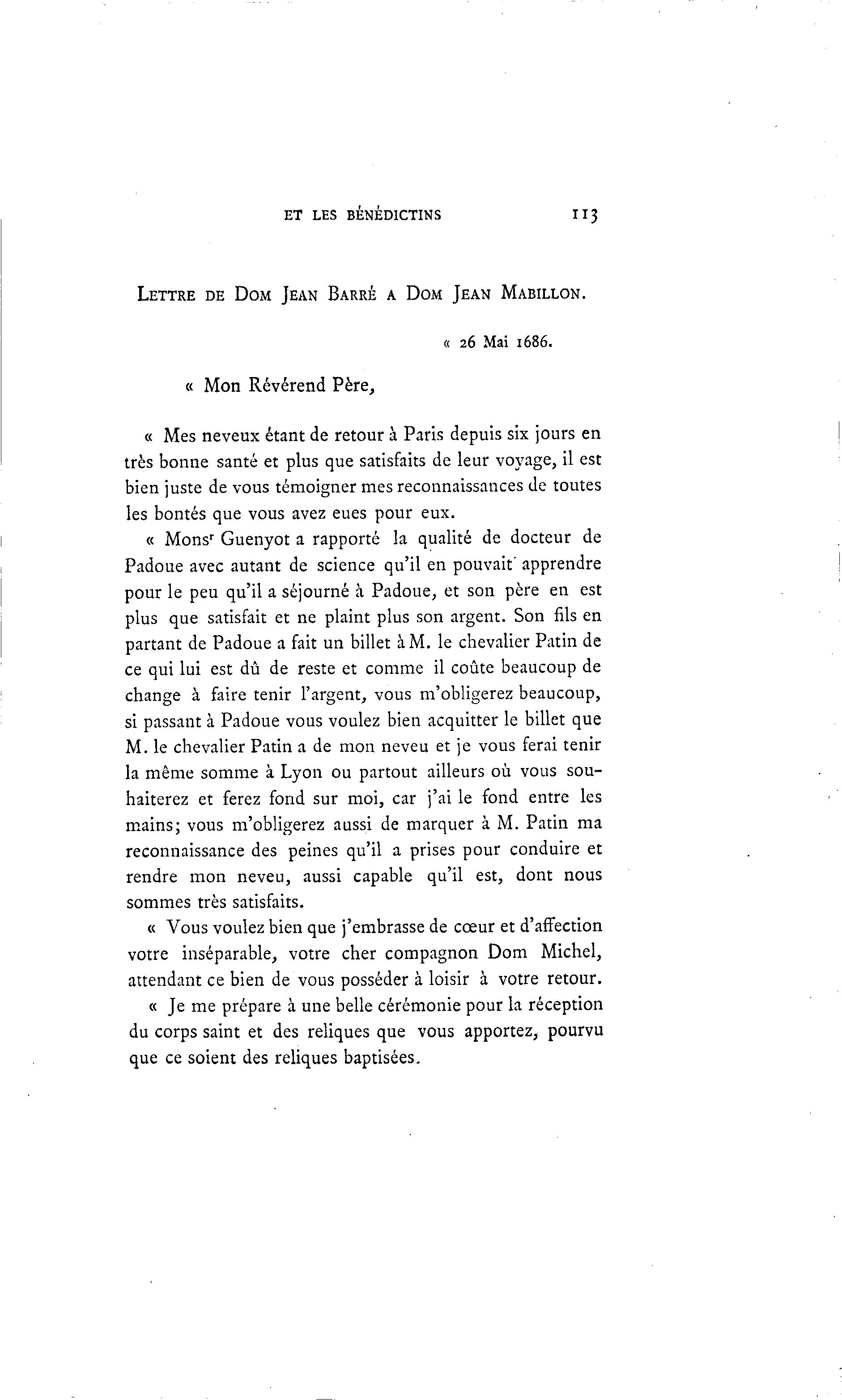 LETTRE DE DOM JEAN BARRÉ A DOM JEAN MABILLON.