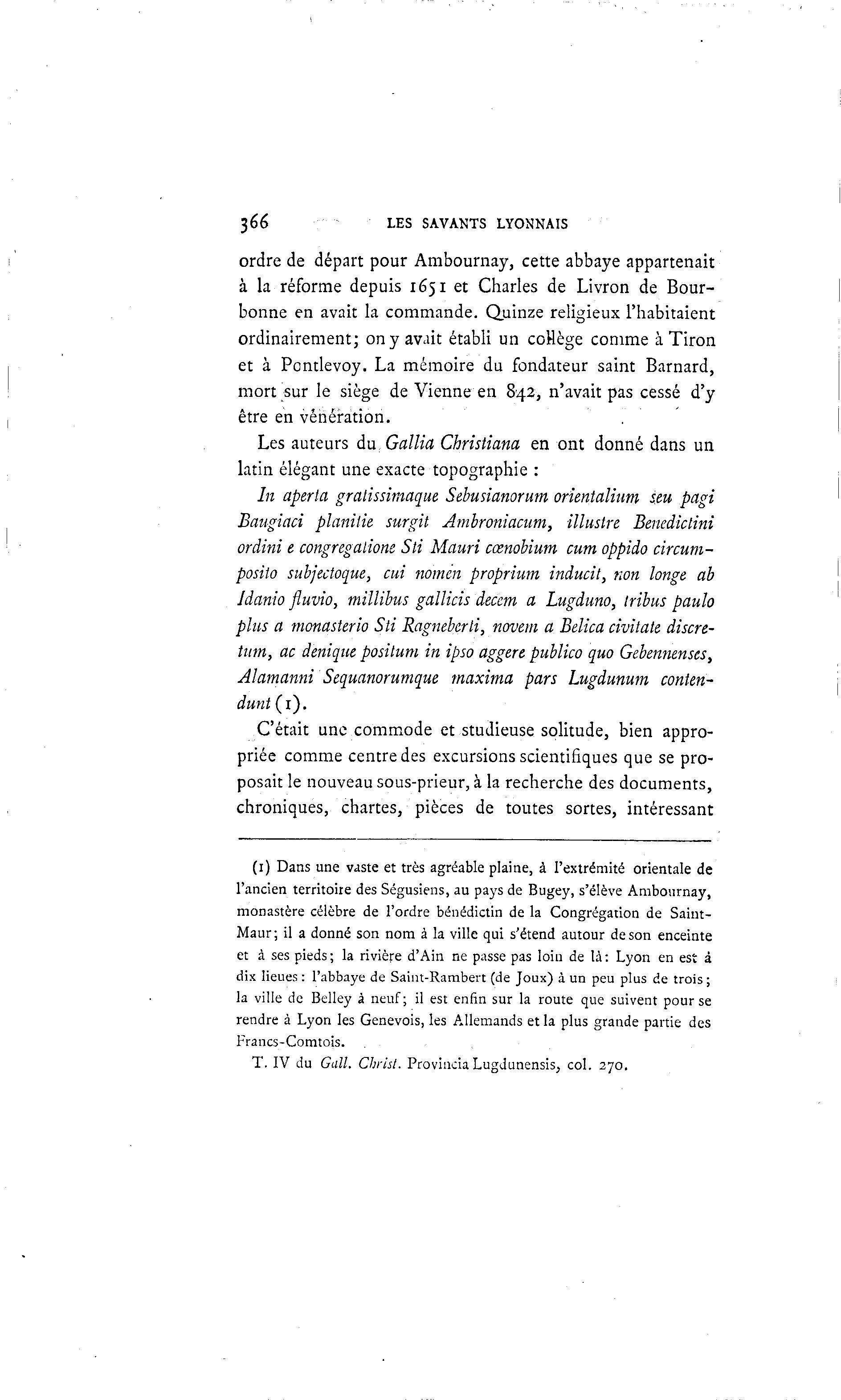 3éé LES SAVANTS LYONNAIS ordre de départ pour Ambournay, cette abbaye appartenait à la réforme depuis 1651 et Charles de Livron de Bour- bonne en avait la commande. Quinze religieux l'habitaient ordinairement; on y avait établi un coHège comme à Tiron et à Pcntlevoy. La mémoire du fondateur saint Barnard, mort sur le siège de Vienne en 842, n'avait pas cessé d'y être en vénération. Les auteurs du; Gallia Christiana en ont donné dans un latin élégant une exacte topographie : In aperta gralissimaque Sebusianorum orientalium ieu pagi Baugiaci planifie surgit Ambroniacum, illustre Benediclini ordini e congregalione Sti Mauri cœnobium cum oppido circum- posito subjectoque, cui nomen proprium inducit, non longe ab Idanio fluvio, millibus gallicis decem a Lugduno, tribus paulo plus a monasterio Sti Ragneberti, novem a Belica civitate discre- titm, ac denique positum in ipso aggere publico quo Gebennenses, Alamanni Sequanorumque maxima pars Lugdunum conten- dunt(i). C'était une commode et studieuse solitude, bien appro- priée comme centre des excursions scientifiques que se pro- posait le nouveau sous-prieur, à la recherche des documents, chroniques, chartes, pièces de toutes sortes, intéressant (1) Dans une vaste et très agréable plaine, à l'extrémité orientale de l'ancien territoire des Ségusiens, au pays de Bugey, s'élève Ambournay, monastère célèbre de l'ordre bénédictin de la Congrégation de Saint- Maur; il a donné son nom à la ville qui s'étend autour de son enceinte et à ses pieds ; la rivière d'Ain ne passe pas loin de là : Lyon en est à dix lieues : l'abbaye de Saint-Rambert (de Joux) à un peu plus de trois ; la ville de Belley à neuf; il est enfin sur la route que suivent pour se rendre à Lyon les Genevois, les Allemands et la plus grande partie des Francs-Comtois. T. IV du Gail. Christ. Provincia Lugdunensis, col. 270.