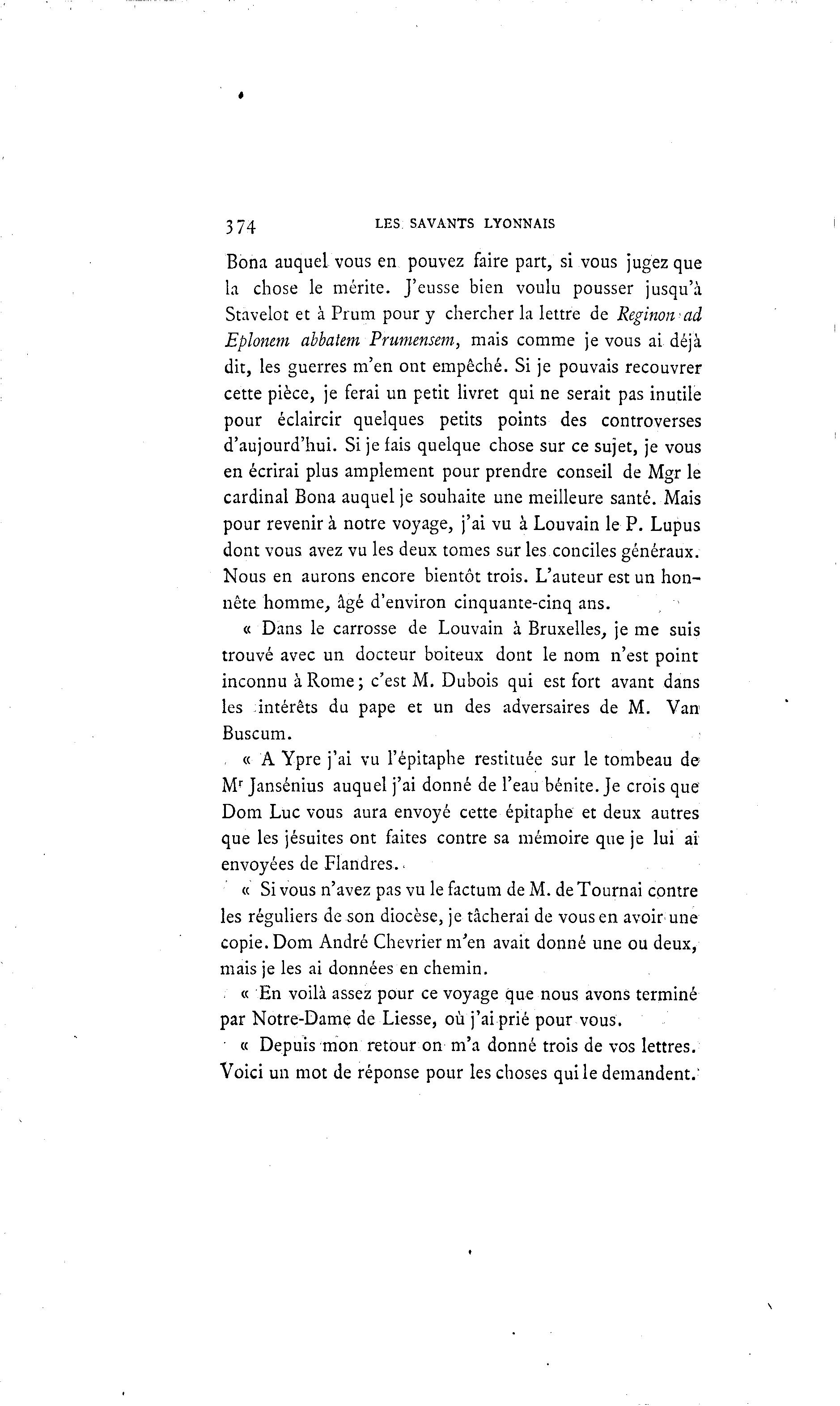t 3 74 LES SAVANTS LYONNAIS Bona auquel vous en pouvez faire part, si vous jugez que la chose le mérite. J'eusse bien voulu pousser jusqu'à Stavelot et à Prum pour y chercher la lettre de Reginonad Eplonem abbatem Prumensem, mais comme je vous ai déjà dit, les guerres m'en ont empêché. Si je pouvais recouvrer cette pièce, je ferai un petit livret qui ne serait pas inutile pour éclaircir quelques petits points des controverses d'aujourd'hui. Si je fais quelque chose sur ce sujet, je vous en écrirai plus amplement pour prendre conseil de Mgr le cardinal Bona auquel je souhaite une meilleure santé. Mais pour revenir à notre voyage, j'ai vu à Louvain le P. Lupus dont vous avez vu les deux tomes sur les conciles généraux. Nous en aurons encore bientôt trois. L'auteur est un hon- nête homme, âgé d'environ cinquante-cinq ans. « Dans le carrosse de Louvain à Bruxelles, je me suis trouvé avec un docteur boiteux dont le nom n'est point inconnu à Rome; c'est M. Dubois qui est fort avant dans les intérêts du pape et un des adversaires de M. Van Buscum. - « A Ypre j'ai vu l'épitaphe restituée sur le tombeau de Mr Jansénius auquel j'ai donné de l'eau bénite. Je crois que Dom Luc vous aura envoyé cette épitaphe et deux autres que les jésuites ont faites contre sa mémoire que je lui ai envoyées de Flandres.. « Si vous n'avez pas vu le factura de M. de Tournai contre les réguliers de son diocèse, je tâcherai de vous en avoir une copie. Dom André Chevrier m'en avait donné une ou deux, mais je les ai données en chemin. « En voilà assez pour ce voyage que nous avons terminé par Notre-Dame de Liesse, où j'ai prié pour vous. « Depuis mon retour on m'a donné trois de vos lettres. Voici un mot de réponse pour les choses qui le demandent."