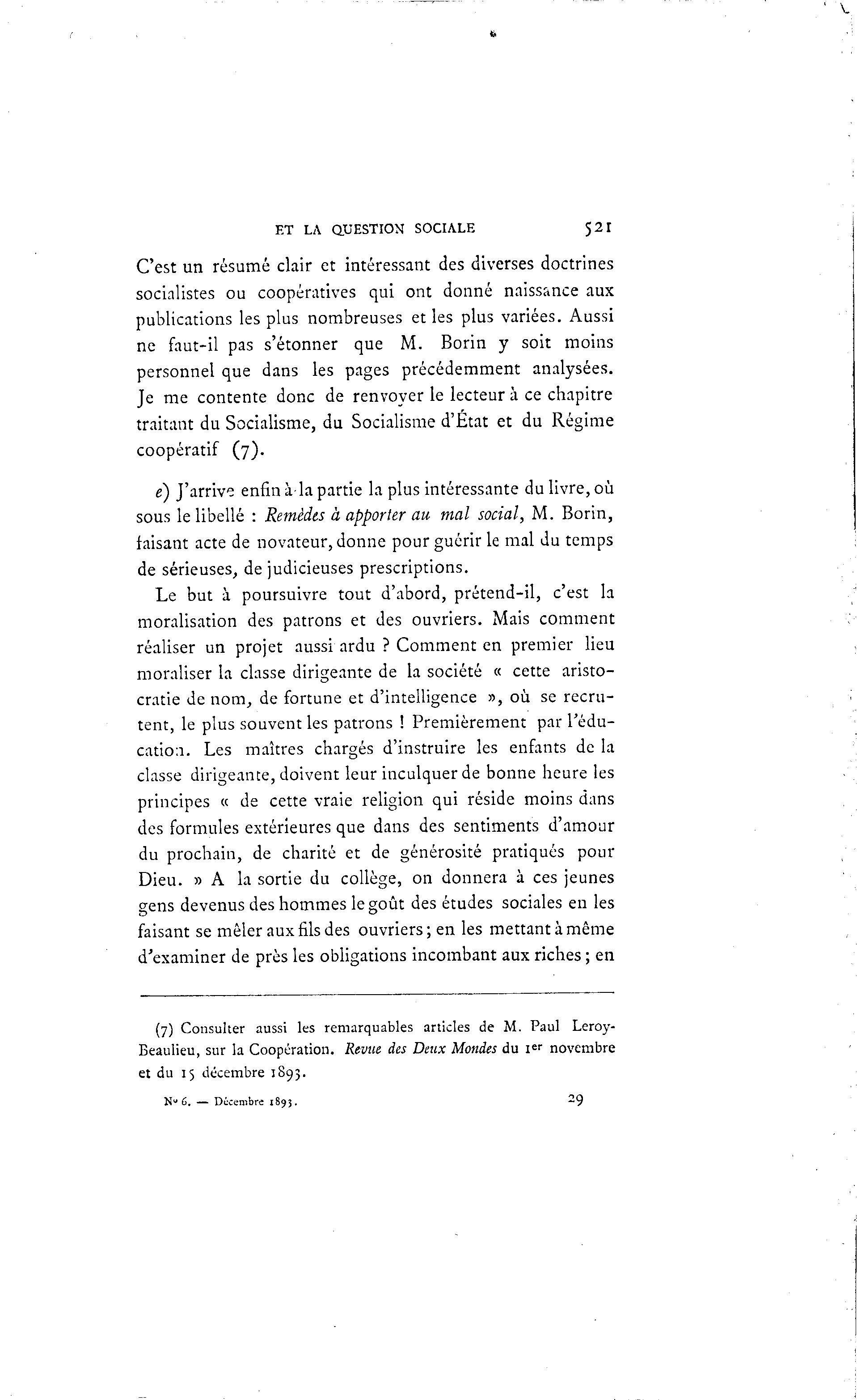 ET LA QUESTION SOCIALE 521 C'est un résumé clair et intéressant des diverses doctrines socialistes ou coopératives qui ont donné naissance aux publications les plus nombreuses et les plus variées. Aussi ne faut-il pas s'étonner que M. Borin y soit moins personnel que dans les pages précédemment analysées. Je me contente donc de renvoyer le lecteur à ce chapitre traitant du Socialisme, du Socialisme d'Etat et du Régime coopératif (7). e) J'arrive enfin à -la partie la plus intéressante du livre, où sous le libellé : Remèdes à apporter au mal social, M. Borin, faisant acte de novateur, donne pour guérir le mal du temps de sérieuses, de judicieuses prescriptions. Le but à poursuivre tout d'abord, prétend-il, c'est la moralisation des patrons et des ouvriers. Mais comment réaliser un projet aussi ardu ? Comment en premier lieu moraliser la classe dirigeante de la société « cette aristo- cratie de nom, de fortune et d'intelligence », où se recru- tent, le plus souvent les patrons ! Premièrement par l'édu- cation. Les maîtres chargés d'instruire les enfants de la classe dirigeante, doivent leur inculquer de bonne heure les principes « de cette vraie religion qui réside moins dans des formules extérieures que dans des sentiments d'amour du prochain, de charité et de générosité pratiqués pour Dieu. » A la sortie du collège, on donnera à ces jeunes gens devenus des hommes le goût des études sociales en les faisant se mêler aux fils des ouvriers; en les mettant à même d'examiner de près les obligations incombant aux riches ; en (7) Consulter aussi les remarquables articles de M. Paul Leroy- Beaulieu, sur la Coopération. Revue des Deux Mondes du I e r novembre et du 15 décembre 1893. N " 6. — Décembre 1895. 29