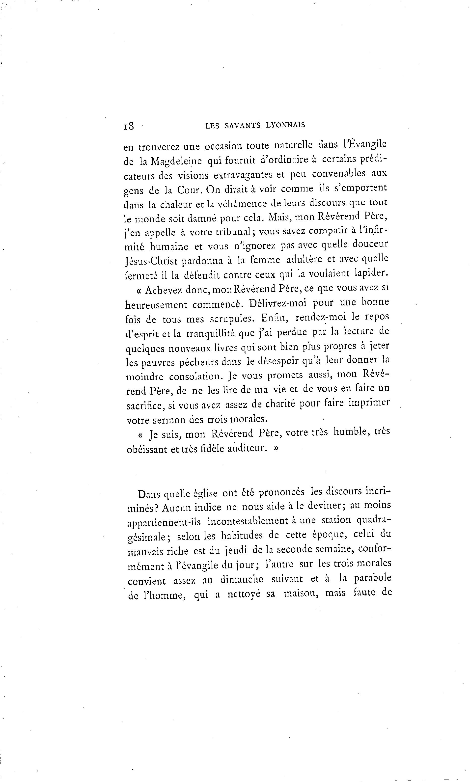 i8 LES SAVANTS LYONNAIS en trouverez une occasion toute naturelle dans l'Évangile de la Magdeleine qui fournit d'ordinaire à certains prédi- cateurs des visions extravagantes et peu convenables aux gens de la Cour. On dirait à voir comme ils s'emportent dans la chaleur et la véhémence de leurs discours que tout le monde soit damné pour cela. Mais, mon Révérend Père, j'en appelle à votre tribunal; vous savez compatir à l'infir- mité humaine et vous n'ignorez pas avec quelle douceur Jésus-Christ pardonna à la femme adultère et avec quelle fermeté il la défendit contre ceux qui la voulaient lapider. « Achevez donc, mon Révérend Père, ce que vous avez si heureusement commencé. Délivrez-moi pour une bonne fois de tous mes scrupules. Enfin, rendez-moi le repos d'esprit et la tranquillité que j'ai perdue par la lecture de quelques nouveaux livres qui sont bien plus propres à jeter les pauvres pécheurs dans le désespoir qu'à leur donner la moindre consolation. Je vous promets aussi, mon Révé- rend Père, de ne les lire de ma vie et de vous en faire un sacrifice, si vous avez assez de charité pour faire imprimer votre sermon des trois morales. « Je suis, mon Révérend Père, votre très humble, très obéissant et très fidèle auditeur. » Dans quelle église ont été prononcés les discours incri- minés? Aucun indice ne nous aide à le deviner; au moins appartiennent-ils incontestablement à une station quadra- gésimale; selon les habitudes de cette époque, celui du mauvais riche est du jeudi de la seconde semaine, confor- mément à l'évangile du jour; l'autre sur les trois morales convient assez au dimanche suivant et à la parabole de l'homme, qui a nettoyé sa maison, mais faute de
