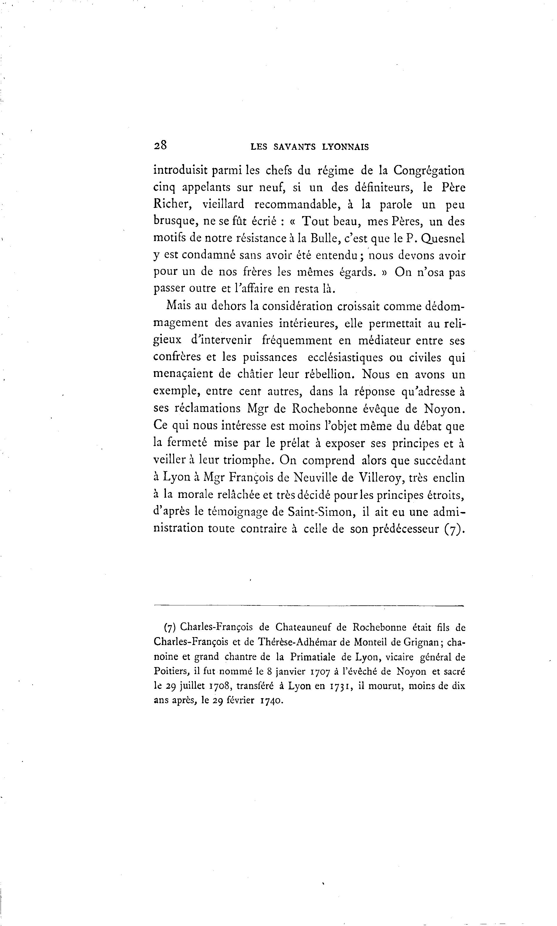 28 LES SAVANTS LYONNAIS introduisit parmi les chefs du régime de la Congrégation cinq appelants sur neuf, si un des défmiteurs, le Père Richer, vieillard recommandable, à la parole un peu brusque, ne se fût écrié : « Tout beau, mes Pères, un des motifs de notre résistance à la Bulle, c'est que le P. Quesnel y est condamné sans avoir été entendu ; nous devons avoir pour un de nos frères les mêmes égards. » On n'osa pas passer outre et l'affaire en resta là . Mais au dehors la considération croissait comme dédom- magement des avanies intérieures, elle permettait au reli- gieux d'intervenir fréquemment en médiateur entre ses confrères et les puissances ecclésiastiques ou civiles qui menaçaient de châtier leur rébellion. Nous en avons un exemple, entre cent autres, dans la réponse qu'adresse à ses réclamations Mgr de Rochebonne évêque de Noyon. Ce qui nous intéresse est moins l'objet même du débat que la fermeté mise par le prélat à exposer ses principes et à veiller à leur triomphe. On comprend alors que succédant à Lyon à Mgr François de Neuville de Villeroy, très enclin à la morale relâchée et très décidé pour les principes étroits, d'après le témoignage de Saint-Simon, il ait eu une admi- nistration toute contraire à celle de son prédécesseur (7). (7) Charles-François de Chateauneuf de Rochebonne était fils de Charles-François et de Thérèse-Adhéraar de Monteil de Grignan ; cha- noine et grand chantre de la Primatiale de Lyon, vicaire général de Poitiers, il fut nommé le 8 janvier 1707 à l'évêché de Noyon et sacré le 29 juillet 1708, transféré à Lyon en 1731, il mourut, moins de dix ans après, le 29 février 1740.