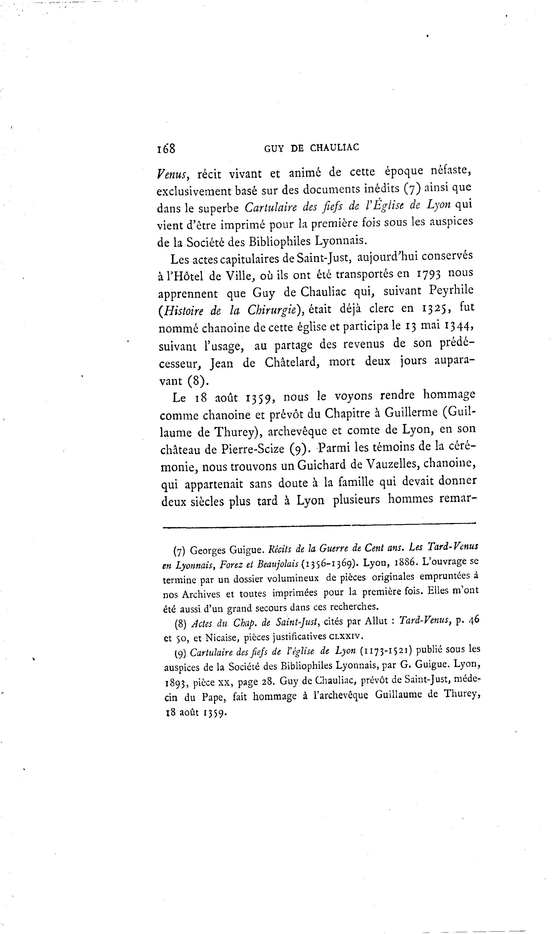 168 GUY DE CHAULUC Venus, récit vivant et animé de cette époque néfaste, exclusivement basé sur des documents inédits (7) ainsi que dans le superbe Cartulaire des fiefs de l'Eglise de Lyon qui vient d'être imprimé pour la première fois sous les auspices de la Société des Bibliophiles Lyonnais. Les actes capitulaires de Saint-Just, aujourd'hui conservés à l'Hôtel de Ville, où ils ont été transportés en 1793 nous apprennent que Guy de Chauliac qui, suivant Peyrhile (Histoire de la Chirurgie), était déjà clerc en 1325, fut nommé chanoine de cette église et participa le 13 mai 1344, suivant l'usage, au partage des revenus de son prédé- cesseur, Jean de Châtelard, mort deux jours aupara- vant (8). Le 18 août 1359, nous le voyons rendre hommage comme chanoine et prévôt du Chapitre à Guillerme (Guil- laume de Thurey), archevêque et comte de Lyon, en son château de Pierre-Scize (9). Parmi les témoins de la céré- monie, nous trouvons un Guichard de Vauzelles, chanoine, qui appartenait sans doute à la famille qui devait donner deux siècles plus tard à Lyon plusieurs hommes remar- (7) Georges Guigue. Récits de la Guerre de Cent ans. Les Tard-Venus en Lyonnais, Forez et Beaujolais (1356-1369). Lyon, 1886. L'ouvrage se termine par un dossier volumineux de pièces originales empruntées à nos Archives et toutes imprimées pour la première fois. Elles m'ont été aussi d'un grand secours dans ces recherches. (8) Actes du Chap. de Saint-Just, cités par Allut : Tard-Venus, p. 46 et 50, et Nicaise, pièces justificatives CLXXIV. (9) Cartulaire desfiefs de l'église de Lyon (1173-1521) publié sous les auspices de la Société des Bibliophiles Lyonnais, par G. Guigue. Lyon, 1893, pièce xx, page 28. Guy de Chauliac, prévôt de Saint-Just, méde- cin du Pape, fait hommage à l'archevêque Guillaume de Thurey, 18 août 1359.