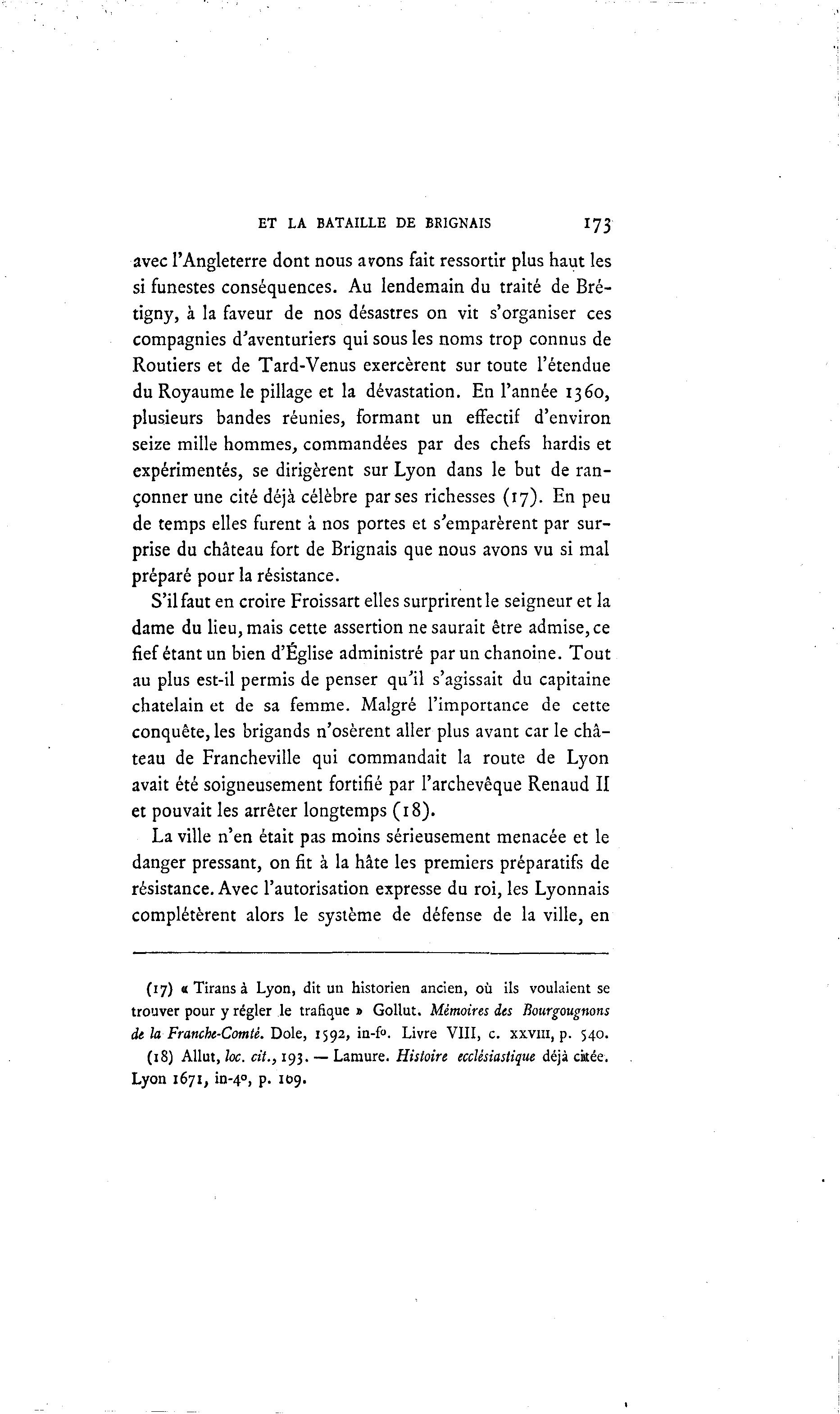 ET LA BATAILLE DE BK1GNAIS I73 avec l'Angleterre dont nous avons fait ressortir plus haut les si funestes conséquences. Au lendemain du traité de Bré- tigny, à la faveur de nos désastres on vit s'organiser ces compagnies d'aventuriers qui sous les noms trop connus de Routiers et de Tard-Venus exercèrent sur toute l'étendue du Royaume le pillage et la dévastation. En l'année 1360, plusieurs bandes réunies, formant un effectif d'environ seize mille hommes, commandées par des chefs hardis et expérimentés, se dirigèrent sur Lyon dans le but de ran- çonner une cité déjà célèbre par ses richesses (17). En peu de temps elles furent à nos portes et s'emparèrent par sur- prise du château fort de Brignais que nous avons vu si mal préparé pour la résistance. S'il faut en croire Froissart elles surprirent le seigneur et la dame du lieu, mais cette assertion ne saurait être admise, ce fief étant un bien d'Église administré par un chanoine. Tout au plus est-il permis de penser qu'il s'agissait du capitaine châtelain et de sa femme. Malgré l'importance de cette conquête, les brigands n'osèrent aller plus avant car le châ- teau de Francheville qui commandait la route de Lyon avait été soigneusement fortifié par l'archevêque Renaud II et pouvait les arrêter longtemps (18). La ville n'en était pas moins sérieusement menacée et le danger pressant, on fit à la hâte les premiers préparatifs de résistance. Avec l'autorisation expresse du roi, les Lyonnais complétèrent alors le système de défense de la ville, en (17) « Tirans à Lyon, dit un historien ancien, où ils voulaient se trouver pour y régler le trafique » Gollut. Mémoires des Bourgougnons de la Franche-Comté. Dole, 1592, in-R Livre VIII, c. xxvni, p. 540. (18) Allut, toc. cit., 193. — Lamure. Histoire ecclésiastique déjà citée. Lyon 1671, in-40, p. 109.