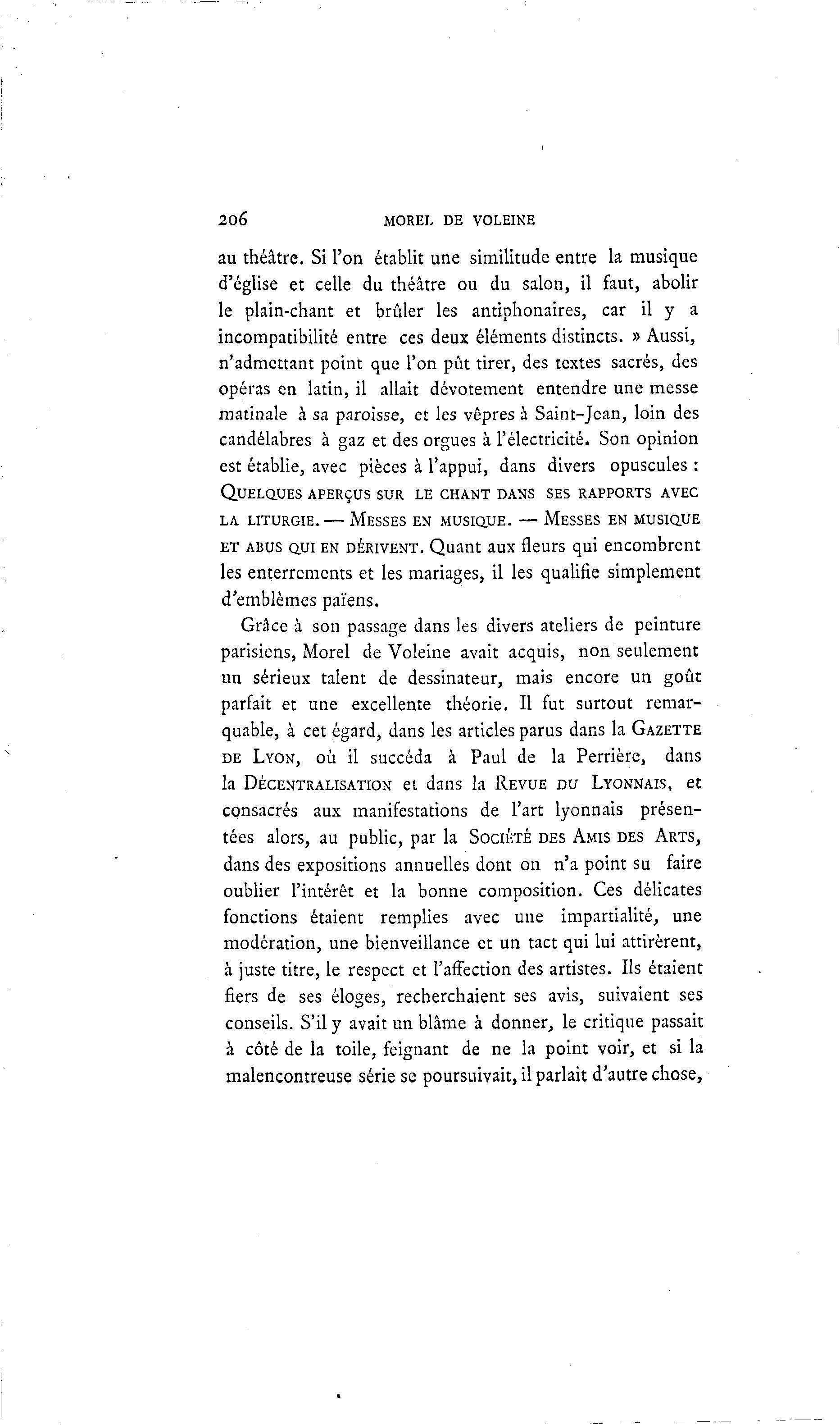 206 MOREL DE VOLEINE au théâtre. Si l'on établit une similitude entre la musique d'église et celle du théâtre ou du salon, il faut, abolir le plain-chant et brûler les antiphonaires, car il y a incompatibilité entre ces deux éléments distincts. » Aussi, n'admettant point que l'on pût tirer, des textes sacrés, des opéras en latin, il allait dévotement entendre une messe matinale à sa paroisse, et les vêpres à Saint-Jean, loin des candélabres à gaz et des orgues à l'électricité. Son opinion est établie, avec pièces à l'appui, dans divers opuscules : QUELQUES APERÇUS SUR LE CHANT DANS SES RAPPORTS AVEC LA LITURGIE. — MESSES EN MUSIQUE. — MESSES EN MUSIQUE ET ABUS QUI EN DÉRIVENT. Quant aux fleurs qui encombrent les enterrements et les mariages, il les qualifie simplement d'emblèmes païens. Grâce à son passage dans les divers ateliers de peinture parisiens, Morel de Voleine avait acquis, non seulement un sérieux talent de dessinateur, mais encore un goût parfait et une excellente théorie. Il fut surtout remar- quable, à cet égard, dans les articles parus dans la GAZETTE DE LYON, OÙ il succéda à Paul de la Perrière, dans la DÉCENTRALISATION et dans la REVUE DU LYONNAIS, et consacrés aux manifestations de l'art lyonnais présen- tées alors, au public, par la SOCIÉTÉ DES AMIS DES ARTS, dans des expositions annuelles dont on n'a point su faire oublier l'intérêt et la bonne composition. Ces délicates fonctions étaient remplies avec une impartialité, une modération, une bienveillance et un tact qui lui attirèrent, à juste titre, le respect et l'affection des artistes. Ils étaient fiers de ses éloges, recherchaient ses avis, suivaient ses conseils. S'il y avait un blâme à donner, le critique passait à côté de la toile, feignant de ne la point voir, et si la malencontreuse série se poursuivait, il parlait d'autre chose,