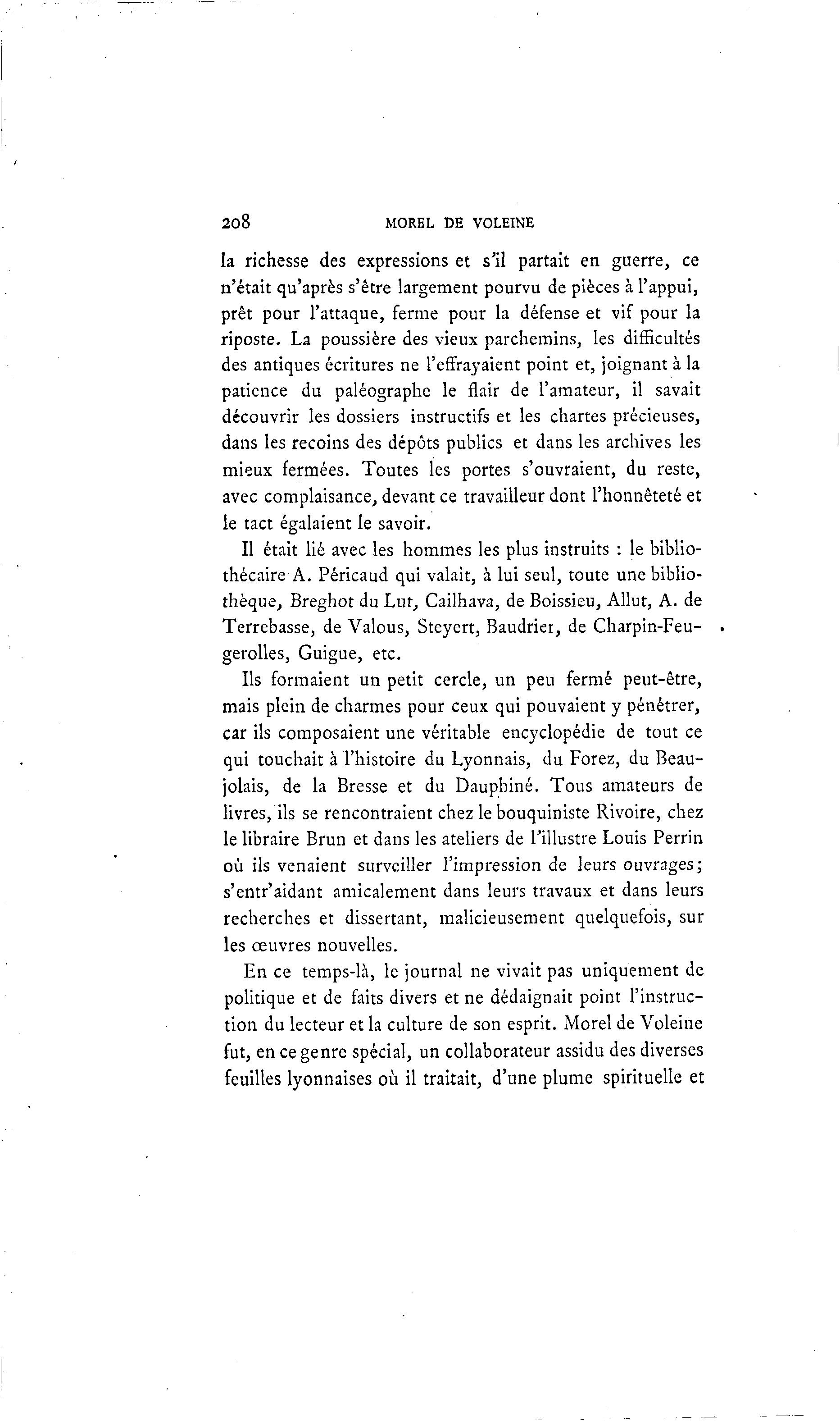 208 MOREL DE VOLEINE la richesse des expressions et s'il partait en guerre, ce n'était qu'après s'être largement pourvu de pièces à l'appui, prêt pour l'attaque, ferme pour la défense et vif pour la riposte. La poussière des vieux parchemins, les difficultés des antiques écritures ne l'effrayaient point et, joignant à la patience du paléographe le flair de l'amateur, il savait découvrir les dossiers instructifs et les chartes précieuses, dans les recoins des dépôts publics et dans les archives les mieux fermées. Toutes les portes s'ouvraient, du reste, avec complaisance, devant ce travailleur dont l'honnêteté et le tact égalaient le savoir. Il était lié avec les hommes les plus instruits : le biblio- thécaire A. Péricaud qui valait, à lui seul, toute une biblio- thèque, Breghot du Lut, Cailhava, de Boissieu, Allut, A. de Terrebasse, de Valous, Steyert, Baudrier, de Charpin-Feu- gerolles, Guigue, etc. Ils formaient un petit cercle, un peu fermé peut-être, mais plein de charmes pour ceux qui pouvaient y pénétrer, car ils composaient une véritable encyclopédie de tout ce qui touchait à l'histoire du Lyonnais, du Forez, du Beau- jolais, de la Bresse et du Daupbiné. Tous amateurs de livres, ils se rencontraient chez le bouquiniste Rivoire, chez le libraire Brun et dans les ateliers de l'illustre Louis Perrin où ils venaient surveiller l'impression de leurs ouvrages; s'entr'aidant amicalement dans leurs travaux et dans leurs recherches et dissertant, malicieusement quelquefois, sur les œuvres nouvelles. En ce temps-là , le journal ne vivait pas uniquement de politique et de faits divers et ne dédaignait point l'instruc- tion du lecteur et la culture de son esprit. Morel de Voleine fut, en ce genre spécial, un collaborateur assidu des diverses feuilles lyonnaises où il traitait, d'une plume spirituelle et