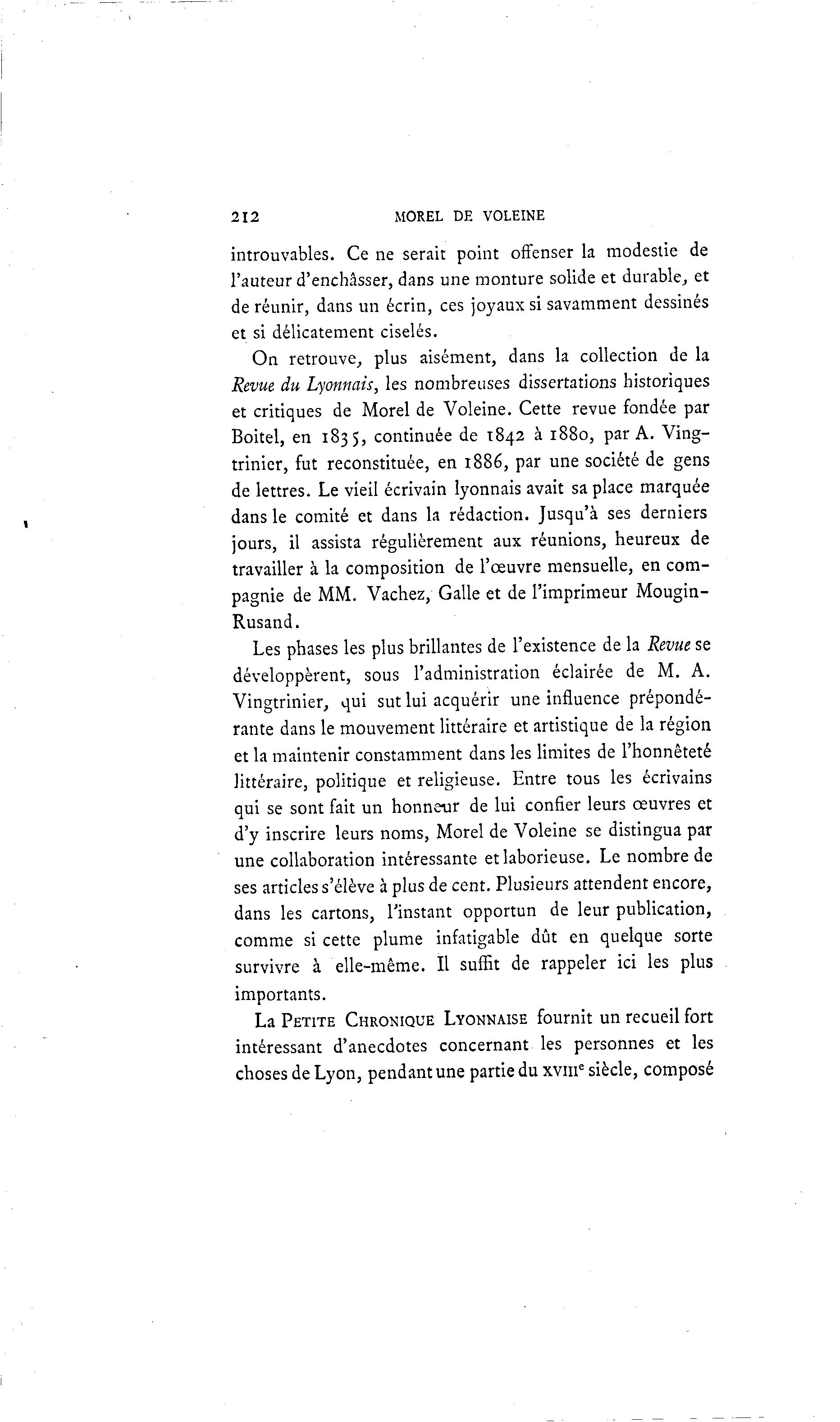 212 MOREL DE VOLEINE introuvables. Ce ne serait point offenser la modestie de l'auteur d'enchâsser, dans une monture solide et durable, et de réunir, dans un écrin, ces joyaux si savamment dessinés et si délicatement ciselés. On retrouve, plus aisément, dans la collection de la Revue du Lyonnais, les nombreuses dissertations historiques et critiques de Morel de Voleine. Cette revue fondée par Boitel, en 1835, continuée de 1842 à 1880, par A. Ving- trinier, fut reconstituée, en 1886, par une société de gens de lettres. Le vieil écrivain lyonnais avait sa place marquée dans le comité et dans la rédaction. Jusqu'à ses derniers jours, il assista régulièrement aux réunions, heureux de travailler à la composition de l'œuvre mensuelle, en com- pagnie de MM. Vachez, Galle et de l'imprimeur Mougin- Rusand. Les phases les plus brillantes de l'existence de la Revue se développèrent, sous l'administration éclairée de M. A. Vingtrinier, qui sut lui acquérir une influence prépondé- rante dans le mouvement littéraire et artistique de la région et la maintenir constamment dans les limites de l'honnêteté littéraire, politique et religieuse. Entre tous les écrivains qui se sont fait un honneur de lui confier leurs œuvres et d'y inscrire leurs noms, Morel de Voleine se distingua par une collaboration intéressante et laborieuse. Le nombre de ses articles s'élève à plus de cent. Plusieurs attendent encore, dans les cartons, l'instant opportun de leur publication, comme si cette plume infatigable dût en quelque sorte survivre à elle-même. Il suffit de rappeler ici les plus importants. La PETITE CHRONIQUE LYONNAISE fournit un recueil fort intéressant d'anecdotes concernant les personnes et les choses de Lyon, pendant une partie du xvm e siècle, composé