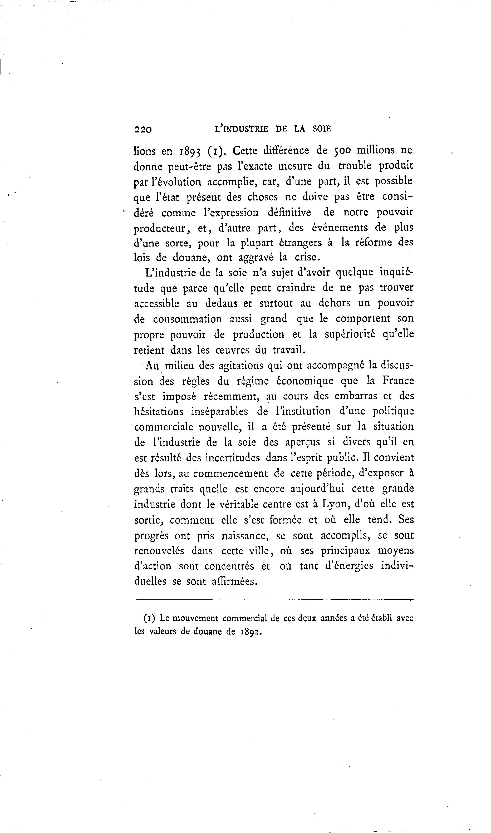 220 L'INDUSTRIE DE LA SOIE lions en 1893 (1). Cette différence de 500 millions ne donne peut-être pas l'exacte mesure du trouble produit par l'évolution accomplie, car, d'une part, il est possible que l'état présent des choses ne doive pas être consi- déré comme l'expression définitive de notre pouvoir producteur, et, d'autre part, des événements de plus d'une sorte, pour la plupart étrangers à la réforme des lois de douane, ont aggravé la crise. L'industrie de la soie n'a sujet d'avoir quelque inquié- tude que parce qu'elle peut craindre de ne pas trouver accessible au dedans et surtout au dehors un pouvoir de consommation aussi grand que le comportent son propre pouvoir de production et la supériorité qu'elle retient dans les œuvres du travail. Au milieu des agitations qui ont accompagné la discus- sion des règles du régime économique que la France s'est imposé récemment, au cours des embarras et des hésitations inséparables de l'institution d'une politique commerciale nouvelle, il a été présenté sur la situation de l'industrie de la soie des aperçus si divers qu'il en est résulté des incertitudes dans l'esprit public. Il convient dès lors, au commencement de cette période, d'exposer à grands traits quelle est encore aujourd'hui cette grande industrie dont le véritable centre est à Lyon, d'où elle est sortie, comment elle s'est formée et où elle tend. Ses progrès ont pris naissance, se sont accomplis, se sont renouvelés dans cette ville, où ses principaux moyens d'action sont concentrés et où tant d'énergies indivi- duelles se sont affirmées. (1) Le mouvement commercial de ces deux années a été établi avec les valeurs de douane de 1892.