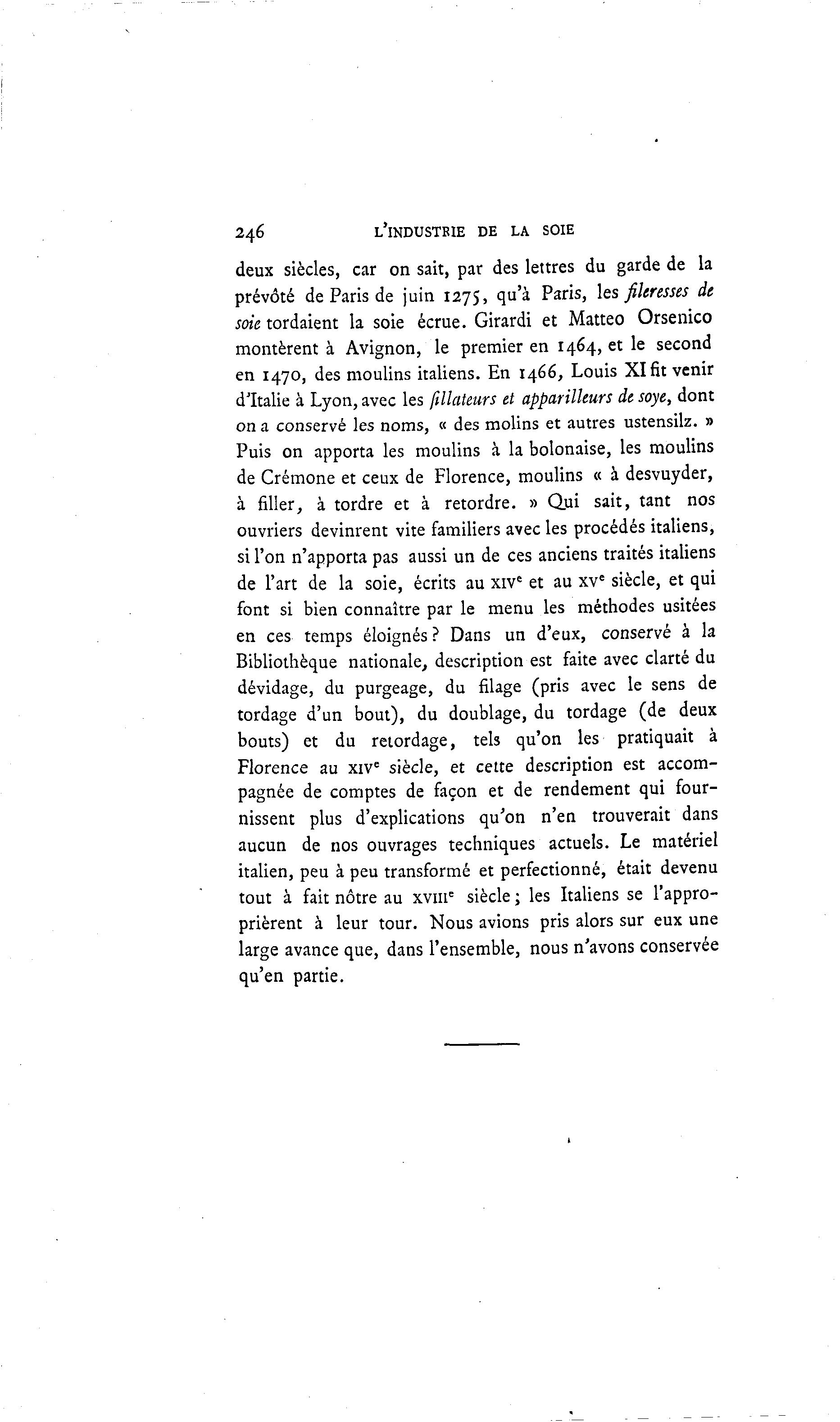 246 L'INDUSTRIE DE LA SOIE deux siècles, car on sait, par des lettres du garde de la prévôté de Paris de juin 1275, qu'à Paris, lesfikressesde soie tordaient la soie écrue. Girardi et Matteo Orsenico montèrent à Avignon, le premier en 1464, et le second en 1470, des moulins italiens. En 1466, Louis XI fit venir d'Italie à Lyon, avec lesfillateurset apparilkurs de soye, dont on a conservé les noms, « des molins et autres ustensilz. » Puis on apporta les moulins à la bolonaise, les moulins de Crémone et ceux de Florence, moulins « à desvuyder, à filler, à tordre et à retordre. » Qui sait, tant nos ouvriers devinrent vite familiers avec les procédés italiens, si l'on n'apporta pas aussi un de ces anciens traités italiens de l'art de la soie, écrits au xive et au xve siècle, et qui font si bien connaître par le menu les méthodes usitées en ces temps éloignés? Dans un d'eux, conservé à la Bibliothèque nationale, description est faite avec clarté du dévidage, du purgeage, du filage (pris avec le sens de tordage d'un bout), du doublage, du tordage (de deux bouts) et du retordage, tels qu'on les pratiquait à Florence au xive siècle, et cette description est accom- pagnée de comptes de façon et de rendement qui four- nissent plus d'explications qu'on n'en trouverait dans aucun de nos ouvrages techniques actuels. Le matériel italien, peu à peu transformé et perfectionné, était devenu tout à fait nôtre au xvnr siècle ; les Italiens se l'appro- prièrent à leur tour. Nous avions pris alors sur eux une large avance que, dans l'ensemble, nous n'avons conservée qu'en partie.