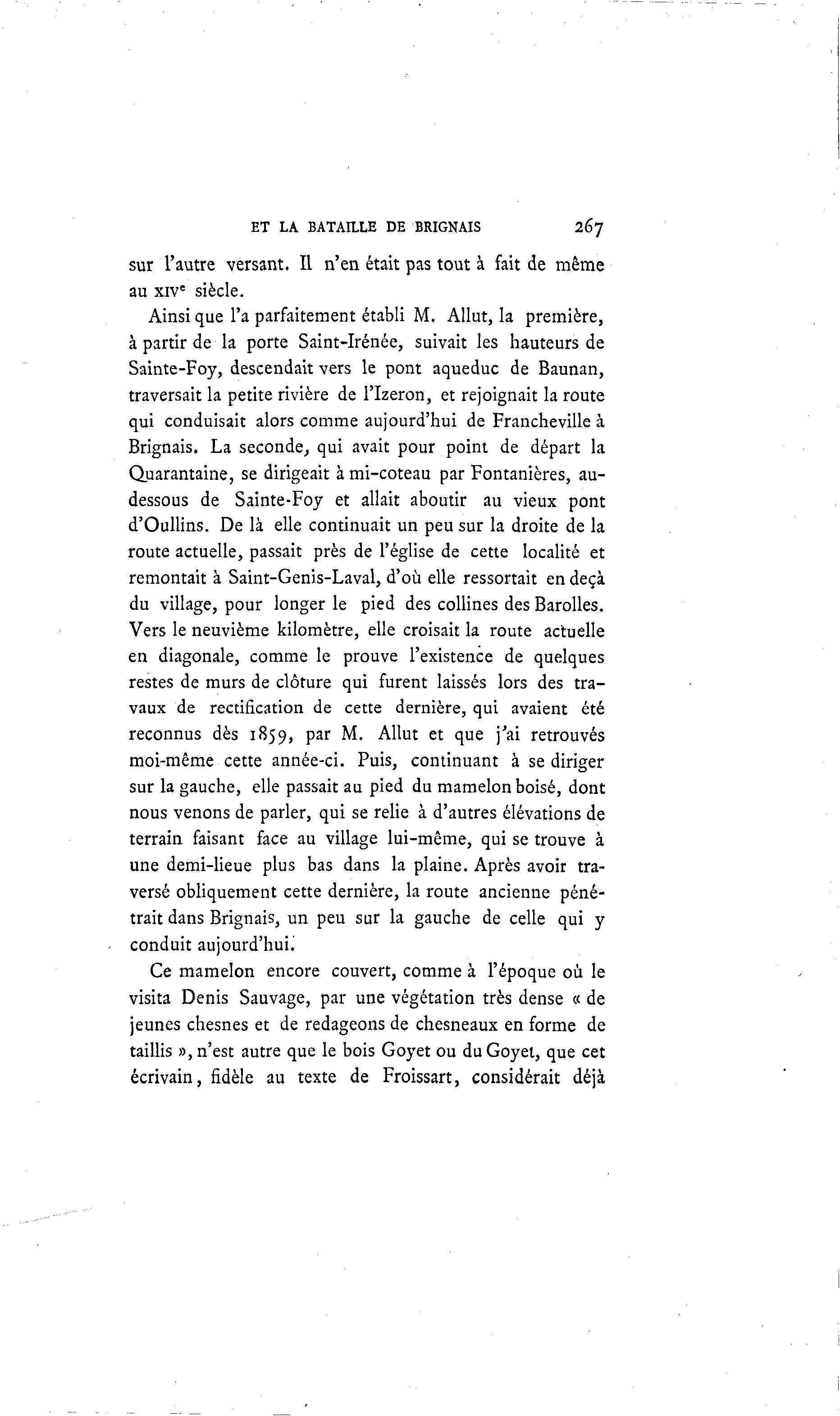 ET LA BATAILLE DE BRIGNAIS 267 sur l'autre versant. Il n'en était pas tout à fait de même au xive siècle. Ainsi que l'a parfaitement établi M. Allut, la première, à partir de la porte Saint-Irénée, suivait les hauteurs de Sainte-Foy, descendait vers le pont aqueduc de Baunan, traversait la petite rivière de l'Izeron, et rejoignait la route qui conduisait alors comme aujourd'hui de Francheville à Brignais. La seconde, qui avait pour point de départ la Quarantaine, se dirigeait à mi-coteau par Fontanières, au- dessous de Sainte-Foy et allait aboutir au vieux pont d'Oullins. De là elle continuait un peu sur la droite de la route actuelle, passait près de l'église de cette localité et remontait à Saint-Genis-Laval, d'où elle ressortait en deçà du village, pour longer le pied des collines des Barolles. Vers le neuvième kilomètre, elle croisait la route actuelle en diagonale, comme le prouve l'existence de quelques restes de murs de clôture qui furent laissés lors des tra- vaux de rectification de cette dernière, qui avaient été reconnus dès 1859, par M. Allut et que j'ai retrouvés moi-même cette année-ci. Puis, continuant à se diriger sur la gauche, elle passait au pied du mamelon boisé, dont nous venons de parler, qui se relie à d'autres élévations de terrain faisant face au village lui-même, qui se trouve à une demi-lieue plus bas dans la plaine. Après avoir tra- versé obliquement cette dernière, la route ancienne péné- trait dans Brignais, un peu sur la gauche de celle qui y conduit aujourd'hui Ce mamelon encore couvert, comme à l'époque où le visita Denis Sauvage, par une végétation très dense « de jeunes chesnes et de redageons de chesneaux en forme de taillis », n'est autre que le bois Goyet ou duGoyet, que cet écrivain, fidèle au texte de Froissart, considérait déjÃ