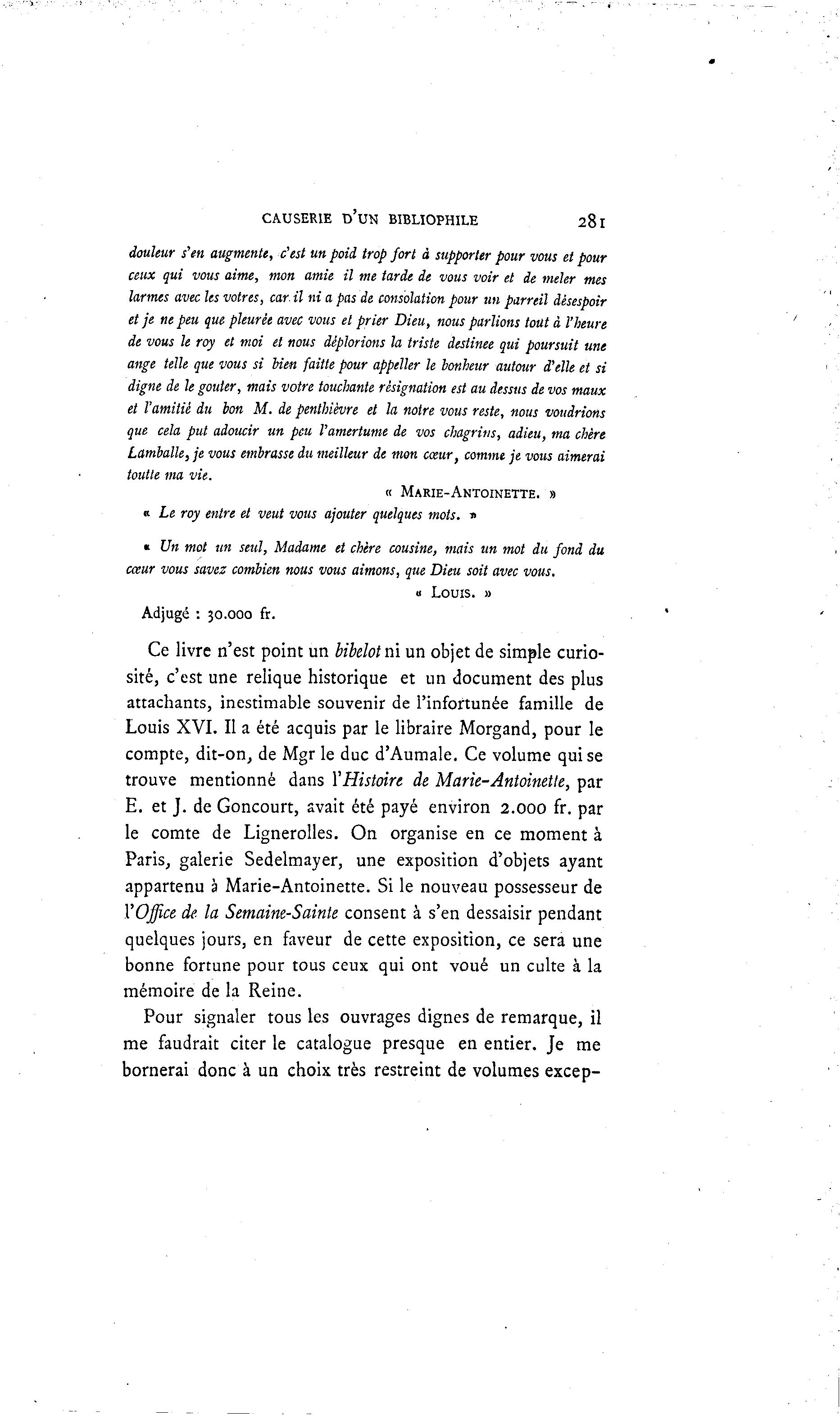 CAUSERIE D'UN BIBLIOPHILE 281 douleur s'en augmente, c'est un poid trop fort à supporter pour vous et pour ceux qui vous aime, mon amie il me tarde de vous voir et de mêler mes larmes avec les vôtres, car. il ni a pas de consolation pour un parreil désespoir et je ne peu que pleurèe avec vous et prier Dieu, nous parlions tout à l'heure de vous le roy et moi et nous déplorions la triste destinée qui poursuit une ange telle que vous si bien faitte pour appeller le bonheur autour d'elle et si digne de le goûter, mais votre touchante résignation est au dessus de vos maux et l'amitié du bon M. de penthiévre et la notre vous reste, nous voudrions que cela put adoucir un peu l'amertume de vos chagrins, adieu, ma chère Lamballe, je vous embrasse du meilleur de mon cœur, comme je vous aimerai tout le ma vie. « MARIE-ANTOINETTE. » « Le roy entre et veut vous ajouter quelques mots. » « Un mot un seul, Madame et chère cousine, mais un mot du fond du cœur vous savez combien nous vous aimons, que Dieu soit avec vous. « Louis. » Adjugé : 30.000 fr. Ce livre n'est point un bibelot m un objet de simple curio- sité, c'est une relique historique et un document des plus attachants, inestimable souvenir de l'infortunée famille de Louis XVI. Il a été acquis par le libraire Morgand, pour le compte, dit-on, de Mgr le duc d'Aumale. Ce volume qui se trouve mentionné dans YHistoire de Marie-Antoinette, par E. et J. de Goncourt, avait été payé environ 2.000 fr. par le comte de Lignerolles. On organise en ce moment à Paris, galerie Sedelmayer, une exposition d'objets ayant appartenu à Marie-Antoinette. Si le nouveau possesseur de l'Office de la Semaine-Sainte consent à s'en dessaisir pendant quelques jours, en faveur de cette exposition, ce sera une bonne fortune pour tous ceux qui ont voué un culte à la mémoire de la Reine. Pour signaler tous les ouvrages dignes de remarque, il me faudrait citer le catalogue presque en entier. Je me bornerai donc à un choix très restreint de volumes excep-