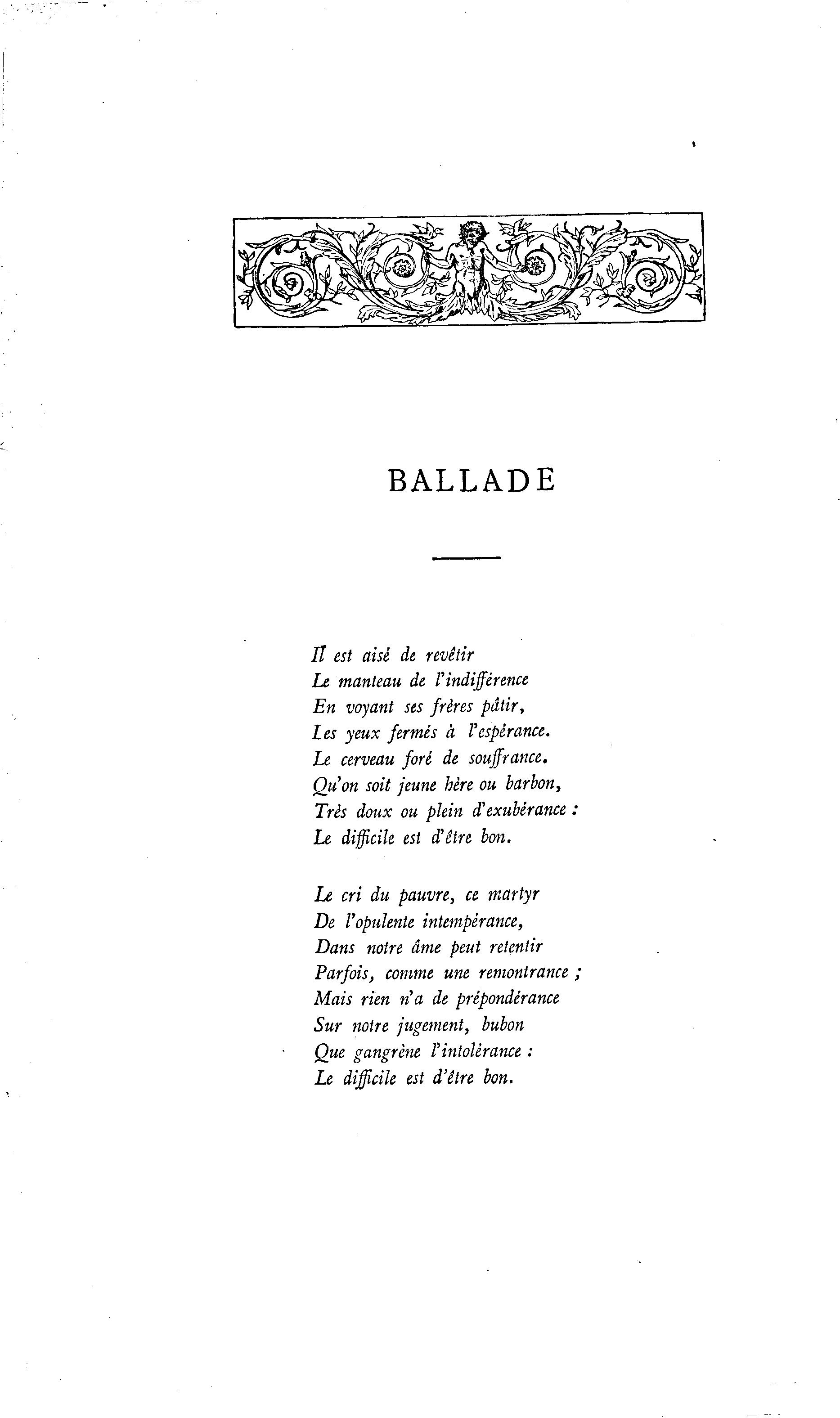 BALLADE Il est aisé de revêtir Le manteau de l'indifférence En voyant ses frères pâtir, Les yeux fermés à l'espérance. Le cerveau foré de souffrance. Qu'on soit jeune hère ou barbon, Très doux ou plein d'exubérance : Le. difficile est d'être bon. Le cri du pauvre, ce martyr De l'opulente intempérance, Dans notre âme peut retentir Parfois, comme une remontrance ; Mais rien n'a de prépondérance Sur noire jugement, bubon Que gangrène l'intolérance : Le difficile est d'être bon.