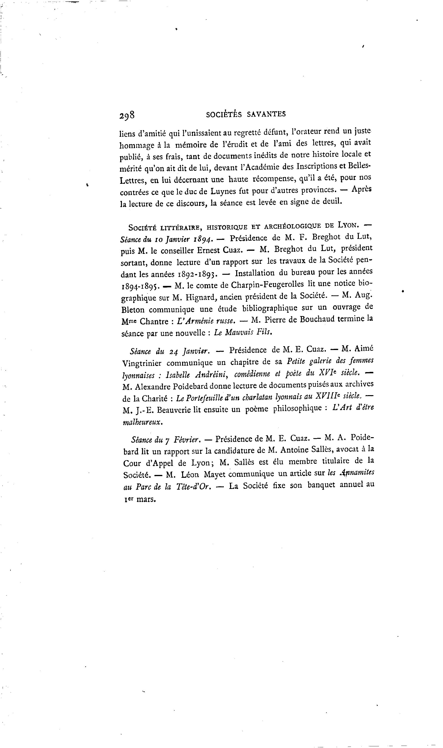 298 SOCIÉTÉS SAVANTES liens d'amitié qui l'unissaient au regretté défunt, l'orateur rend un juste hommage à la mémoire de l'érudit et de l'ami des lettres, qui avait publié, à ses frais, tant de documents inédits de notre histoire locale et mérité qu'on ait dit de lui, devant l'Académie des Inscriptions et Belles- Lettres, en lui décernant une haute récompense, qu'il a été, pour nos contrées ce que le duc de Luynes fut pour d'autres provinces. — Après la lecture de ce discours, la séance est levée en signe de deuil. SOCIÉTÉ LITTÉRAIRE, HISTORIQUE ET ARCHÉOLOGIQUE DE LYON. — Séance du 10 Janvier 1894. — Présidence de M. F. Breghot du Lut, puis M. le conseiller Ernest Cuaz. — M. Breghot du Lut, président sortant, donne lecture d'un rapport sur les travaux de la Société pen- dant les années 1892-1893. — Installation du bureau pour les années 1894-1895. — M. le comte de Charpin-Feugerolles lit une notice bio- graphique sur M. Hignard, ancien président de la Société. — M. Aug. Bleton communique une étude bibliographique sur un ouvrage de Mmc Chantre : L'Arménie russe. — M. Pierre de Bouchaud termine la séance par une nouvelle : Le Mauvais Fils. Séance du 24 Janvier. — Présidence de M. E. Cuaz. — M. Aimé Vingtrinier communique un chapitre de sa Petite galerie des femmes lyonnaises : Isabelle Andrèini, comédienne et poète du XVI* siècle. — M. Alexandre Poidebard donne lecture de documents puisés aux archives de la Charité : Le Portefeuille d'un charlatan lyonnais au XVIIIe siècle. — M. J.-E. Beauverie lit ensuite un poème philosophique : L'Art d'être malheureux. Séance du 7 Février. — Présidence de M. E. Cuaz. — M. A. Poide- bard lit un rapport sur la candidature de M. Antoine Salles, avocat à la Cour d'Appel de Lyon; M. Salles est élu membre titulaire de la Société. — M. Léon Mayet communique un article sur les Annamites au Parc de la Tête-d'Or. — La Société fixe son banquet annuel au i « mars.