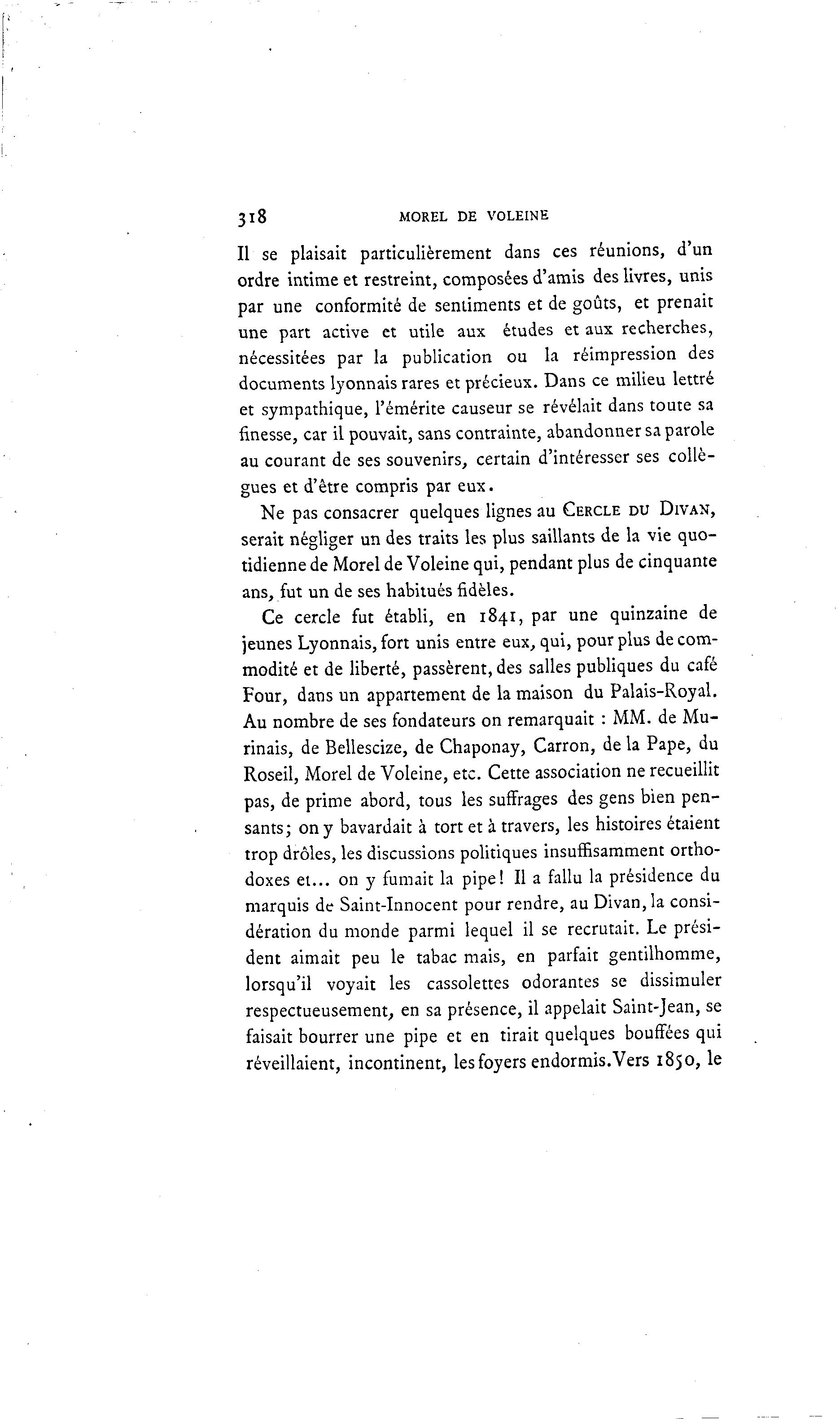 3l8 MOREL DE VOLEINE Il se plaisait particulièrement dans ces réunions, d'un ordre intime et restreint, composées d'amis des livres, unis par une conformité de sentiments et de goûts, et prenait une part active et utile aux études et aux recherches, nécessitées par la publication ou la réimpression des documents lyonnais rares et précieux. Dans ce milieu lettré et sympathique, Témérité causeur se révélait dans toute sa finesse, car il pouvait, sans contrainte, abandonner sa parole au courant de ses souvenirs, certain d'intéresser ses collè- gues et d'être compris par eux. Ne pas consacrer quelques lignes au CERCLE DU DIVAN, serait négliger un des traits les plus saillants de la vie quo- tidienne de Morel de Voleine qui, pendant plus de cinquante ans, fut un de ses habitués fidèles. Ce cercle fut établi, en 1841, par une quinzaine de jeunes Lyonnais, fort unis entre eux, qui, pour plus de com- modité et de liberté, passèrent, des salles publiques du café Four, dans un appartement de la maison du Palais-Royal. Au nombre de ses fondateurs on remarquait : MM. de Mu- rinais, de Bellescize, de Chaponay, Carron, de la Pape, du Roseil, Morel de Voleine, etc. Cette association ne recueillit pas, de prime abord, tous les suffrages des gens bien pen- sants; on y bavardait à tort et à travers, les histoires étaient trop drôles, les discussions politiques insuffisamment ortho- doxes et... on y fumait la pipe! Il a fallu la présidence du marquis de Saint-Innocent pour rendre, au Divan, la consi- dération du monde parmi lequel il se recrutait. Le prési- dent aimait peu le tabac mais, en parfait gentilhomme, lorsqu'il voyait les cassolettes odorantes se dissimuler respectueusement, en sa présence, il appelait Saint-Jean, se faisait bourrer une pipe et en tirait quelques bouffées qui réveillaient, incontinent, les foyers endormis.Vers 1850, le