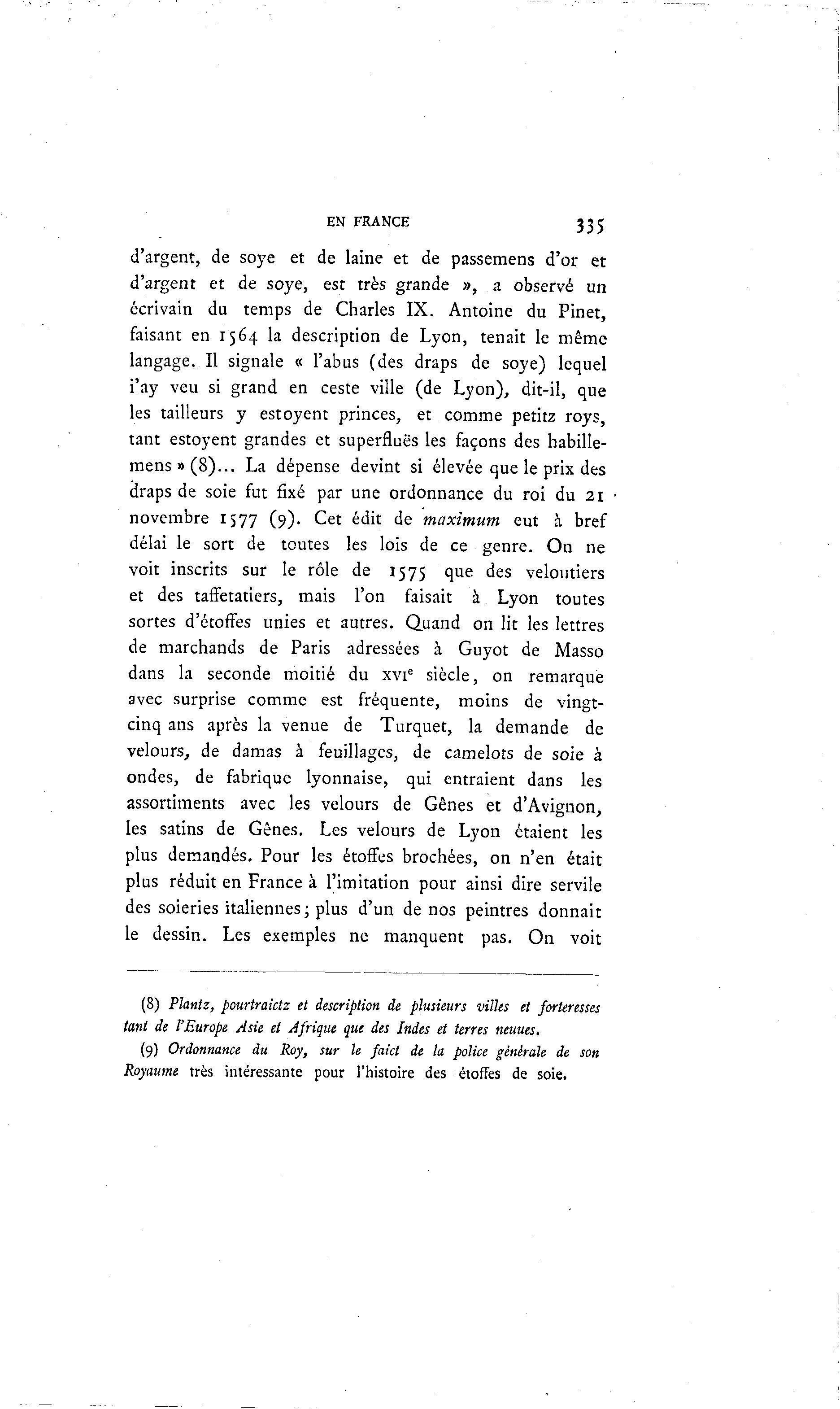 EN FRANCE 335 d'argent, de soye et de laine et de passemens d'or et d'argent et de soye, est très grande », a observé un écrivain du temps de Charles IX. Antoine du Pinet, faisant en 1564 la description de Lyon, tenait le même langage. Il signale « l'abus (des draps de soye) lequel i'ay veu si grand en ceste ville (de Lyon), dit-il, que les tailleurs y estoyent princes, et comme petitz roys, tant estoyent grandes et superflues les façons des habille- m e n s » ( 8 ) . . . La dépense devint si élevée que le prix des draps de soie fut fixé par une ordonnance du roi du 21 novembre 1577 (9). Cet édit de maximum eut à bref délai le sort de toutes les lois de ce genre. On ne voit inscrits sur le rôle de 1575 que des veloutiers et des taffetatiers, mais l'on faisait à Lyon toutes sortes d'étoffes unies et autres. Quand on lit les lettres de marchands de Paris adressées à Guyot de Masso dans la seconde moitié du xvie siècle, on remarque avec surprise comme est fréquente, moins de vingt- cinq ans après la venue de Turquet, la demande de velours, de damas à feuillages, de camelots de soie à ondes, de fabrique lyonnaise, qui entraient dans les assortiments avec les velours de Gênes et d'Avignon, les satins de Gênes. Les velours de Lyon étaient les plus demandés. Pour les étoffes brochées, on n'en était plus réduit en France à l'imitation pour ainsi dire servile des soieries italiennes ; plus d'un de nos peintres donnait le dessin. Les exemples ne manquent pas. On voit (8) Plantz, pourtraictz et description de plusieurs villes et forteresses tant de l'Europe Asie et Afrique que des Indes et terres neuues. (9) Ordonnance du Roy, sur le faict de la police générale de son Royaume très intéressante pour l'histoire des étoffes de soie.
