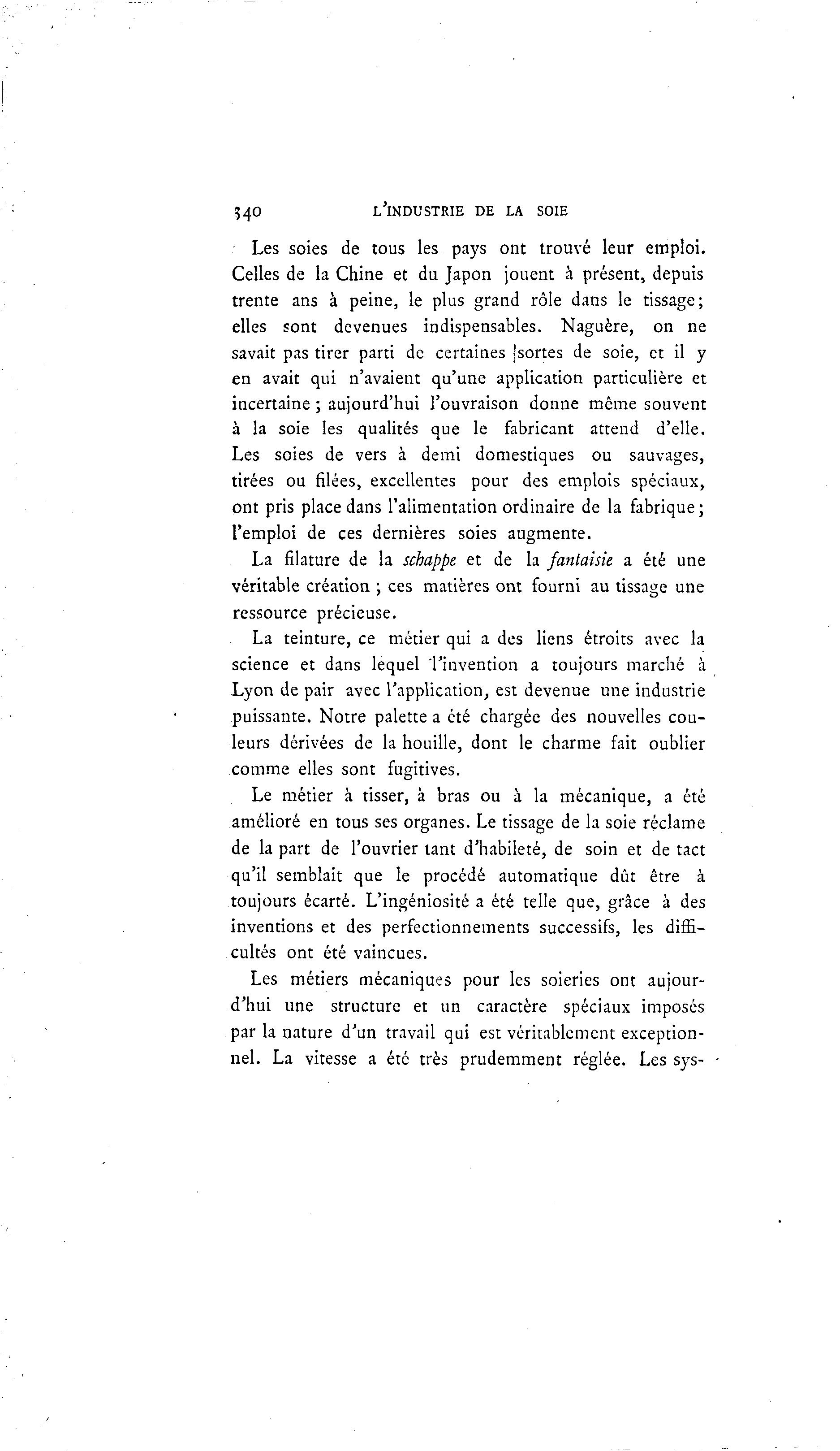 540 L'INDUSTRIE DE LA SOIE Les soies de tous les pays ont trouvé leur emploi. Celles de la Chine et du Japon jouent à présent, depuis trente ans à peine, le plus grand rôle dans le tissage; elles sont devenues indispensables. Naguère, on ne savait pas tirer parti de certaines jsortes de soie, et il y en avait qui n'avaient qu'une application particulière et incertaine ; aujourd'hui l'ouvraison donne même souvent à la soie les qualités que le fabricant attend d'elle. Les soies de vers à demi domestiques ou sauvages, tirées ou filées, excellentes pour des emplois spéciaux, ont pris place dans l'alimentation ordinaire de la fabrique; l'emploi de ces dernières soies augmente. La filature de la schappe et de la fantaisie a été une véritable création ; ces matières ont fourni au tissage une ressource précieuse. La teinture, ce métier qui a des liens étroits avec la science et dans lequel 'l'invention a toujours marché à Lyon de pair avec l'application, est devenue une industrie puissante. Notre palette a été chargée des nouvelles cou- leurs dérivées de la houille, dont le charme fait oublier comme elles sont fugitives. Le métier à tisser, à bras ou à la mécanique, a été amélioré en tous ses organes. Le tissage de la soie réclame de la part de l'ouvrier tant d'habileté, de soin et de tact qu'il semblait que le procédé automatique dût être à toujours écarté. L'ingéniosité a été telle que, grâce à des inventions et des perfectionnements successifs, les diffi- cultés ont été vaincues. Les métiers mécaniques pour les soieries ont aujour- d'hui une structure et un caractère spéciaux imposés par la nature d'un travail qui est véritablement exception- nel. La vitesse a été très prudemment réglée. Les sys-
