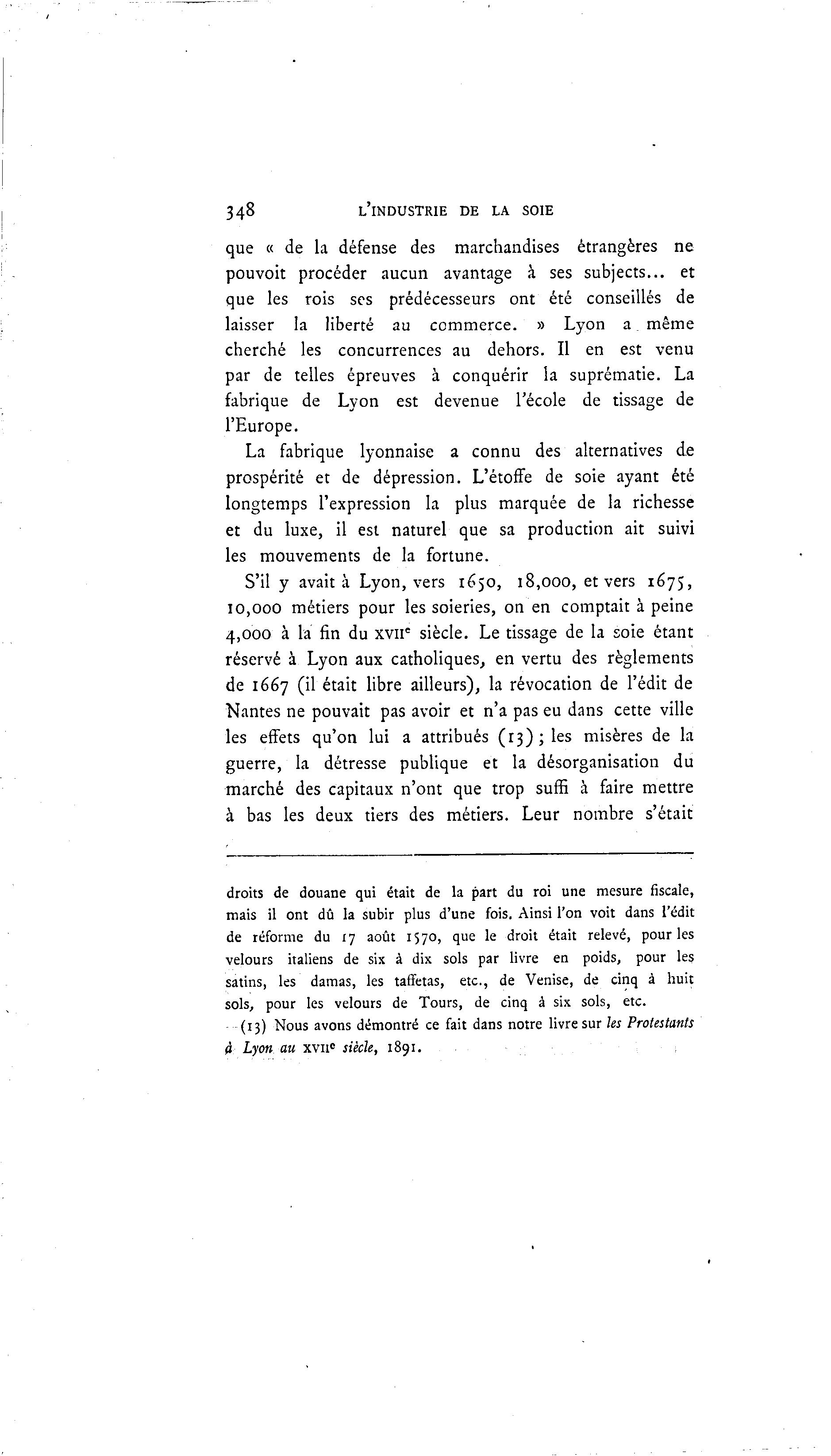 348 L'INDUSTRIE DE LA SOIE que « de la défense des marchandises étrangères ne pouvoit procéder aucun avantage à ses subjects... et que les rois ses prédécesseurs ont été conseillés de laisser la liberté au commerce. » Lyon a même cherché les concurrences au dehors. Il en est venu par de telles épreuves à conquérir la suprématie. La fabrique de Lyon est devenue l'école de tissage de l'Europe. La fabrique lyonnaise a connu des alternatives de prospérité et de dépression. L'étoffe de soie ayant été longtemps l'expression la plus marquée de la richesse et du luxe, il est naturel que sa production ait suivi les mouvements de la fortune. S'il y avait à Lyon, vers 1650, 18,000, et vers 1675, 10,000 métiers pour les soieries, on en comptait à peine 4,000 à la fin du xvn e siècle. Le tissage de la soie étant réservé à Lyon aux catholiques, en vertu des règlements de 1667 (il était libre ailleurs), la révocation de l'édit de Nantes ne pouvait pas avoir et n'a pas eu dans cette ville les effets qu'on lui a attribués (13) ; les misères de la guerre, la détresse publique et la désorganisation du marché des capitaux n'ont que trop suffi à faire mettre à bas les deux tiers des métiers. Leur nombre s'était droits de douane qui était de la part du roi une mesure fiscale, mais il ont dû la subir plus d'une fois. Ainsi l'on voit dans l'édit de réforme du 17 août 1570, que le droit était relevé, pour les velours italiens de six à dix sols par livre en poids, pour les satins, les damas, les taffetas, etc., de Venise, de cinq à huit sols, pour les velours de Tours, de cinq à six sols, etc. (13) Nous avons démontré ce fait dans notre livre sur les Protestants à Lyon au xvn° siècle, 1891.