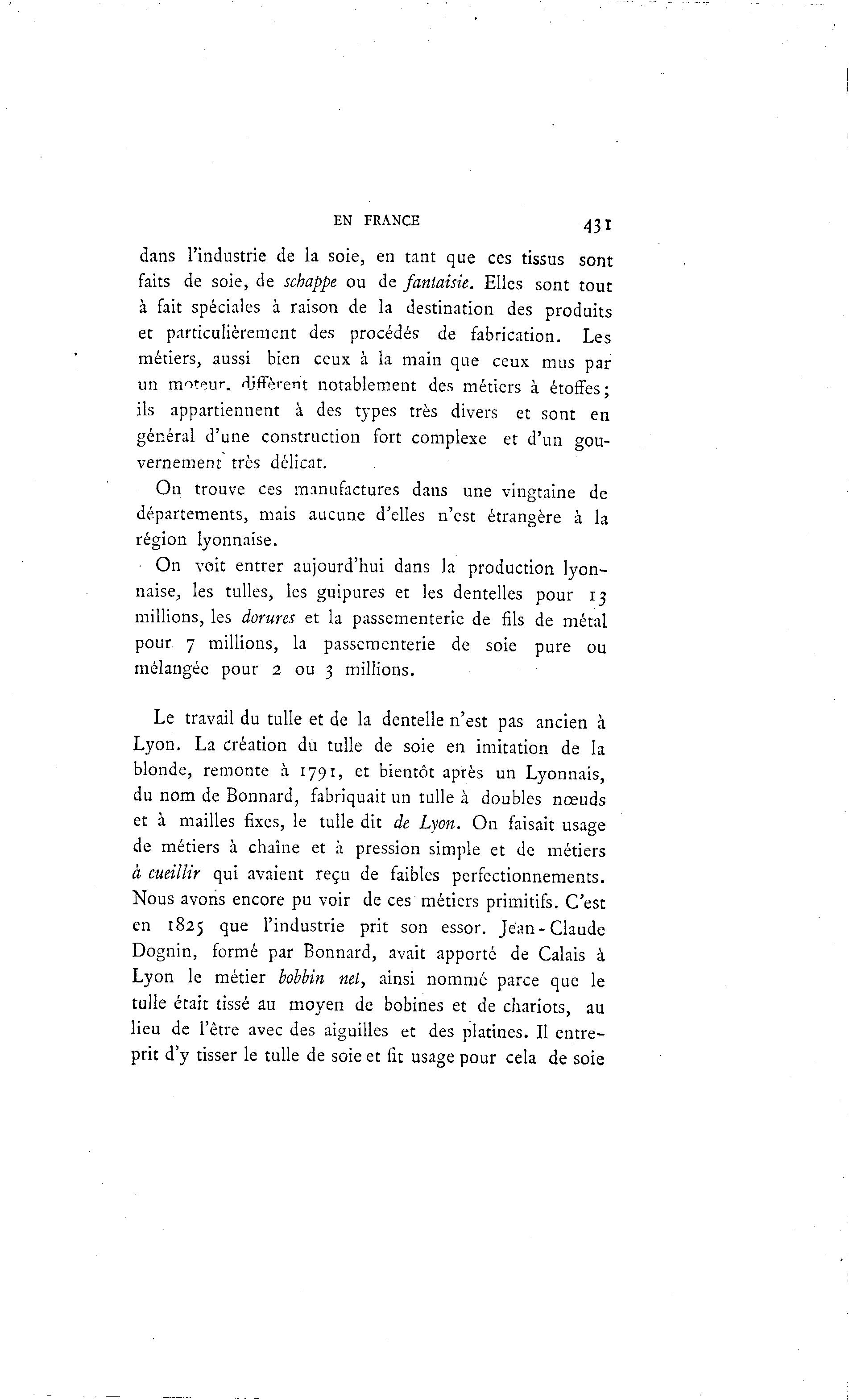 EN FRANCE 43I dans l'industrie de la soie, en tant que ces tissus sont faits de soie, de schappe ou de fantaisie. Elles sont tout à fait spéciales à raison de la destination des produits et particulièrement des procédés de fabrication. Les métiers, aussi bien ceux à la main que ceux mus par un moteur, diffèrent notablement des métiers à étoffes; ils appartiennent à des types très divers et sont en général d'une construction fort complexe et d'un gou- vernement très délicat. On trouve ces manufactures dans une vingtaine de départements, mais aucune d'elles n'est étrangère à la région lyonnaise. On voit entrer aujourd'hui dans la production lyon- naise, les tulles, les guipures et les dentelles pour 13 millions, les dorures et la passementerie de fils de métal pour 7 millions, la passementerie de soie pure ou mélangée pour 2 ou 3 millions. Le travail du tulle et de la dentelle n'est pas ancien à Lyon. La création du tulle de soie en imitation de la blonde, remonte à 179T, et bientôt après un Lyonnais, du nom de Bonnard, fabriquait un tulle à doubles nœuds et à mailles fixes, le tulle dit de Lyon. On faisait usage de métiers à chaîne et à pression simple et de métiers à cueillir qui avaient reçu de faibles perfectionnements. Nous avons encore pu voir de ces métiers primitifs. C'est en 1825 que l'industrie prit son essor. Jean-Claude Dognin, formé par Bonnard, avait apporté de Calais à Lyon le métier bobbin net, ainsi nommé parce que le tulle était tissé au moyen de bobines et de chariots, au lieu de l'être avec des aiguilles et des platines. Il entre- prit d'y tisser le tulle de soie et fit usage pour cela de soie