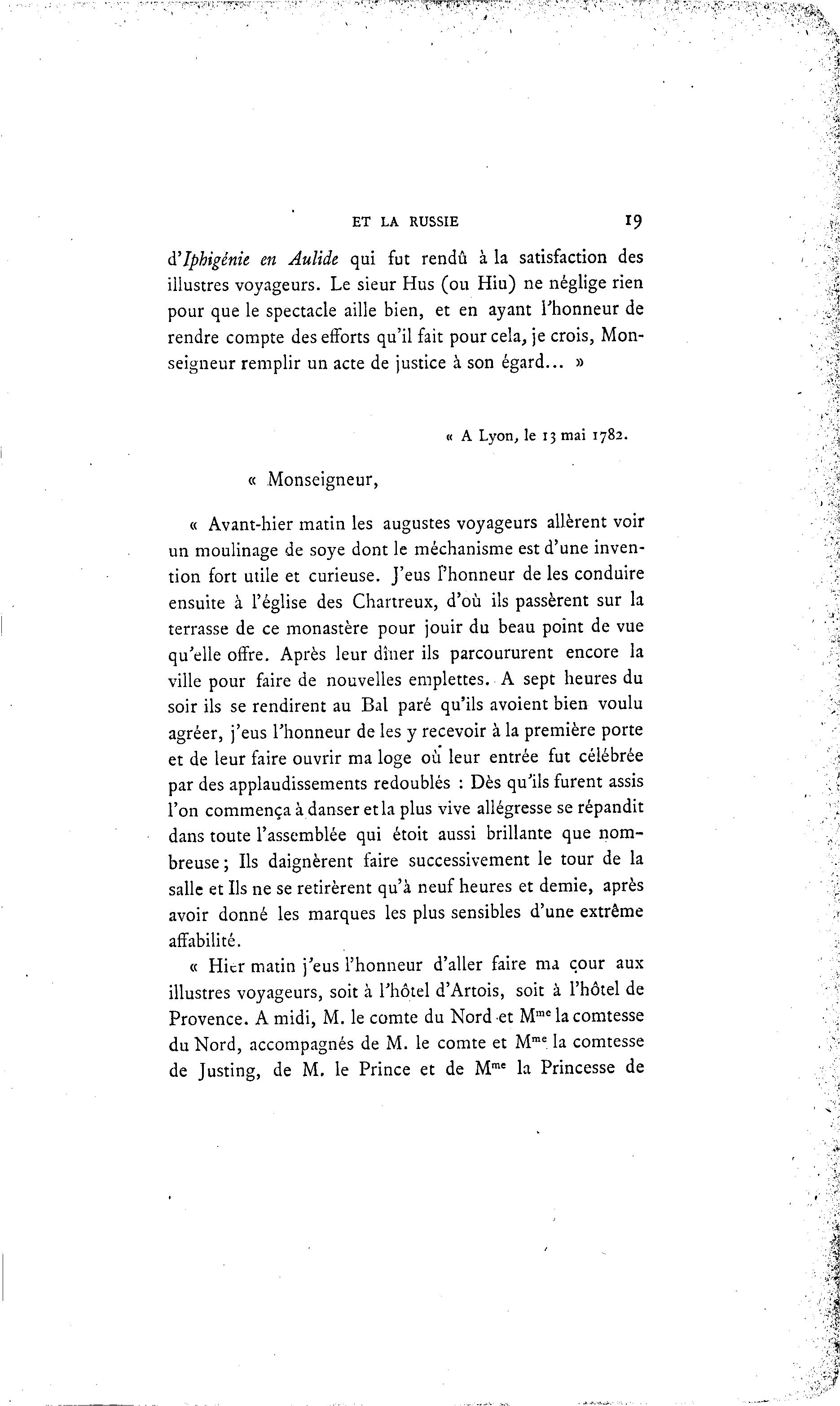 ET LA RUSSIE 19 à 'Iphigénie en Aulide qui fut rendu à la satisfaction des illustres voyageurs. Le sieur Hus (ou Hiu) ne néglige rien pour que le spectacle aille bien, et en ayant l'honneur de rendre compte des efforts qu'il fait pour cela, je crois, Mon- seigneur remplir un acte de justice à son égard... » « A Lyon, le 13 mai 1782. « Monseigneur, « Avant-hier matin les augustes voyageurs allèrent voir un moulinage de soye dont le méchanisme est d'une inven- tion fort utile et curieuse. J'eus l'honneur de les conduire ensuite à l'église des Chartreux, d'où ils passèrent sur la terrasse de ce monastère pour jouir du beau point de vue qu'elle offre. Après leur dîner ils parcoururent encore la ville pour faire de nouvelles emplettes. A sept heures du soir ils se rendirent au Bal paré qu'ils avoient bien voulu agréer, j'eus l'honneur de les y recevoir à la première porte et de leur faire ouvrir ma loge où leur entrée fut célébrée par des applaudissements redoublés : Dès qu'ils furent assis l'on commença à danser et la plus vive allégresse se répandit dans toute l'assemblée qui étoit aussi brillante que nom- breuse ; Ils daignèrent faire successivement le tour de la salle et Ils ne se retirèrent qu'à neuf heures et demie, après avoir donné les marques les plus sensibles d'une extrême affabilité. « Hier matin j'eus l'honneur d'aller faire ma cour aux illustres voyageurs, soit à l'hôtel d'Artois, soit à l'hôtel de Provence. A midi, M. le comte du Nord et Mme la comtesse du Nord, accompagnés de M. le comte et Mme la comtesse de Justing, de M. le Prince et de Mme la Princesse de