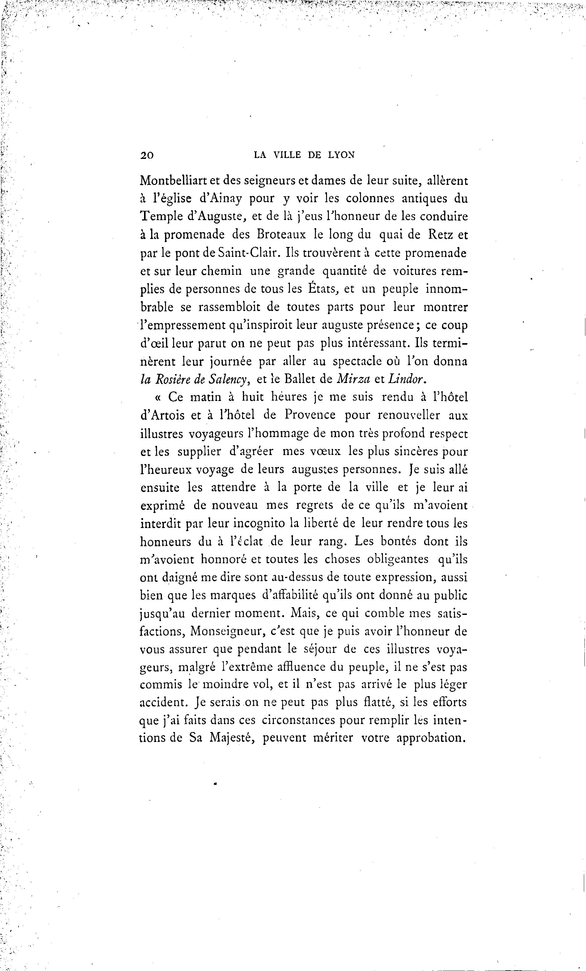 20 LA VILLE DE LYON Montbelliart et des seigneurs et dames de leur suite, allèrent à l'église d'Ainay pour y voir les colonnes antiques du Temple d'Auguste, et de là j'eus l'honneur de les conduire à la promenade des Broteaux le long du quai de Retz et par le pont de Saint-Clair. Ils trouvèrent à cette promenade et sur leur chemin une grande quantité de voitures rem- plies de personnes de tous les États, et un peuple innom- brable se rassembloit de toutes parts pour leur montrer l'empressement qu'inspiroit leur auguste présence; ce coup d'œil leur parut on ne peut pas plus intéressant. Ils termi- nèrent leur journée par aller au spectacle où l'on donna la Rosière de Salency, et le Ballet de Mirza et Lindor. « Ce matin à huit heures je me suis rendu à l'hôtel d'Artois et à l'hôtel de Provence pour renouveller aux illustres voyageurs l'hommage de mon très profond respect et les supplier d'agréer mes vœux les plus sincères pour l'heureux voyage de leurs augustes personnes. Je suis allé ensuite les attendre à la porte de la ville et je leur ai exprimé de nouveau mes regrets de ce qu'ils m'avoient interdit par leur incognito la liberté de leur rendre tous les honneurs du à l'éclat de leur rang. Les bontés dont ils m'avoient honnoré et toutes les choses obligeantes qu'ils ont daigné me dire sont au-dessus de toute expression, aussi bien que les marques d'affabilité qu'ils ont donné au public jusqu'au dernier moment. Mais, ce qui comble mes satis- factions, Monseigneur, c'est que je puis avoir l'honneur de vous assurer que pendant le séjour de ces illustres voya- geurs, malgré l'extrême affluence du peuple, il ne s'est pas commis le moindre vol, et il n'est pas arrivé le plus léger accident. Je serais on ne peut pas plus flatté, si les efforts que j'ai faits dans ces circonstances pour remplir les inten- tions de Sa Majesté, peuvent mériter votre approbation.