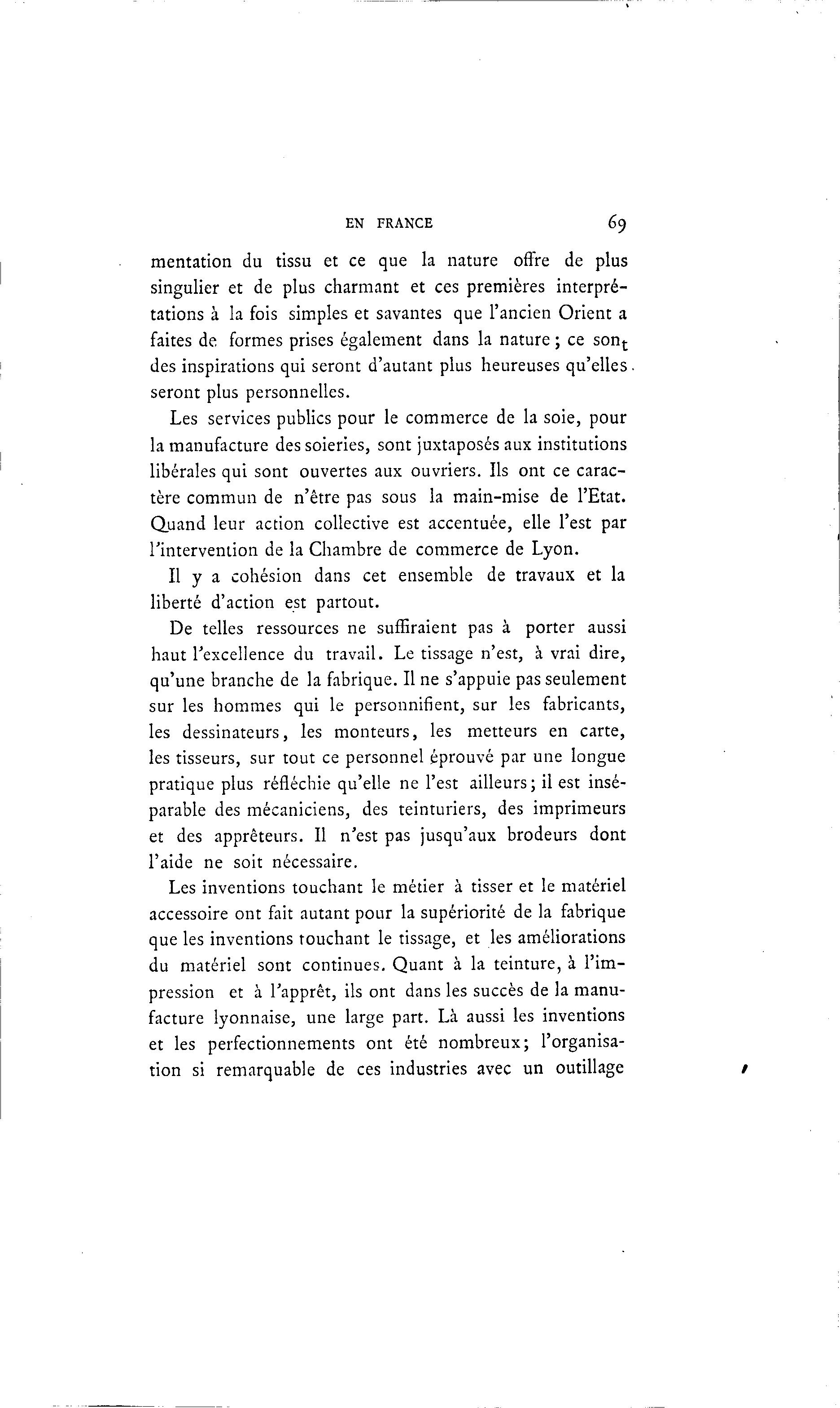 EN FRANCE 69 mentation du tissu et ce que la nature offre de plus singulier et de plus charmant et ces premières interpré- tations à la fois simples et savantes que l'ancien Orient a faites de formes prises également dans la nature ; ce son t des inspirations qui seront d'autant plus heureuses qu'elles. seront plus personnelles. Les services publics pour le commerce de la soie, pour la manufacture des soieries, sont juxtaposés aux institutions libérales qui sont ouvertes aux ouvriers. Ils ont ce carac- tère commun de n'être pas sous la main-mise de l'Etat. Quand leur action collective est accentuée, elle l'est par l'intervention de la Chambre de commerce de Lyon. Il y a cohésion dans cet ensemble de travaux et la liberté d'action est partout. De telles ressources ne suffiraient pas à porter aussi haut l'excellence du travail. Le tissage n'est, à vrai dire, qu'une branche de la fabrique. Il ne s'appuie pas seulement sur les hommes qui le personnifient, sur les fabricants, les dessinateurs, les monteurs, les metteurs en carte, les tisseurs, sur tout ce personnel éprouvé par une longue pratique plus réfléchie qu'elle ne l'est ailleurs; il est insé- parable des mécaniciens, des teinturiers, des imprimeurs et des apprêteurs. Il n'est pas jusqu'aux brodeurs dont l'aide ne soit nécessaire. Les inventions touchant le métier à tisser et le matériel accessoire ont fait autant pour la supériorité de la fabrique que les inventions touchant le tissage, et les améliorations du matériel sont continues. Quant à la teinture, à l'im- pression et à l'apprêt, ils ont dans les succès de la manu- facture lyonnaise, une large part. Là aussi les inventions et les perfectionnements ont été nombreux; l'organisa- tion si remarquable de ces industries avec un outillage /