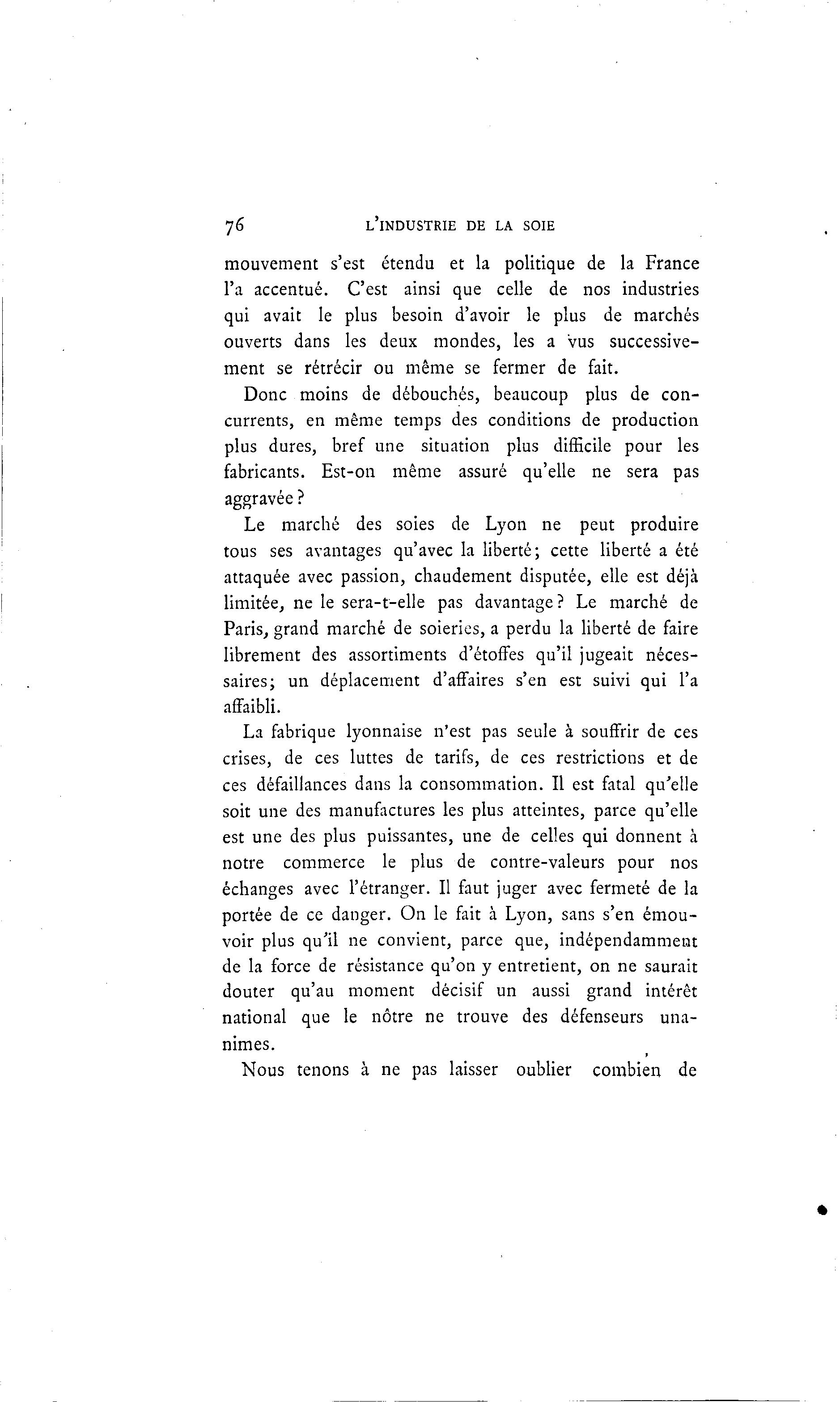 76 L'INDUSTRIE DE LA SOIE mouvement s'est étendu et la politique de la France l'a accentué. C'est ainsi que celle de nos industries qui avait le plus besoin d'avoir le plus de marchés ouverts dans les deux mondes, les a vus successive- ment se rétrécir ou même se fermer de fait. Donc moins de débouchés, beaucoup plus de con- currents, en même temps des conditions de production plus dures, bref une situation plus difficile pour les fabricants. Est-on même assuré qu'elle ne sera pas aggravée ? Le marché des soies de Lyon ne peut produire tous ses avantages qu'avec la liberté; cette liberté a été attaquée avec passion, chaudement disputée, elle est déjà limitée, ne le sera-t-elle pas davantage? Le marché de Paris, grand marché de soieries, a perdu la liberté de faire librement des assortiments d'étoffes qu'il jugeait néces- saires; un déplacement d'affaires s'en est suivi qui l'a affaibli. La fabrique lyonnaise n'est pas seule à souffrir de ces crises, de ces luttes de tarifs, de ces restrictions et de ces défaillances dans la consommation. Il est fatal qu'elle soit une des manufactures les plus atteintes, parce qu'elle est une des plus puissantes, une de celles qui donnent à notre commerce le plus de contre-valeurs pour nos échanges avec l'étranger. Il faut juger avec fermeté de la portée de ce danger. On le fait à Lyon, sans s'en émou- voir plus qu'il ne convient, parce que, indépendamment de la force de résistance qu'on y entretient, on ne saurait douter qu'au moment décisif un aussi grand intérêt national que le nôtre ne trouve des défenseurs una- nimes. Nous tenons à ne pas laisser oublier combien de