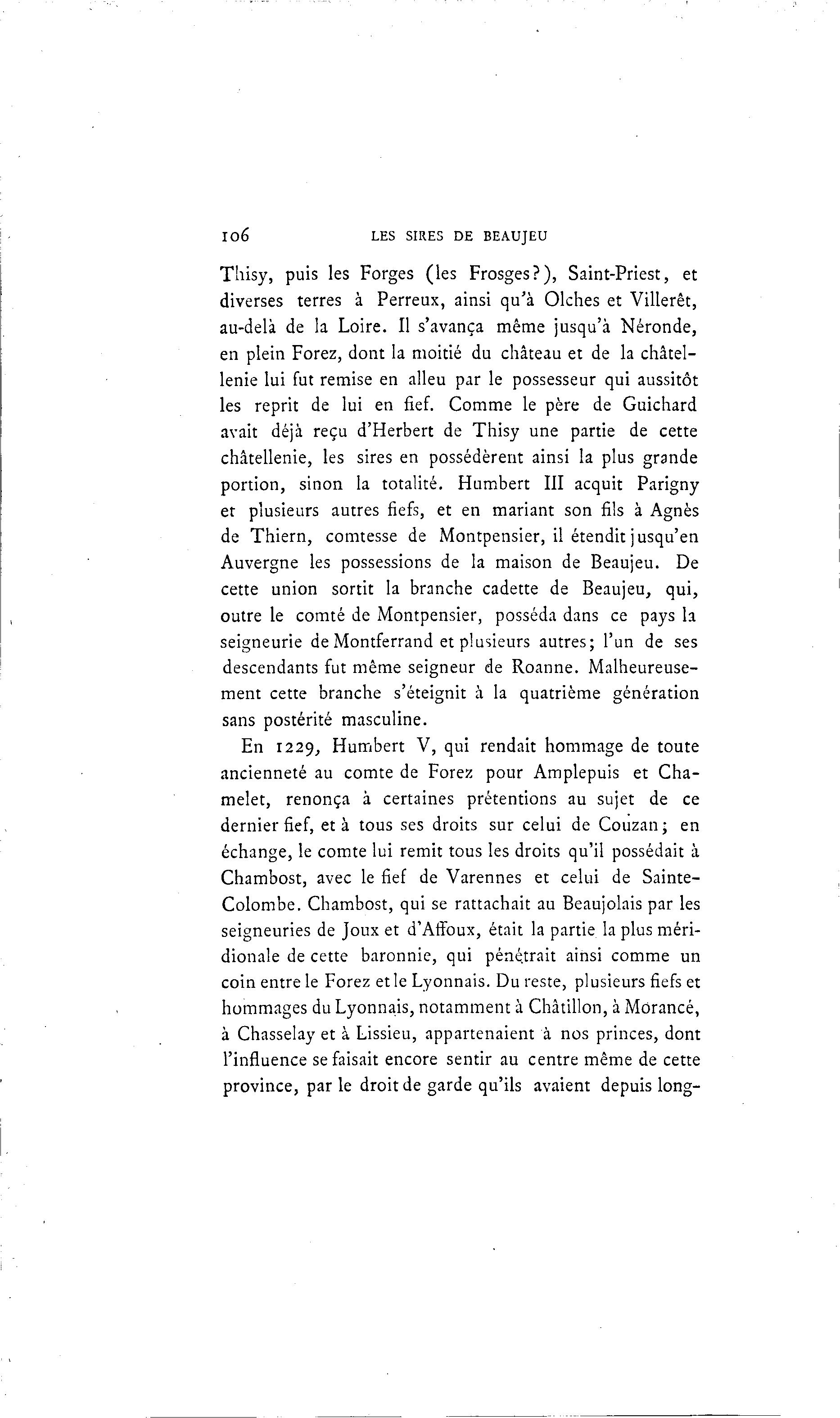 106 LES SIRES DE BEAUJEU Thisy, puis les Forges (les Frosges?), Saint-Priest, et diverses terres à Perreux, ainsi qu'à Olches et Villerêt, au-delà de la Loire. Il s'avança même jusqu'à Néronde, en plein Forez, dont la moitié du château et de la châtel- lenie lui fut remise en alleu par le possesseur qui aussitôt les reprit de lui en fief. Comme le père de Guichard avait déjà reçu d'Herbert de Thisy une partie de cette châtellenie, les sires en possédèrent ainsi la plus grande portion, sinon la totalité. Humbert III acquit Parigny et plusieurs autres fiefs, et en mariant son fils à Agnès de Thiern, comtesse de Montpensier, il étendit jusqu'en Auvergne les possessions de la maison de Beaujeu. De cette union sortit la branche cadette de Beaujeu, qui, outre le comté de Montpensier, posséda dans ce pays la seigneurie de Montferrand et plusieurs autres; l'un de ses descendants fut même seigneur de Roanne. Malheureuse- ment cette branche s'éteignit à la quatrième génération sans postérité masculine. En 1229, Humbert V, qui rendait hommage de toute ancienneté au comte de Forez pour Amplepuis et Cha- melet, renonça à certaines prétentions au sujet de ce dernier fief, et à tous ses droits sur celui de Couzan; en échange, le comte lui remit tous les droits qu'il possédait à Chambost, avec le fief de Varennes et celui de Sainte- Colombe. Chambost, qui se rattachait au Beaujolais par les seigneuries de Joux et d'Affoux, était la partie la plus méri- dionale de cette baronnie, qui pénétrait ainsi comme un coin entre le Forez et le Lyonnais. Du reste, plusieurs fiefs et hommages du Lyonnais, notamment à Châtillon, à Morancé, à Chasselay et à Lissieu, appartenaient à nos princes, dont l'influence se faisait encore sentir au centre même de cette province, par le droit de garde qu'ils avaient depuis long-