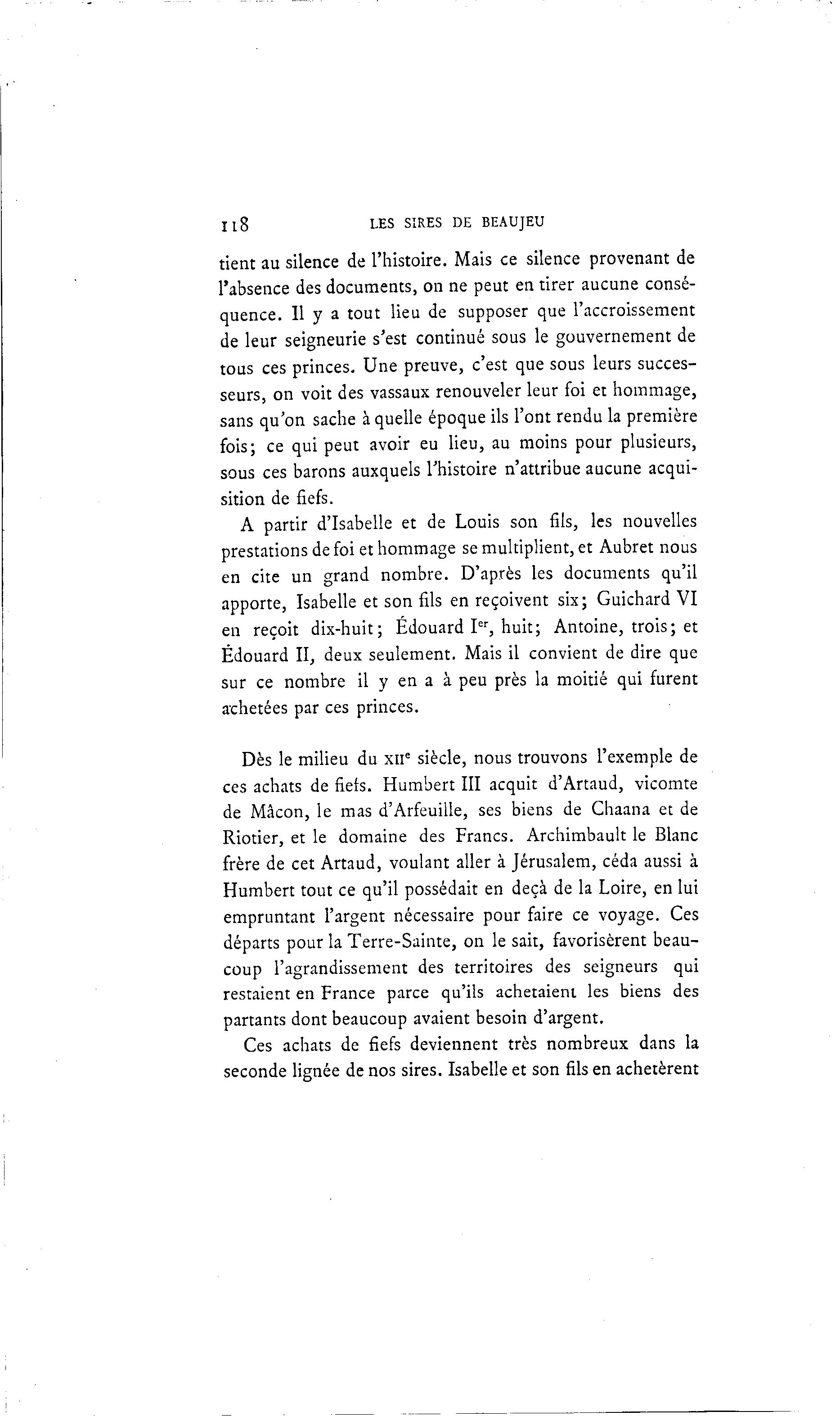 Il8 LES SIRES DE BEAUJEU tient au silence de l'histoire. Mais ce silence provenant de l'absence des documents, on ne peut en tirer aucune consé- quence. Il y a tout lieu de supposer que l'accroissement de leur seigneurie s'est continué sous le gouvernement de tous ces princes. Une preuve, c'est que sous leurs succes- seurs, on voit des vassaux renouveler leur foi et hommage, sans qu'on sache à quelle époque ils l'ont rendu la première fois; ce qui peut avoir eu lieu, au moins pour plusieurs, sous ces barons auxquels l'histoire n'attribue aucune acqui- sition de fiefs. A partir d'Isabelle et de Louis son fils, les nouvelles prestations de foi et hommage se multiplient, et Aubret nous en cite un grand nombre. D'après les documents qu'il apporte, Isabelle et son fils en reçoivent six; Guichard VI en reçoit dix-huit; Edouard I er , huit; Antoine, trois; et Edouard II, deux seulement. Mais il convient de dire que sur ce nombre il y en a à peu près la moitié qui furent achetées par ces princes. Dès le milieu du xne siècle, nous trouvons l'exemple de ces achats de fiers. Humbert III acquit d'Artaud, vicomte de Mâcon, le mas d'Arfeuille, ses biens de Chaana et de Riotier, et le domaine des Francs. Archimbault le Blanc frère de cet Artaud, voulant aller à Jérusalem, céda aussi à Humbert tout ce qu'il possédait en deçà de la Loire, en lui empruntant l'argent nécessaire pour faire ce voyage. Ces départs pour la Terre-Sainte, on le sait, favorisèrent beau- coup l'agrandissement des territoires des seigneurs qui restaient en France parce qu'ils achetaient les biens des partants dont beaucoup avaient besoin d'argent. Ces achats de fiefs deviennent très nombreux dans la seconde lignée de nos sires. Isabelle et son fils en achetèrent