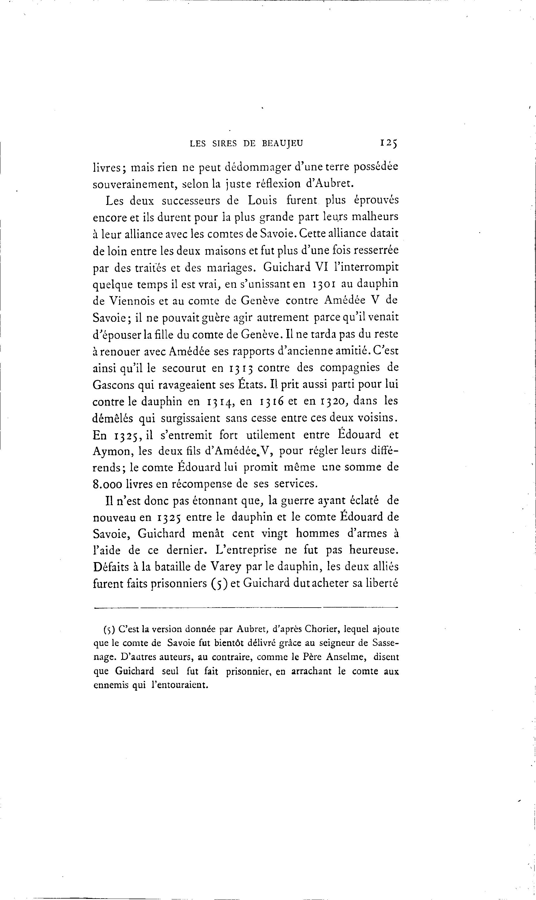 LES SIRES DE BEAUJEU 125 livres; mais rien ne peut dédommager d'une terre possédée souverainement, selon la juste réflexion d'Aubret. Les deux successeurs de Louis furent plus éprouvés encore et ils durent pour la plus grande part leurs malheurs à leur alliance avec les comtes de Savoie. Cette alliance datait de loin entre les deux maisons et fut plus d'une fois resserrée par des traites et des mariages. Guichard VI l'interrompit quelque temps il est vrai, en s'unissanten 1301 au dauphin de Viennois et au comte de Genève contre Amédée V de Savoie; il ne pouvait guère agir autrement parce qu'il venait d'épouser la fille du comte de Genève. Il ne tarda pas du reste à renouer avec Amédée ses rapports d'ancienne amitié. C'est ainsi qu'il le secourut en 1313 contre des compagnies de Gascons qui ravageaient ses États. Il prit aussi parti pour lui contre le dauphin en 13 14, en 1316 et en 1320, dans les démêlés qui surgissaient sans cesse entre ces deux voisins. En 1325, il s'entremit fort utilement entre Edouard et Aymon, les deux fils d'Amédée.V, pour régler leurs diffé- rends; le comte Edouard lui promit même une somme de 8.000 livres en récompense de ses services. Il n'est donc pas étonnant que, la guerre ayant éclaté de nouveau en 1325 entre le dauphin et le comte Edouard de Savoie, Guichard menât cent vingt hommes d'armes à l'aide de ce dernier. L'entreprise ne fut pas heureuse. Défaits à la bataille de Varey par le dauphin, les deux alliés furent faits prisonniers (5) et Guichard dut acheter sa liberté (5) C'est la version donnée par Aubret, d'après Chorier, lequel ajoute que le comte de Savoie fut bientôt délivré grâce au seigneur de Sasse- nage. D'autres auteurs, au contraire, comme le Père Anselme, disent que Guichard seul fut fait prisonnier, en arrachant le comte aux ennemis qui l'entouraient.
