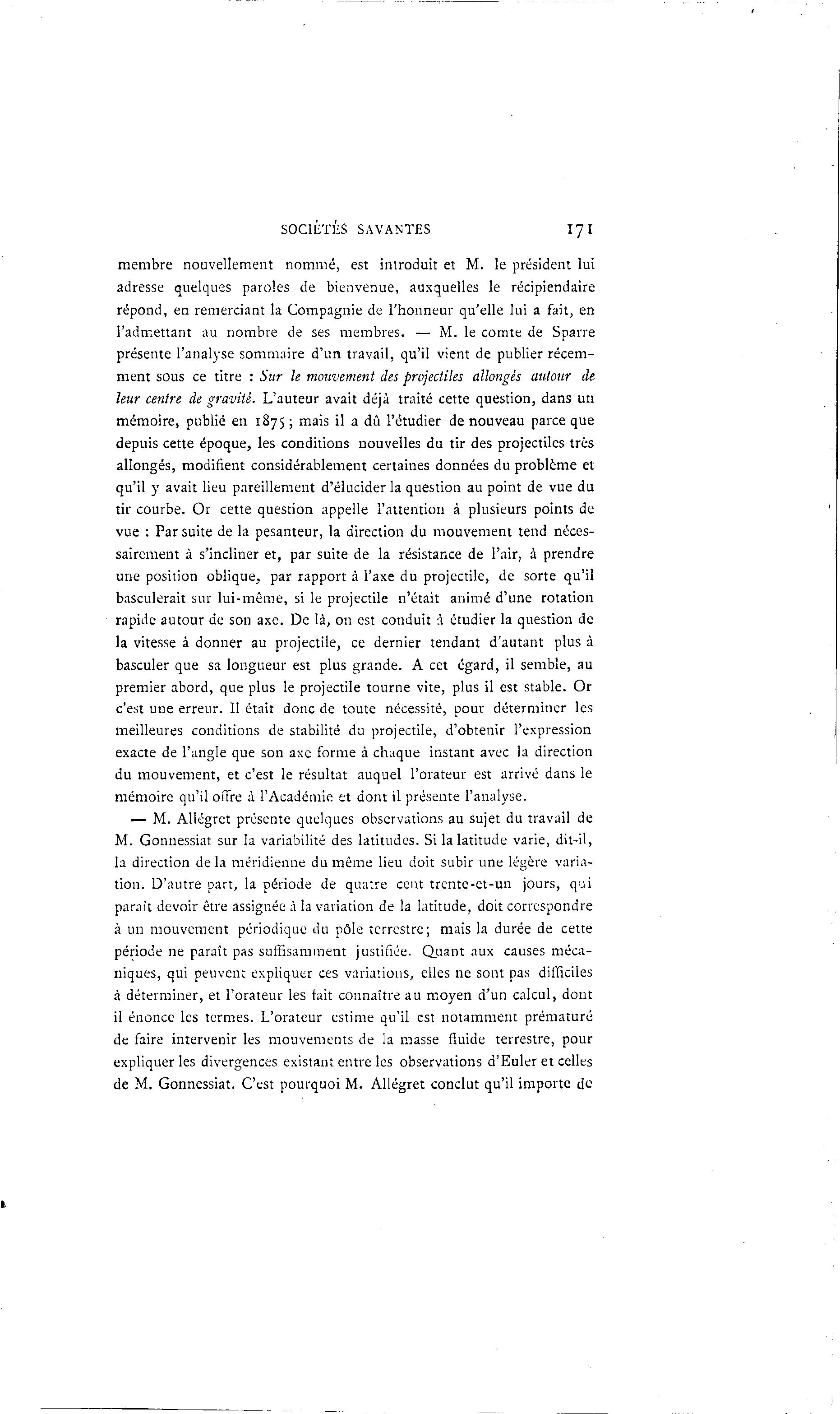 SOCIÉTÉS SAVANTES 171 membre nouvellement nommé, est introduit et M. le président lui adresse quelques paroles de bienvenue, auxquelles le récipiendaire répond, en remerciant la Compagnie de l'honneur qu'elle lui a fait, en l'admettant au nombre de ses membres. — M. le comte de Sparre présente l'analyse sommaire d'un travail, qu'il vient de publier récem- ment sous ce titre : Sur le mouvement des projectiles allongés autour de leur centre de gravité. L'auteur avait déjà traité cette question, dans un mémoire, publié en 1875 ; mais il a dû l'étudier de nouveau parce que depuis cette époque, les conditions nouvelles du tir des projectiles très allongés, modifient considérablement certaines données du problème et qu'il }' avait lieu pareillement d'élucider la question au point de vue du tir courbe. Or cette question appelle l'attention à plusieurs points de vue : Par suite de la pesanteur, la direction du mouvement tend néces- sairement à s'incliner et, par suite de la résistance de l'air, à prendre une position oblique, par rapport à l'axe du projectile, de sorte qu'il basculerait sur lui-même, si le projectile n'était animé d'une rotation rapide autour de son axe. De là , on est conduit à étudier la question de la vitesse à donner au projectile, ce dernier tendant d'autant plus à basculer que sa longueur est plus grande. A cet égard, il semble, au premier abord, que plus le projectile tourne vite, plus il est stable. Or c'est une erreur. 11 était donc de toute nécessité, pour déterminer les meilleures conditions de stabilité du projectile, d'obtenir l'expression exacte de l'angle que son axe forme à chaque instant avec la direction du mouvement, et c'est le résultat auquel l'orateur est arrivé dans le mémoire qu'il offre à l'Académie et dont il présente l'analyse. — M. Allégret présente quelques observations au sujet du travail de M. Gonnessiat sur la variabilité des latitudes. Si la latitude varie, dit-il, la direction de la méridienne du même lieu doit subir une légère varia- tion. D'autre part, la période de quatre cent trente-et-un jours, qui paraît devoir être assignée à la variation de la latitude, doit correspondre à un mouvement périodique du pôle terrestre; mais la durée de cette période ne paraît pas suffisamment justifiée. Quant aux causes méca- niques, qui peuvent expliquer ces variations, elles ne sont pas difficiles à déterminer, et l'orateur les fait connaître au moyen d'un calcul, dont il énonce les termes. L'orateur estime qu'il est notamment prématuré de faire intervenir les mouvements de la masse fluide terrestre, pour expliquer les divergences existant entre les observations d'Euler et celles de M. Gonnessiat. C'est pourquoi M. Allégret conclut qu'il importe de