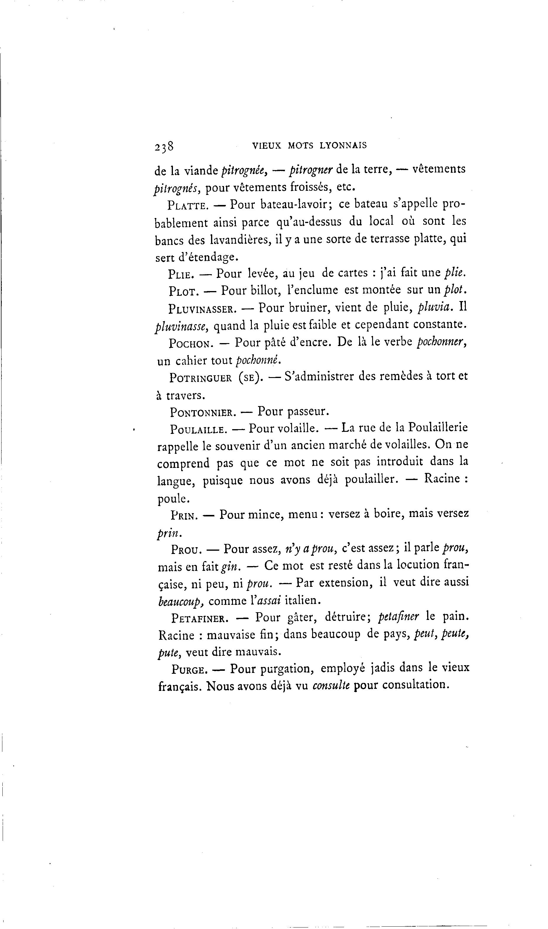 238 VIEUX MOTS LYONNAIS de la viande pitrognée, — pitrogner de la terre, — vêtements pilrognés, pour vêtements froissés, etc. PLATTE. — Pour bateau-lavoir; ce bateau s'appelle pro- bablement ainsi parce qu'au-dessus du local où sont les bancs des lavandières, il y a une sorte de terrasse platte, qui sert d'étendage. PLIE. — Pour levée, au jeu de cartes : j'ai fait une plie. PLOT. — Pour billot, l'enclume est montée sur un plot. PLUVINASSER. — Pour bruiner, vient de pluie, pluvia. Il pluvinasse, quand la pluie est faible et cependant constante. POCHON. — Pour pâté d'encre. De là le verbe pochonner, un cahier tout pochonné. POTRINGUER (SE). — S'administrer des remèdes à tort et à travers. PONTONNIER. — Pour passeur. POULAILLE. — Pour volaille. — La rue de la Poulaillerie rappelle le souvenir d'un ancien marché de volailles. On ne comprend pas que ce mot ne soit pas introduit dans la langue, puisque nous avons déjà poulailler. — Racine : poule. PRIN. — Pour mince, menu : versez à boire, mais versez prin. PROU. — Pour assez, n'y a prou, c'est assez; il parle prou, mais en fait^w. — Ce mot est resté dans la locution fran- çaise, ni peu, ni prou. — Par extension, il veut dire aussi beaucoup, comme Yassai italien. PETAFINER. — Pour gâter, détruire; petafiner le pain. Racine : mauvaise fin; dans beaucoup de pays, peut, peute, pute, veut dire mauvais. PURGE. — Pour purgation, employé jadis dans le vieux français. Nous avons déjà vu consulte pour consultation.