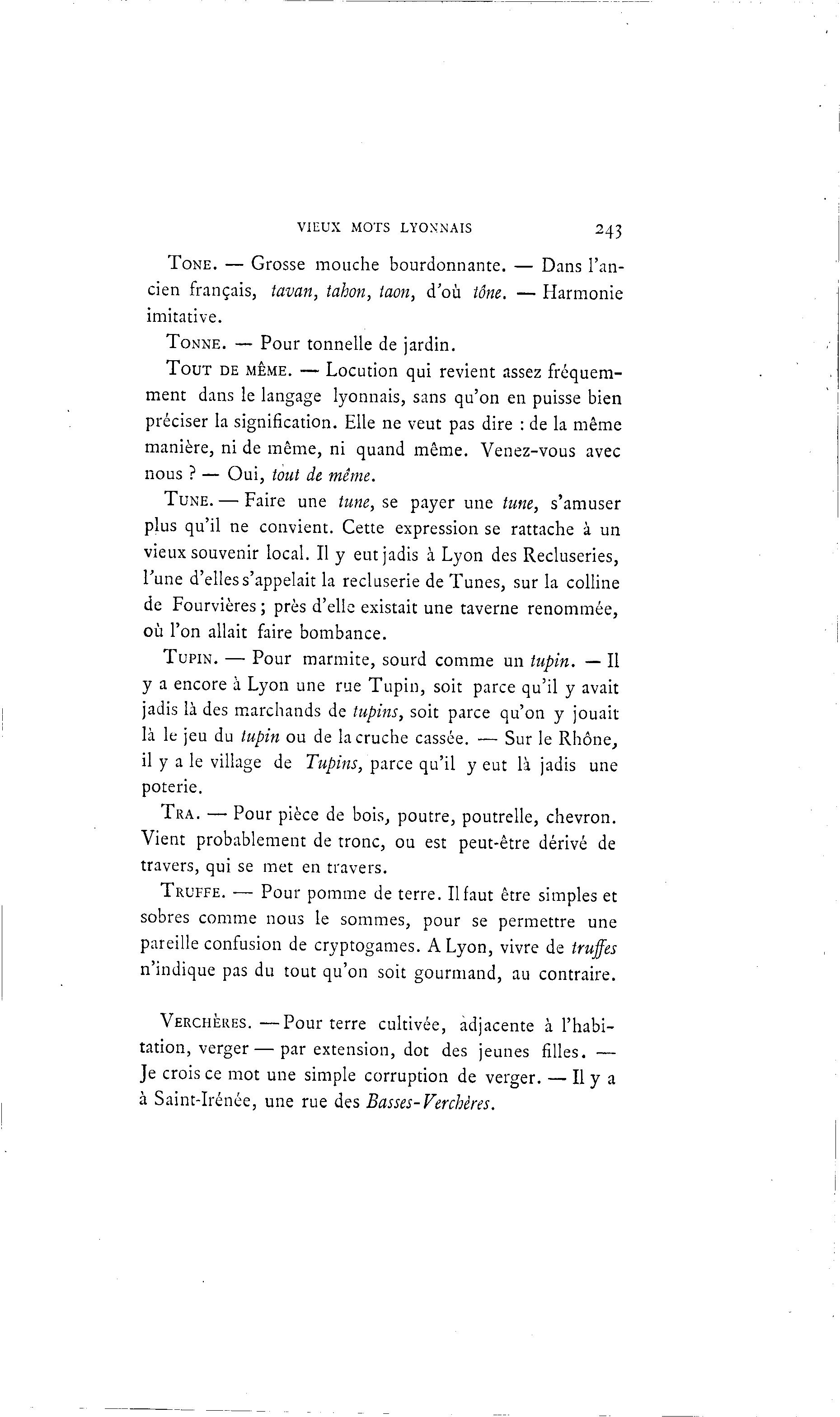VIEUX MOTS LYONNAIS 243 TONE. — Grosse mouche bourdonnante. — Dans l'an- cien français, tavan, tahon, taon, d'où tône. — Harmonie imita tive. TONNE. — Pour tonnelle de jardin. TOUT DE MÊME. — Locution qui revient assez fréquem- ment dans le langage lyonnais, sans qu'on en puisse bien préciser la signification. Elle ne veut pas dire : de la même manière, ni de même, ni quand même. Venez-vous avec nous ? — Oui, tout de même. TUNE. — Faire une tune, se payer une tune, s'amuser plus qu'il ne convient. Cette expression se rattache à un vieux souvenir local. Il y eut jadis à Lyon des Recluseries, Tune d'elles s'appelait la recluserie de Tunes, sur la colline de Fourvières ; près d'elle existait une taverne renommée, où l'on allait faire bombance. TUPIN. — Pour marmite, sourd comme un tupin. — Il y a encore à Lyon une rue Tupin, soit parce qu'il y avait jadis là des marchands de tupins, soit parce qu'on y jouait là le jeu du tupin ou de la cruche cassée. — Sur le Rhône, il y a le village de Tupins, parce qu'il y eut là jadis une poterie. TRA. — Pour pièce de bois, poutre, poutrelle, chevron. Vient probablement de tronc, ou est peut-être dérivé de travers, qui se met en travers. TRUFFE. -— Pour pomme de terre. Il faut être simples et sobres comme nous le sommes, pour se permettre une pareille confusion de cryptogames. A Lyon, vivre de truffes n'indique pas du tout qu'on soit gourmand, au contraire. VERCHÈRES.—Pour terre cultivée, adjacente à l'habi- tation, verger— par extension, dot des jeunes filles. — Je crois ce mot une simple corruption de verger. — Il y a à Saint-Irénée, une rue des Basses-Verchères.