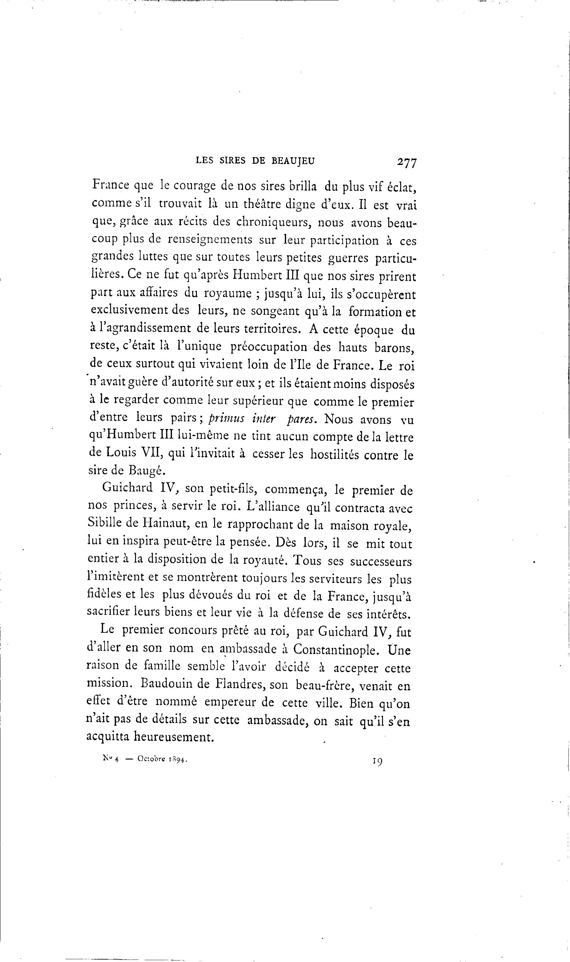 LES SIRES DE BEAUJEU 277 France que le courage de nos sires brilla du plus vif éclat, comme s'il trouvait là un théâtre digne d'eux. Il est vrai que, grâce aux récits des chroniqueurs, nous avons beau- coup plus de renseignements sur leur participation à ces grandes luttes que sur toutes leurs petites guerres particu- lières. Ce ne fut qu'après Humbert III que nos sires prirent part aux affaires du royaume ; jusqu'à lui, ils s'occupèrent exclusivement des leurs, ne songeant qu'à la formation et à l'agrandissement de leurs territoires. A cette époque du reste, c'était là l'unique préoccupation des hauts barons, de ceux surtout qui vivaient loin de l'Ile de France. Le roi n'avait guère d'autorité sur eux ; et ils étaient moins disposés à le regarder comme leur supérieur que comme le premier d'entre leurs pairs ; primus inler pares. Nous avons vu qu'Humbert III lui-même ne tint aucun compte de la lettre de Louis VII, qui l'invitait à cesser les hostilités contre le sire de Baugé. Guichard IV, son petit-fils, commença, le premier de nos princes, à servir le roi. L'alliance qu'il contracta avec Sibille de Hainaut, en le rapprochant de la maison royale, lui en inspira peut-être la pensée. Dès lors, il se mit tout entier à la disposition de la royauté. Tous ses successeurs l'imitèrent et se montrèrent toujours les serviteurs les plus fidèles et les plus dévoués du roi et de la France, jusqu'à sacrifier leurs biens et leur vie à la défense de ses intérêts. Le premier concours prêté au roi, par Guichard IV, fut d'aller en son nom en ambassade à Constantinople. Une raison de famille semble l'avoir décidé à accepter cette mission. Baudouin de Flandres, son beau-frère, venait en effet d'être nommé empereur de cette ville. Bien qu'on n'ait pas de détails sur cette ambassade, on sait qu'il s'en acquitta heureusement. K° 4 — Octobre 1^94, 19