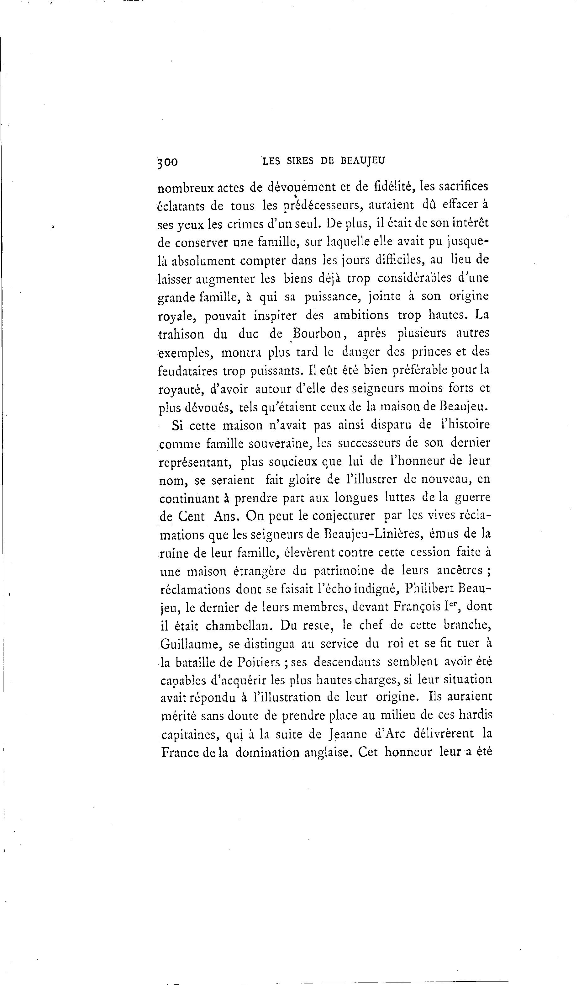 '300 LES SIRES DE BEAUJEU nombreux actes de dévouement et de fidélité, les sacrifices éclatants de tous les prédécesseurs, auraient dû effacer à ses yeux les crimes d'un seul. De plus, il était de son intérêt de conserver une famille, sur laquelle elle avait pu jusque- là absolument compter dans les jours difficiles, au lieu de laisser augmenter les biens déjà trop considérables d'une grande famille, à qui sa puissance, jointe à son origine royale, pouvait inspirer des ambitions trop hautes. La trahison du duc de Bourbon, après plusieurs autres exemples, montra plus tard le danger des princes et des feudataires trop puissants. Il eût été bien préférable pour la royauté, d'avoir autour d'elle des seigneurs moins forts et plus dévoués, tels qu'étaient ceux de la maison de Beaujeu. Si cette maison n'avait pas ainsi disparu de l'histoire comme famille souveraine, les successeurs de son dernier représentant, plus soucieux que lui de l'honneur de leur nom, se seraient fait gloire de l'illustrer de nouveau, en continuant à prendre part aux longues luttes de la guerre de Cent Ans. On peut le conjecturer par les vives récla- mations que les seigneurs de Beaujeu-Linières, émus de la ruine de leur famille, élevèrent contre cette cession faite à une maison étrangère du patrimoine de leurs ancêtres ; réclamations dont se faisait l'écho indigné, Philibert Beau- jeu, le dernier de leurs membres, devant François I er , dont il était chambellan. Du reste, le chef de cette branche, Guillaume, se distingua au service du roi et se fit tuer à la bataille de Poitiers ; ses descendants semblent avoir été capables d'acquérir les plus hautes charges, si leur situation avait répondu à l'illustration de leur origine. Ils auraient mérité sans doute de prendre place au milieu de ces hardis capitaines, qui à la suite de Jeanne d'Arc délivrèrent la France de la domination anglaise. Cet honneur leur a été