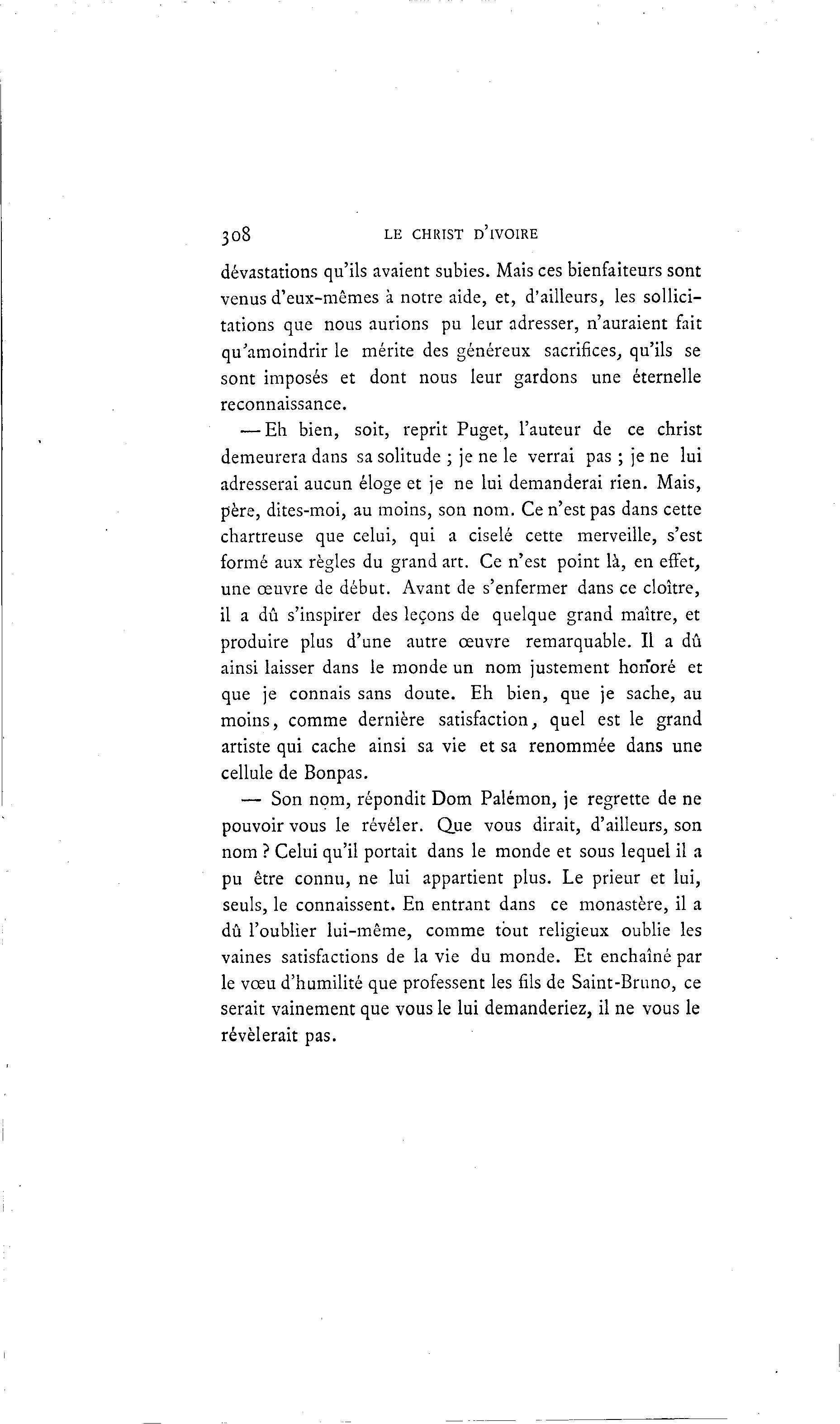308 LE CHRIST D'IVOIRE dévastations qu'ils avaient subies. Mais ces bienfaiteurs sont venus d'eux-mêmes à notre aide, et, d'ailleurs, les sollici- tations que nous aurions pu leur adresser, n'auraient fait qu'amoindrir le mérite des généreux sacrifices, qu'ils se sont imposés et dont nous leur gardons une éternelle reconnaissance. — Eh bien, soit, reprit Puget, l'auteur de ce christ demeurera dans sa solitude ; je ne le verrai pas ; je ne lui adresserai aucun éloge et je ne lui demanderai rien. Mais, père, dites-moi, au moins, son nom. Ce n'est pas dans cette chartreuse que celui, qui a ciselé cette merveille, s'est formé aux règles du grand art. Ce n'est point là , en effet, une œuvre de début. Avant de s'enfermer dans ce cloître, il a dû s'inspirer des leçons de quelque grand maître, et produire plus d'une autre œuvre remarquable. Il a dû ainsi laisser dans le monde un nom justement honoré et que je connais sans doute. Eh bien, que je sache, au moins, comme dernière satisfaction, quel est le grand artiste qui cache ainsi sa vie et sa renommée dans une cellule de Bonpas. — Son nom, répondit Dom Palémon, je regrette de ne pouvoir vous le révéler. Que vous dirait, d'ailleurs, son nom ? Celui qu'il portait dans le monde et sous lequel il a pu être connu, ne lui appartient plus. Le prieur et lui, seuls, le connaissent. En entrant dans ce monastère, il a dû l'oublier lui-même, comme tout religieux oublie les vaines satisfactions de la vie du monde. Et enchaîné par le vœu d'humilité que professent les fils de Saint-Bruno, ce serait vainement que vous le lui demanderiez, il ne vous le révélerait pas.