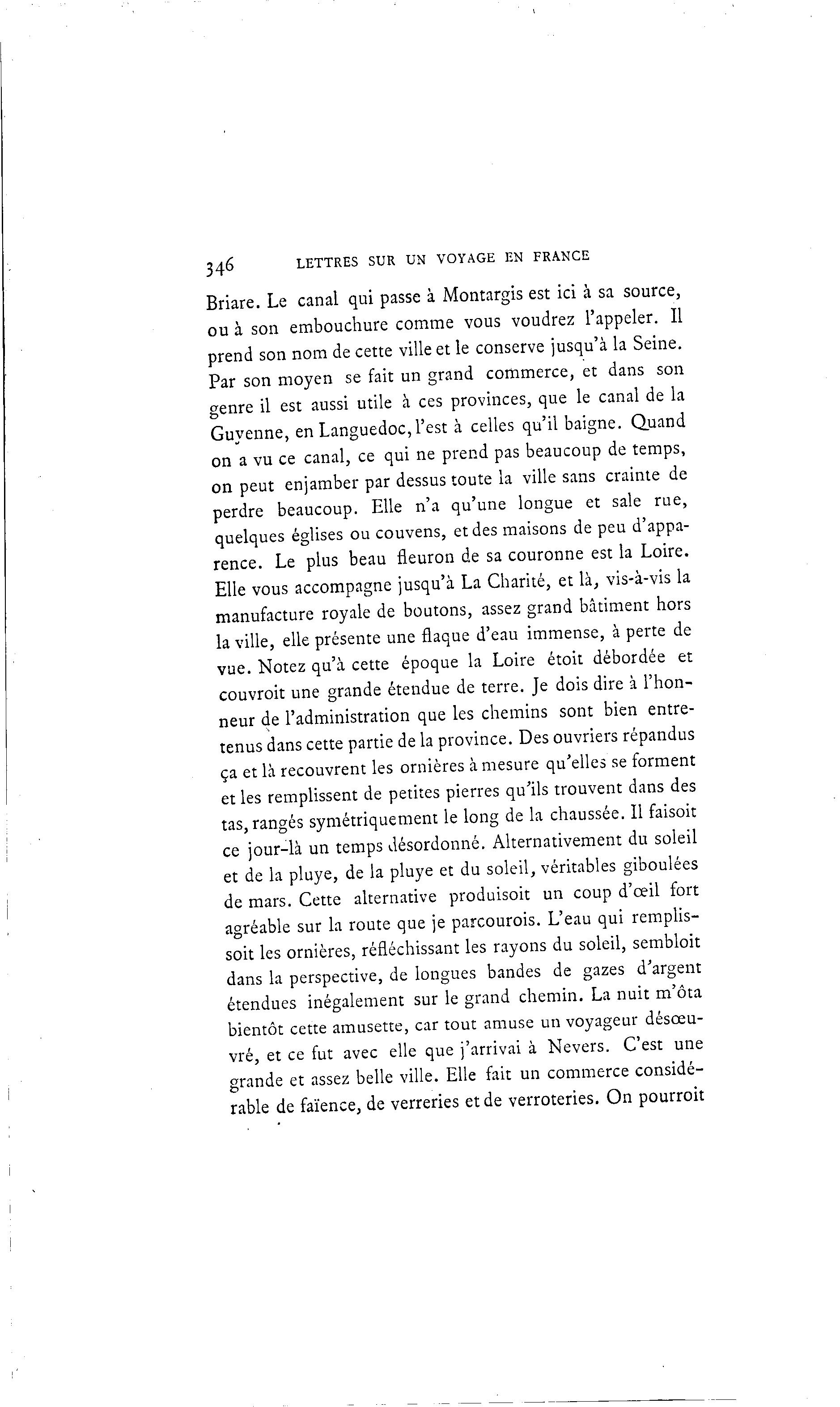 346 LETTRES SUR UN VOYAGE EN FRANCE Briare. Le canal qui passe à Montargis est ici à sa source, ou à son embouchure comme vous voudrez l'appeler. Il prend son nom de cette ville et le conserve jusqu'à la Seine. Par son moyen se fait un grand commerce, et dans son genre il est aussi utile à ces provinces, que le canal de la Guyenne, en Languedoc, l'est à celles qu'il baigne. Quand on a vu ce canal, ce qui ne prend pas beaucoup de temps, on peut enjamber par dessus toute la ville sans crainte de perdre beaucoup. Elle n'a qu'une longue et sale rue, quelques églises ou couvens, et des maisons de peu d'appa- rence. Le plus beau fleuron de sa couronne est la Loire. Elle vous accompagne jusqu'à La Charité, et là , vis-à -vis la manufacture royale de boutons, assez grand bâtiment hors la ville, elle présente une flaque d'eau immense, à perte de vue. Notez qu'à cette époque la Loire étoit débordée et couvroit une grande étendue de terre. Je dois dire à l'hon- neur de l'administration que les chemins sont bien entre- tenus dans cette partie de la province. Des ouvriers répandus ça et là recouvrent les ornières à mesure qu'elles se forment et les remplissent de petites pierres qu'ils trouvent dans des tas, rangés symétriquement le long de la chaussée. Il faisoit ce jour-là un temps désordonné. Alternativement du soleil et de la pluye, de la pluye et du soleil, véritables giboulées de mars. Cette alternative produisoit un coup d'œil fort agréable sur la route que je parcourois. L'eau qui remplis- soit les ornières, réfléchissant les rayons du soleil, sembloit dans la perspective, de longues bandes de gazes d'argent étendues inégalement sur le grand chemin. La nuit m'ôta bientôt cette amusette, car tout amuse un voyageur désœu- vré, et ce fut avec elle que j'arrivai à Nevers. C'est une grande et assez belle ville. Elle fait un commerce considé- rable de faïence, de verreries et de verroteries. On pourroit
