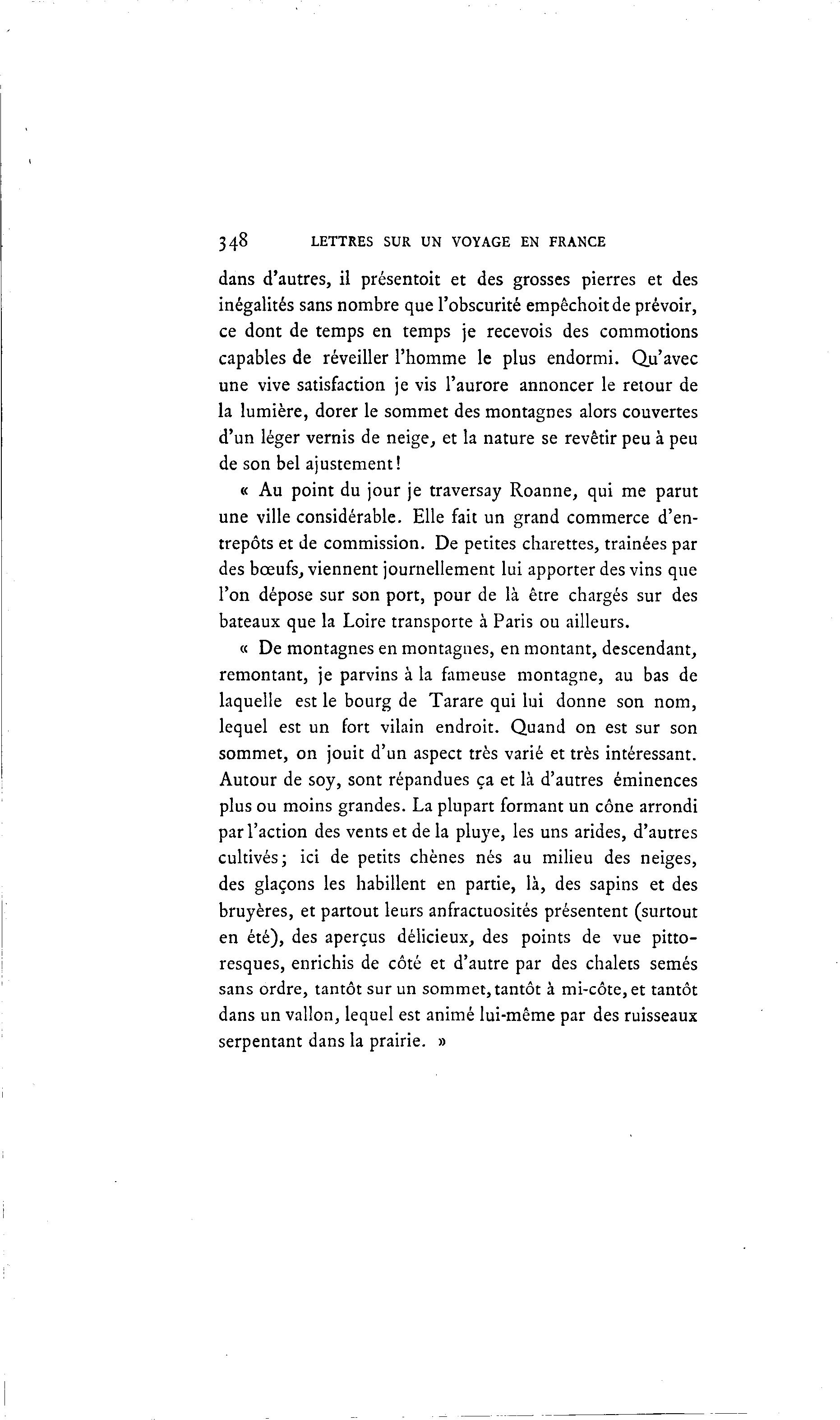 348 LETTRES SUR UN VOYAGE EN FRANCE dans d'autres, il présentoit et des grosses pierres et des inégalités sans nombre que l'obscurité empêchoitde prévoir, ce dont de temps en temps je recevois des commotions capables de réveiller l'homme le plus endormi. Qu'avec une vive satisfaction je vis l'aurore annoncer le retour de la lumière, dorer le sommet des montagnes alors couvertes d'un léger vernis de neige, et la nature se revêtir peu à peu de son bel ajustement! « Au point du jour je traversay Roanne, qui me parut une ville considérable. Elle fait un grand commerce d'en- trepôts et de commission. De petites charettes, traînées par des bœufs, viennent journellement lui apporter des vins que l'on dépose sur son port, pour de là être chargés sur des bateaux que la Loire transporte à Paris ou ailleurs. « De montagnes en montagnes, en montant, descendant, remontant, je parvins à la fameuse montagne, au bas de laquelle est le bourg de Tarare qui lui donne son nom, lequel est un fort vilain endroit. Quand on est sur son sommet, on jouit d'un aspect très varié et très intéressant. Autour de soy, sont répandues ça et là d'autres éminences plus ou moins grandes. La plupart formant un cône arrondi par l'action des vents et de la pluye, les uns arides, d'autres cultivés; ici de petits chênes nés au milieu des neiges, des glaçons les habillent en partie, là , des sapins et des bruyères, et partout leurs anfractuosités présentent (surtout en été), des aperçus délicieux, des points de vue pitto- resques, enrichis de côté et d'autre par des chalets semés sans ordre, tantôt sur un sommet, tantôt à mi-côte, et tantôt dans un vallon, lequel est animé lui-même par des ruisseaux serpentant dans la prairie. »