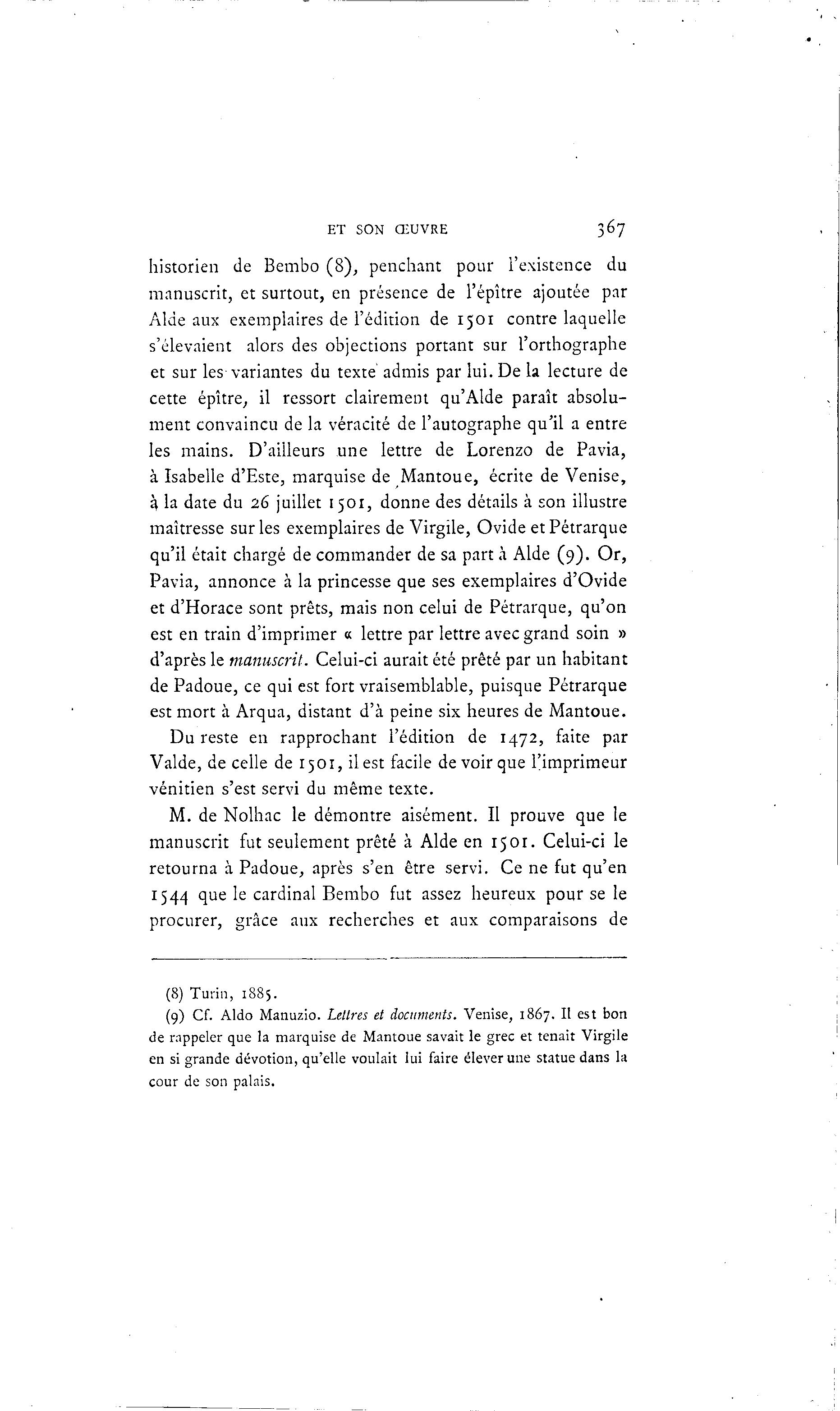 ET SON ŒUVRE 367 historien de Bembo (8), penchant pour l'existence du manuscrit, et surtout, en présence de l'épître ajoutée par Aide aux exemplaires de l'édition de 1501 contre laquelle s'élevaient alors des objections portant sur l'orthographe et sur les variantes du texte admis par lui. De la lecture de cette épître, il ressort clairement qu'Aide paraît absolu- ment convaincu de la véracité de l'autographe qu'il a entre les mains. D'ailleurs une lettre de Lorenzo de Pavia, à Isabelle d'Esté, marquise de Mantoue, écrite de Venise, à la date du 26 juillet 1501, donne des détails à son illustre maîtresse sur les exemplaires de Virgile, Ovide et Pétrarque qu'il était chargé de commander de sa part à Aide (9). Or, Pavia, annonce à la princesse que ses exemplaires d'Ovide et d'Horace sont prêts, mais non celui de Pétrarque, qu'on est en train d'imprimer « lettre par lettre avec grand soin » d'après le manuscrit. Celui-ci aurait été prêté par un habitant de Padoue, ce qui est fort vraisemblable, puisque Pétrarque est mort à Arqua, distant d'à peine six heures de Mantoue. Du reste en rapprochant l'édition de 1472, faite par Valde, de celle de 1501, il est facile de voir que l'imprimeur vénitien s'est servi du même texte. M. de Nolhac le démontre aisément. Il prouve que le manuscrit fut seulement prêté à Aide en 15 01. Celui-ci le retourna à Padoue, après s'en être servi. Ce ne fut qu'en 1544 que le cardinal Bembo fut assez heureux pour se le procurer, grâce aux recherches et aux comparaisons de (8) Turin, 1885. (9) Cf. Aldo Manuzio. Lettres et documents. Venise, 1867. Il est bon de rappeler que la marquise de Mantoue savait le grec et tenait Virgile en si grande dévotion, qu'elle voulait lui faire élever une statue dans la cour de son palais.