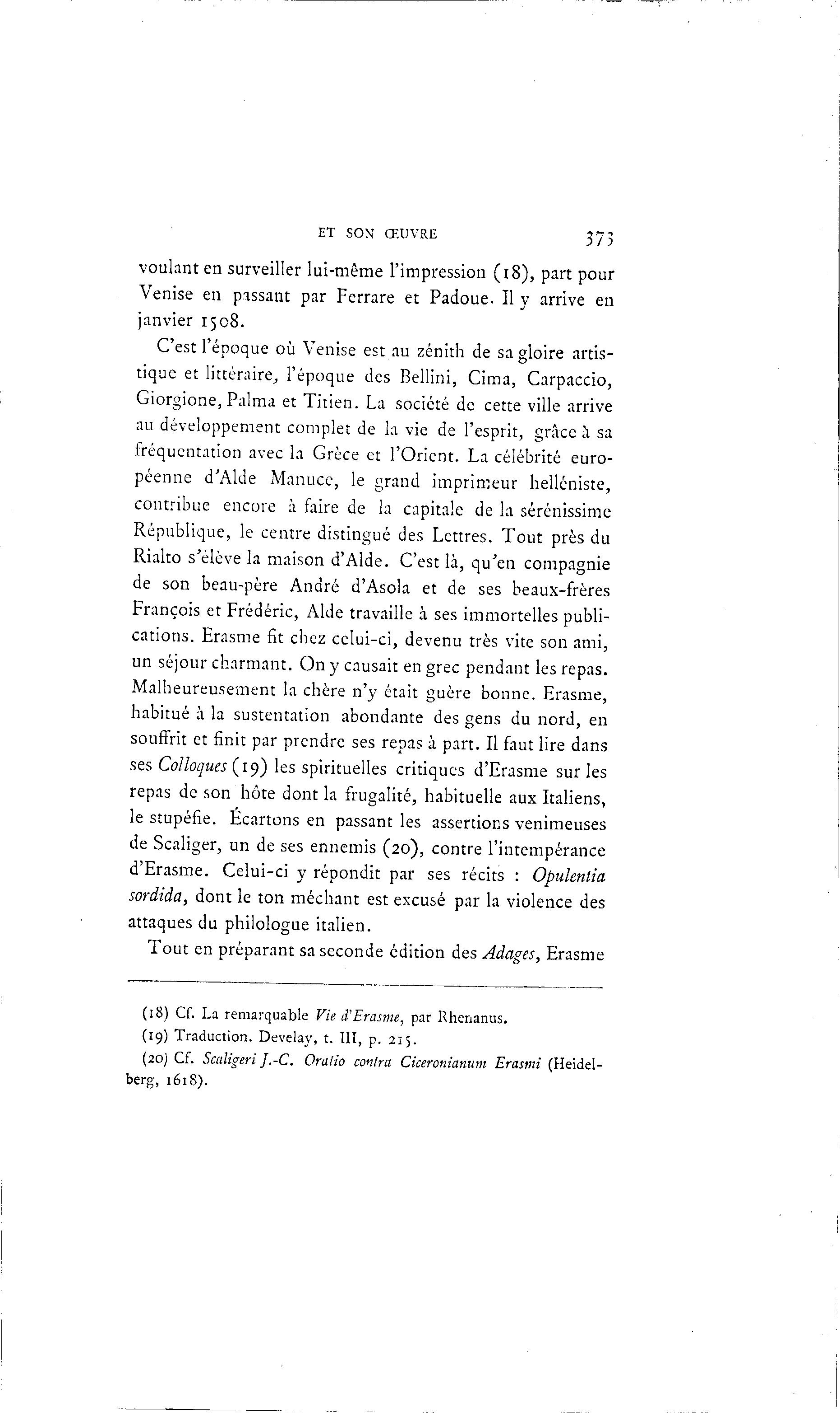 ET SON ŒUVRE 373 voulant en surveiller lui-même l'impression (18), part pour Venise en passant par Ferrare et Padoue. Il y arrive en janvier 1508. C'est l'époque où Venise est au zénith de sa gloire artis- tique et littéraire, l'époque des Bellini, Cima, Carpaccio, Giorgione, Palma et Titien. La société de cette ville arrive au développement complet de la vie de l'esprit, grâce à sa fréquentation avec la Grèce et l'Orient. La célébrité euro- péenne d'Aide Manuce, le grand imprimeur helléniste, contribue encore à faire de la capitale de la sérénissime République, le centre distingué des Lettres. Tout près du Rialto s'élève la maison d'Aide. C'est là , qu'en compagnie de son beau-père André d'Asola et de ses beaux-frères François et Frédéric, Aide travaille à ses immortelles publi- cations. Erasme fit chez celui-ci, devenu très vite son ami, un séjour charmant. On y causait en grec pendant les repas. Malheureusement la chère n'y était guère bonne. Erasme, habitué à la sustentation abondante des gens du nord, en souffrit et finit par prendre ses repas à part. Il faut lire dans ses Colloques (19) les spirituelles critiques d'Erasme sur les repas de son hôte dont la frugalité, habituelle aux Italiens, le stupéfie. Ecartons en passant les assertions venimeuses de Scaliger, un de ses ennemis (20), contre l'intempérance d'Erasme. Celui-ci y répondit par ses récits : Opulentia sordida, dont le ton méchant est excusé par la violence des attaques du philologue italien. Tout en préparant sa seconde édition des Adages, Erasme (18) Cf. La remarquable Vie d'Erasme, par Rhenanus. (19) Traduction. Develay, t. III, p. 215. (20J Cf. Scaligeri J.-C. Oratio contra Ciceronianum Erasmi (Heidel- berg, 1618).