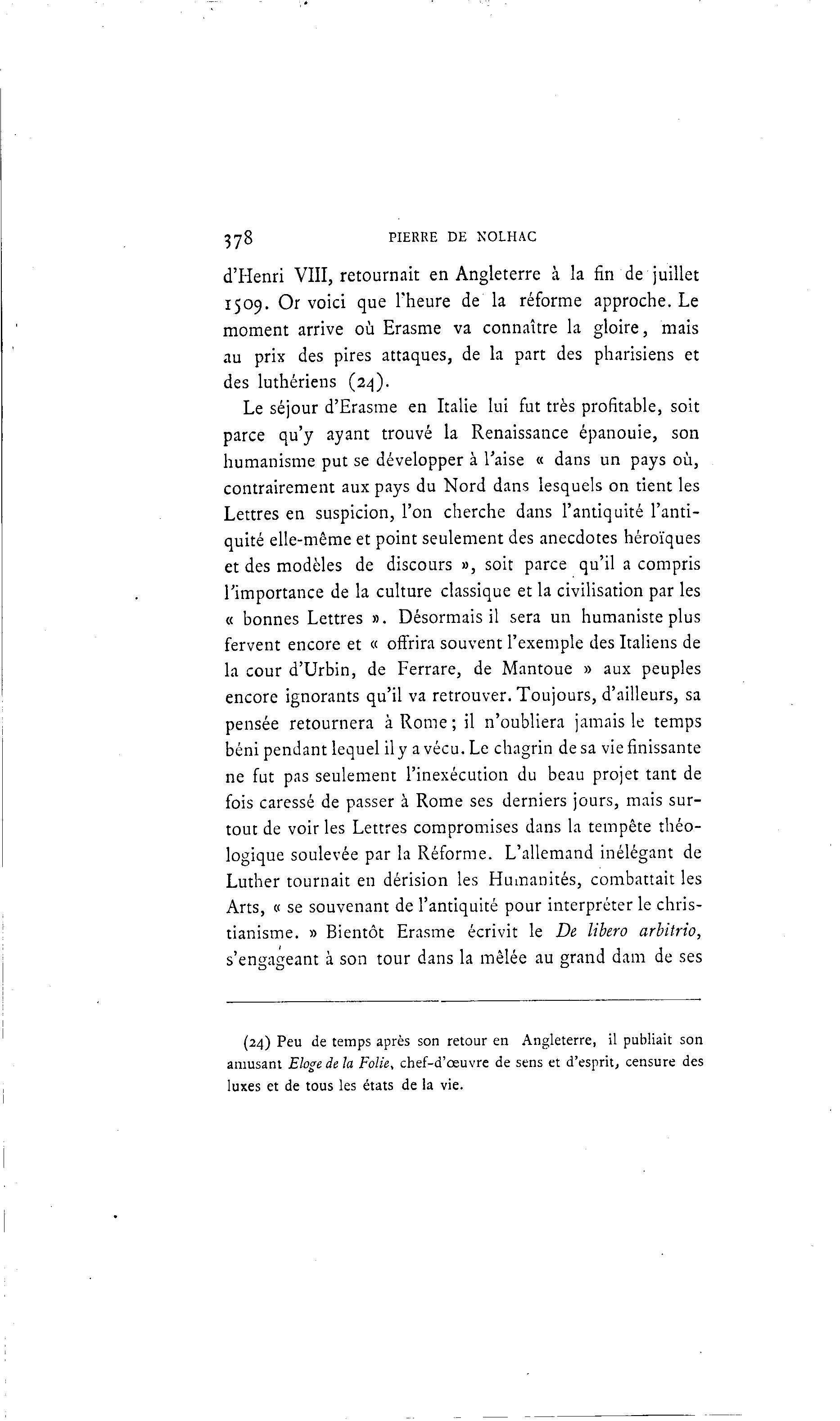 378 PIERRE DE NOLHAC d'Henri VIII, retournait en Angleterre à la fin de juillet 1509. Or voici que l'heure de la réforme approche. Le moment arrive où Erasme va connaître la gloire, mais au prix des pires attaques, de la part des pharisiens et des luthériens (24). Le séjour d'Erasme en Italie lui fut très profitable, soit parce qu'y ayant trouvé la Renaissance épanouie, son humanisme put se développer à Taise « dans un pays où, contrairement aux pays du Nord dans lesquels on tient les Lettres en suspicion, l'on cherche dans l'antiquité l'anti- quité elle-même et point seulement des anecdotes héroïques et des modèles de discours », soit parce qu'il a compris l'importance de la culture classique et la civilisation par les « bonnes Lettres ». Désormais il sera un humaniste plus fervent encore et « offrira souvent l'exemple des Italiens de la cour d'Urbin, de Ferrare, de Mantoue » aux peuples encore ignorants qu'il va retrouver. Toujours, d'ailleurs, sa pensée retournera à Rome ; il n'oubliera jamais le temps béni pendant lequel il y a vécu. Le chagrin de sa vie finissante ne fut pas seulement l'inexécution du beau projet tant de fois caressé de passer à Rome ses derniers jours, mais sur- tout de voir les Lettres compromises dans la tempête théo- logique soulevée par la Réforme. L'allemand inélégant de Luther tournait en dérision les Humanités, combattait les Arts, « se souvenant de l'antiquité pour interpréter le chris- tianisme. » Bientôt Erasme écrivit le De libcro arbitrio, s'engageant à son tour dans la mêlée au grand dam de ses (24) Peu de temps après son retour en Angleterre, il publiait son amusant Eloge delà Folie, chef-d'œuvre de sens et d'esprit, censure des luxes et de tous les états de la vie.