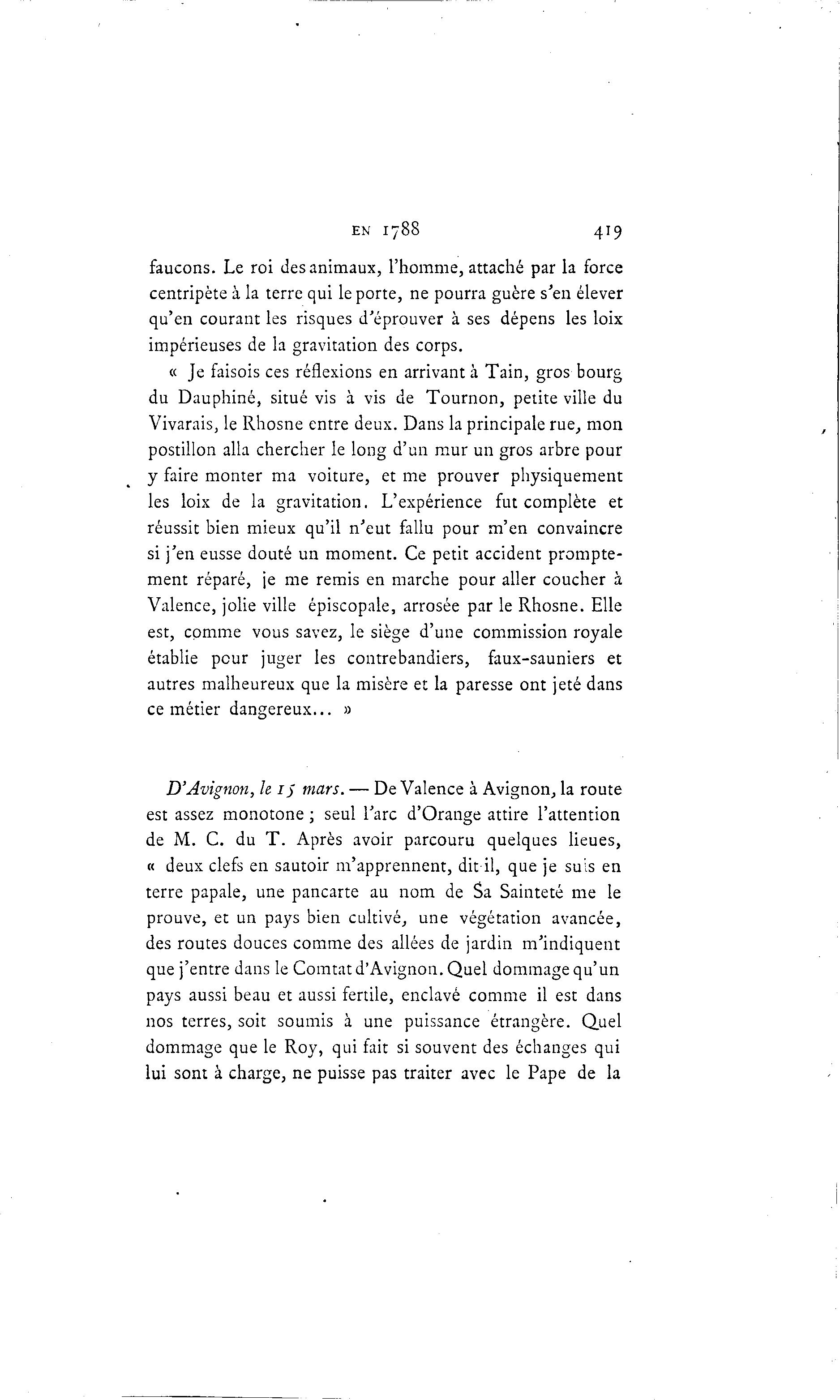 EN I788 419 faucons. Le roi des animaux, l'homme, attaché par la force centripète à la terre qui le porte, ne pourra guère s'en élever qu'en courant les risques d'éprouver à ses dépens les loix impérieuses de la gravitation des corps. « Je faisois ces réflexions en arrivant à Tain, gros bourg du Dauphiné, situé vis à vis de Tournon, petite ville du Vivarais, le Rhosne entre deux. Dans la principale rue, mon postillon alla chercher le long d'un mur un gros arbre pour y faire monter ma voiture, et me prouver physiquement les loix de la gravitation. L'expérience fut complète et réussit bien mieux qu'il n'eut fallu pour m'en convaincre si j'en eusse douté un moment. Ce petit accident prompte- ment réparé, je me remis en marche pour aller coucher à Valence, jolie ville épiscopale, arrosée par le Rhosne. Elle est, comme vous savez, le siège d'une commission royale établie peur juger les contrebandiers, faux-sauniers et autres malheureux que la misère et la paresse ont jeté dans ce métier dangereux... » D'Avignon, Je 15 mars. — De Valence à Avignon, la route est assez monotone ; seul l'arc d'Orange attire l'attention de M. C. du T . Après avoir parcouru quelques lieues, « deux clefs en sautoir m'apprennent, dit il, que je suis en terre papale, une pancarte au nom de Sa Sainteté me le prouve, et un pays bien cultivé, une végétation avancée, des routes douces comme des allées de jardin m'indiquent que j'entre dans le Comtat d'Avignon. Quel dommage qu'un pays aussi beau et aussi fertile, enclavé comme il est dans nos terres, soit soumis à une puissance étrangère. Quel dommage que le Roy, qui fait si souvent des échanges qui lui sont à charge, ne puisse pas traiter avec le Pape de la
