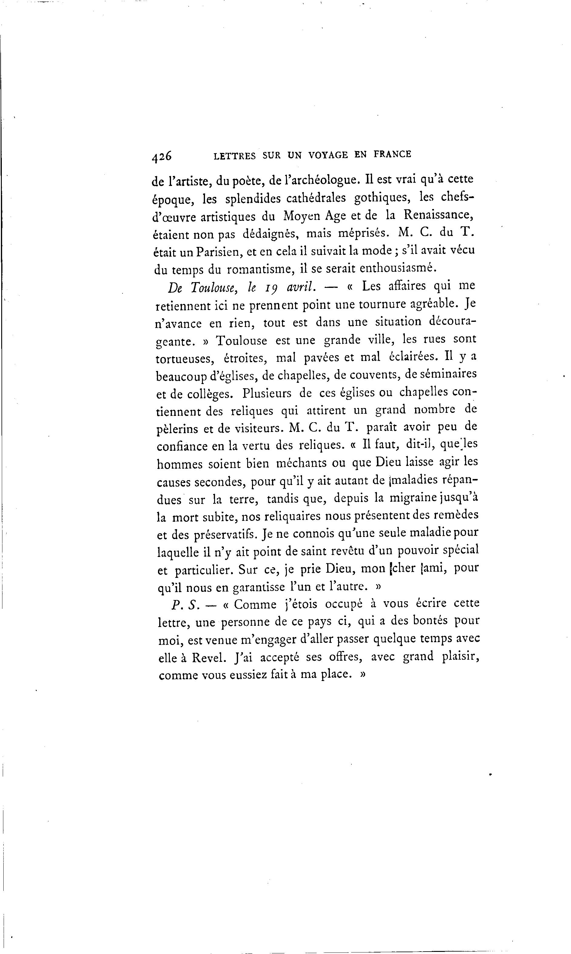 426 LETTRES SUR UN VOYAGE EN FRANCE de l'artiste, du poète, de l'archéologue. Il est vrai qu'à cette époque, les splendides cathédrales gothiques, les chefs- d'œuvre artistiques du Moyen Age et de la Renaissance, étaient non pas dédaignés, mais méprisés. M. C. du T . était un Parisien, et en cela il suivait la mode ; s'il avait vécu du temps du romantisme, il se serait enthousiasmé. De Toulouse, le iy avril. — « Les affaires qui me retiennent ici ne prennent point une tournure agréable. Je n'avance en rien, tout est dans une situation découra- geante. » Toulouse est une grande ville, les rues sont tortueuses, étroites, mal pavées et mal éclairées. Il y a beaucoup d'églises, de chapelles, de couvents, de séminaires et de collèges. Plusieurs de ces églises ou chapelles con- tiennent des reliques qui attirent un grand nombre de pèlerins et de visiteurs. M. C. du T . paraît avoir peu de confiance en la vertu des reliques. « Il faut, dit-il, quelles hommes soient bien méchants ou que Dieu laisse agir les causes secondes, pour qu'il y ait autant de jmaladies répan- dues sur la terre, tandis que, depuis la migraine jusqu'à la mort subite, nos reliquaires nous présentent des remèdes et des préservatifs. Je ne connois qu'une seule maladie pour laquelle il n'y ait point de saint revêtu d'un pouvoir spécial et particulier. Sur ce, je prie Dieu, mon (cher fami, pour qu'il nous en garantisse l'un et l'autre. » P. S. — « Comme j'étois occupé à vous écrire cette lettre, une personne de ce pays ci, qui a des bontés pour moi, est venue m'engager d'aller passer quelque temps avec elle à Revel. J'ai accepté ses offres, avec grand plaisir, comme vous eussiez fait à ma place. »