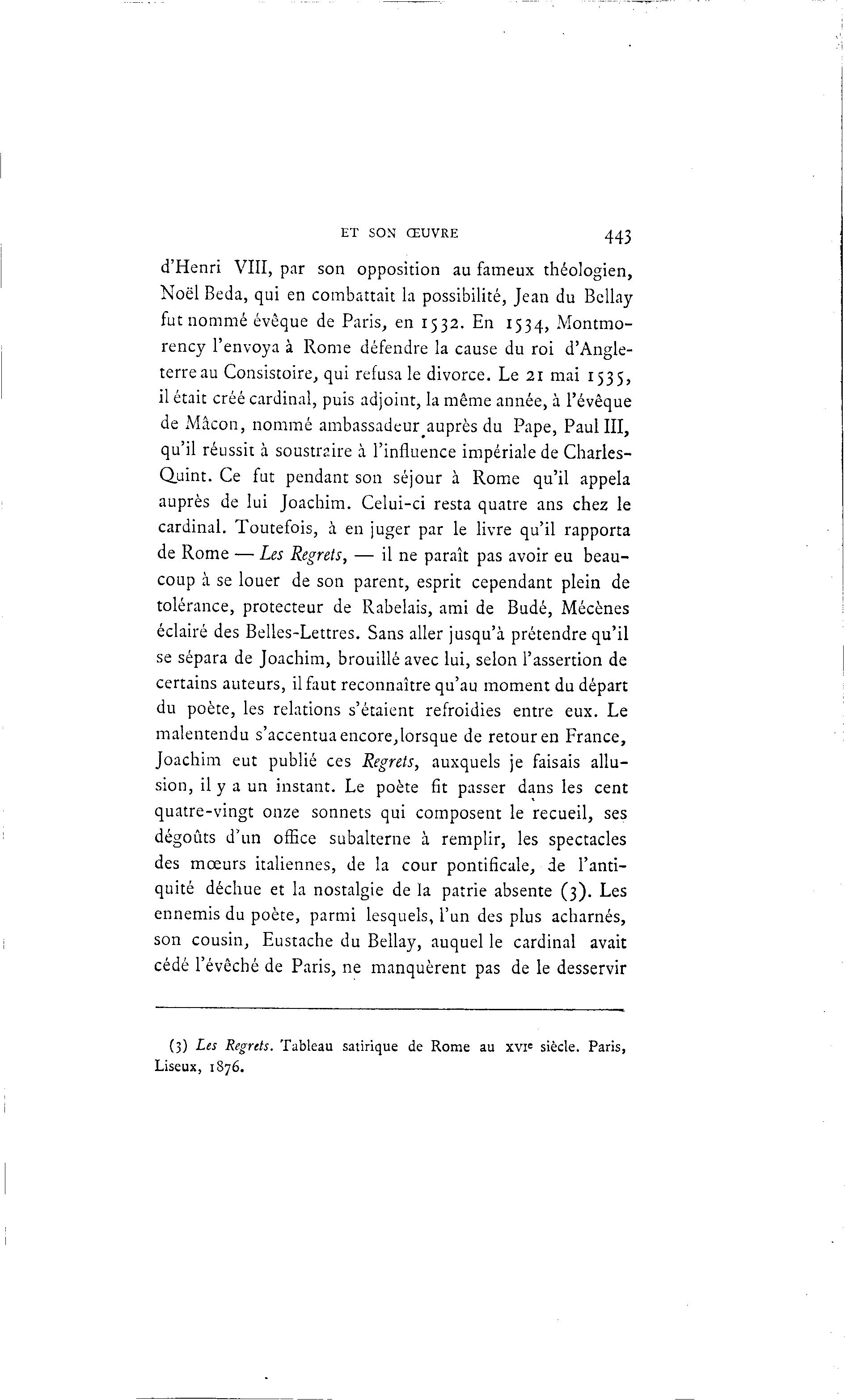 ET SON ŒUVRE 443 d'Henri VIII, par son opposition au fameux théologien, Noël Beda, qui en combattait la possibilité, Jean du Bellay fut nommé évêque de Paris, en 1532. En 1534, Montmo- rency l'envoya à Rome défendre la cause du roi d'Angle- terre au Consistoire, qui refusa le divorce. Le 21 mai 1535, il était créé cardinal, puis adjoint, la même année, à l'évêque de Mâcon, nommé ambassadeur^auprès du Pape, Paul III, qu'il réussit à soustraire à l'influence impériale de Charles- Quint. Ce fut pendant son séjour à Rome qu'il appela auprès de lui Joachim. Celui-ci resta quatre ans chez le cardinal. Toutefois, à en juger par le livre qu'il rapporta de Rome — Les Regrets, — il ne paraît pas avoir eu beau- coup à se louer de son parent, esprit cependant plein de tolérance, protecteur de Rabelais, ami de Budé, Mécènes éclairé des Belles-Lettres. Sans aller jusqu'à prétendre qu'il se sépara de Joachim, brouillé avec lui, selon l'assertion de certains auteurs, il faut reconnaître qu'au moment du départ du poète, les relations s'étaient refroidies entre eux. Le malentendu s'accentua encore,lorsque de retour en France, Joachim eut publié ces Regrets, auxquels je faisais allu- sion, il y a un instant. Le poète fit passer dans les cent quatre-vingt onze sonnets qui composent le recueil, ses dégoûts d'un office subalterne à remplir, les spectacles des mœurs italiennes, de la cour pontificale, de l'anti- quité déchue et la nostalgie de la patrie absente (3). Les ennemis du poète, parmi lesquels, l'un des plus acharnés, son cousin, Eustache du Bellay, auquel le cardinal avait cédé l'évêché de Paris, ne manquèrent pas de le desservir (3) Les Regrets. Tableau satirique de Rome au xvi= siècle. Paris, Liseux, 1876.