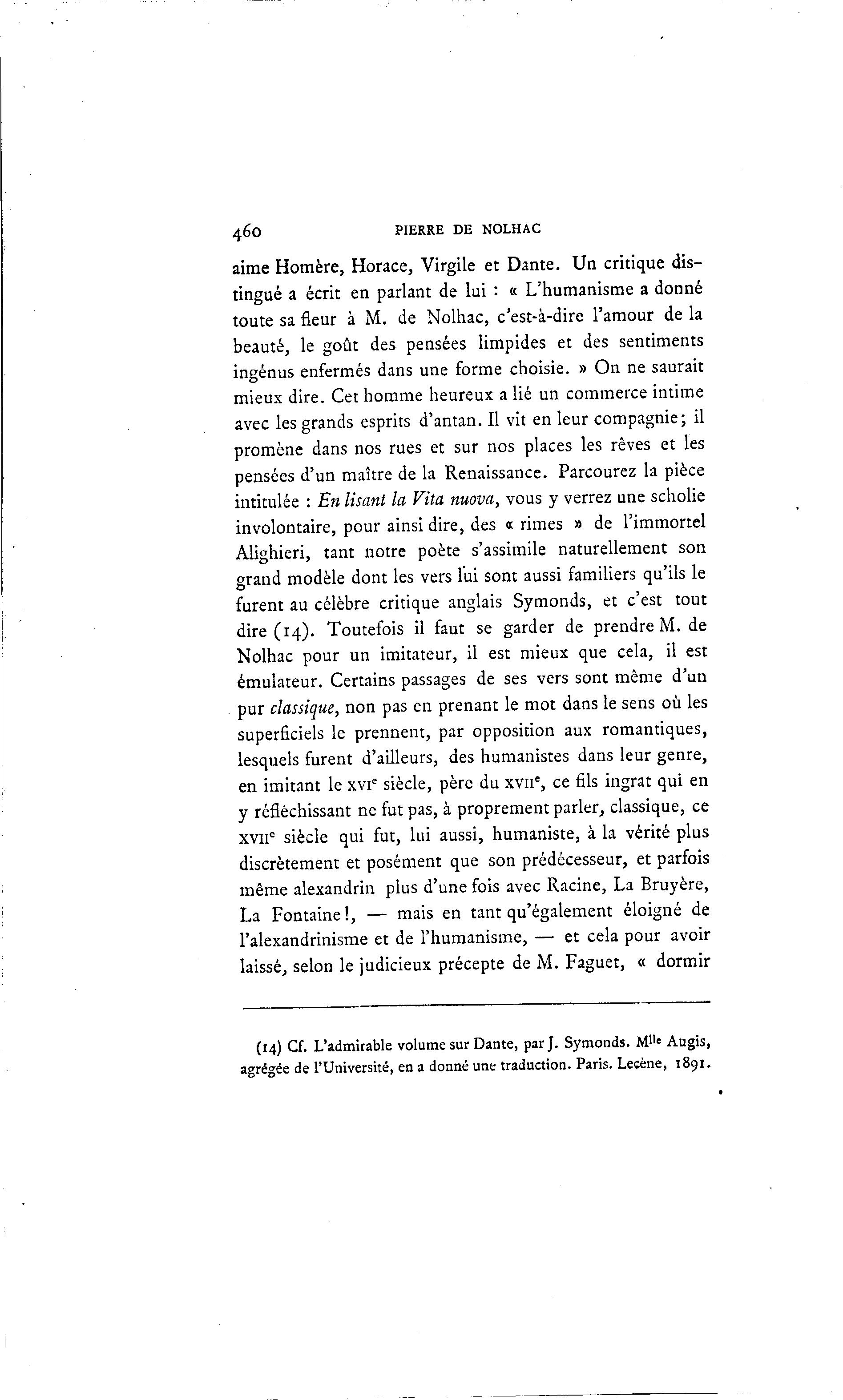 460 PIERRE DE NOLHAC aime Homère, Horace, Virgile et Dante. Un critique dis- tingué a écrit en parlant de lui : « L'humanisme a donné toute sa fleur à M. de Nolhac, c'est-à -dire l'amour de la beauté, le goût des pensées limpides et des sentiments ingénus enfermés dans une forme choisie. » On ne saurait mieux dire. Cet homme heureux a lié un commerce intime avec les grands esprits d'antan. Il vit en leur compagnie; il promène dans nos rues et sur nos places les rêves et les pensées d'un maître de la Renaissance. Parcourez la pièce intitulée : En lisant la Vita nuova, vous y verrez une scholie involontaire, pour ainsi dire, des « rimes » de l'immortel Alighieri, tant notre poète s'assimile naturellement son grand modèle dont les vers lui sont aussi familiers qu'ils le furent au célèbre critique anglais Symonds, et c'est tout dire (14). Toutefois il faut se garder de prendre M. de Nolhac pour un imitateur, il est mieux que cela, il est émulateur. Certains passages de ses vers sont même d'un pur classique, non pas en prenant le mot dans le sens où les superficiels le prennent, par opposition aux romantiques, lesquels furent d'ailleurs, des humanistes dans leur genre, en imitant le xvic siècle, père du xvn% ce fils ingrat qui en y réfléchissant ne fut pas, à proprement parler, classique, ce XVIIC siècle qui fut, lui aussi, humaniste, à la vérité plus discrètement et posément que son prédécesseur, et parfois même alexandrin plus d'une fois avec Racine, La Bruyère, La Fontaine!, — mais en tant qu'également éloigné de l'alexandrinisme et de l'humanisme, — et cela pour avoir laissé, selon le judicieux précepte de M. Faguet, « dormir (14) Cf. L'admirable volume sur Dante, parj. Symonds. MU' Augis, agrégée de l'Université, en a donné une traduction. Paris. Leeène, 1891.