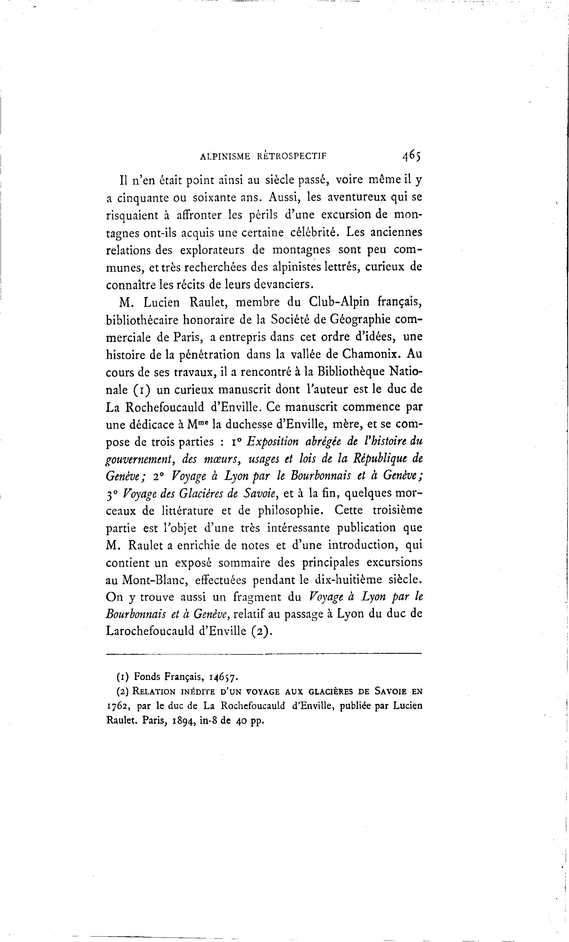 ALPINISME RÉTROSPECTIF 465 Il n'en était point ainsi au siècle passé, voire même il y a cinquante ou soixante ans. Aussi, les aventureux qui se risquaient à affronter les périls d'une excursion de mon- tagnes ont-ils acquis une certaine célébrité. Les anciennes relations des explorateurs de montagnes sont peu com- munes, et très recherchées des alpinistes lettrés, curieux de connaître les récits de leurs devanciers. M. Lucien Raulet, membre du Club-Alpin français, bibliothécaire honoraire de la Société de Géographie com- merciale de Paris, a entrepris dans cet ordre d'idées, une histoire de la pénétration dans la vallée de Chamonix. Au cours de ses travaux, il a rencontré à la Bibliothèque Natio- nale (1) un curieux manuscrit dont l'auteur est le duc de La Rochefoucauld d'Enville. Ce manuscrit commence par une dédicace à Mme la duchesse d'Enville, mère, et se com- pose de trois parties : i° Exposition abrégée de l'histoire du gouvernement, des mœurs, usages et lois de la République de Genève; 2° Voyage à Lyon par le Bourbonnais et à Genève; 3° Voyage des Glacières de Savoie, et à la fin, quelques mor- ceaux de littérature et de philosophie. Cette troisième partie est l'objet d'une très intéressante publication que M. Raulet a enrichie de notes et d'une introduction, qui contient un exposé sommaire des principales excursions au Mont-Blanc, effectuées pendant le dix-huitième siècle. On y trouve aussi un fragment du Voyage à Lyon par le Bourbonnais et à Genève, relatif au passage à Lyon du duc de Larochefoucauld d'Enville (2). (1) Fonds Français, 14657. (2) RELATION INÉDITE D'UN VOYAGE AUX GLACIÈRES DE SAVOIE EN 1762, par le duc de La Rochefoucauld d'Enville, publiée par Lucien Raulet. Paris, 1894, in-8 de 40 pp.