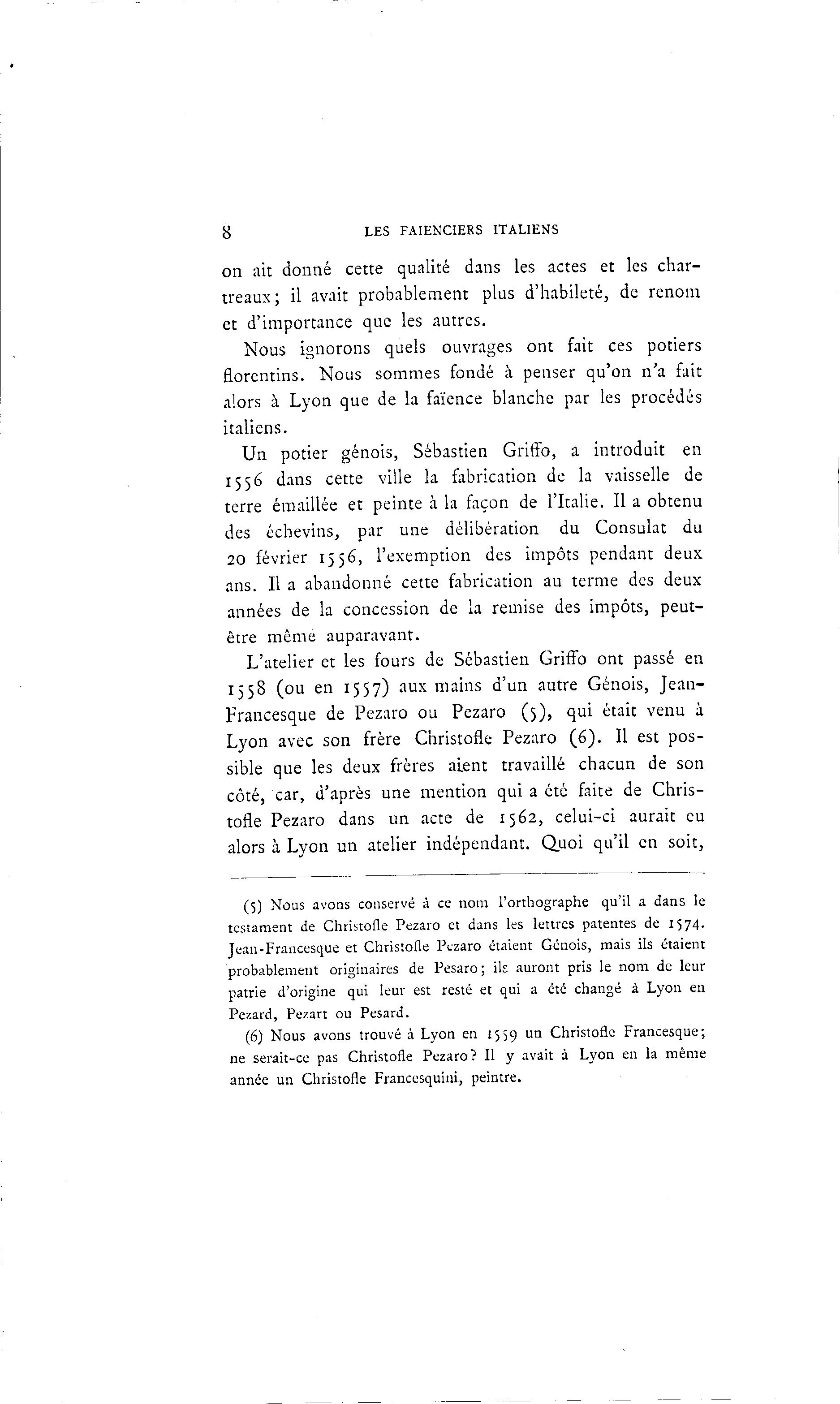 8 LES FAÏENCIERS ITALIENS on ait donné cette qualité dans les actes et les char- treaux; il avait probablement plus d'habileté, de renom et d'importance que les autres. Nous ignorons quels ouvrages ont fait ces potiers florentins. Nous sommes fondé à penser qu'on n'a fait alors à Lyon que de la faïence blanche par les procédés italiens. Un potier génois, Sébastien Griffo, a introduit en 1556 dans cette ville la fabrication de la vaisselle de terre émaillée et peinte à la façon de l'Italie. Il a obtenu des échevins, par une délibération du Consulat du 20 février 1556, l'exemption des impôts pendant deux ans. Il a abandonné cette fabrication au terme des deux années de la concession de la remise des impôts, peut- être même auparavant. L'atelier et les fours de Sébastien Griffo ont passé en 1558 (ou en 1557) aux mains d'un autre Génois, Jean- Francesque de Pezaro ou Pezaro (5), qui était venu à Lyon avec son frère Christofle Pezaro (6). Il est pos- sible que les deux frères aient travaillé chacun de son côté, car, d'après une mention qui a été faite de Chris- tofle Pezaro dans un acte de 1562, celui-ci aurait eu alors à Lyon un atelier indépendant. Quoi qu'il en soit, (5) Nous avons conservé à ce nom l'orthographe qu'il a dans le testament de Christofle Pezaro et dans les lettres patentes de 1574. Jean-Francesque et Christofle Pezaro étaient Génois, mais ils étaient probablement originaires de Pesaro ; ils auront pris le nom de leur patrie d'origine qui leur est resté et qui a été changé à Lyon en Pezard, Pezart ou Pesard. (6) Nous avons trouvé à Lyon en 1559 un Christofle Francesque; ne serait-ce pas Christofle Pezaro? Il y avait à Lyon en la même année ua Christofle Francesquini, peintre.