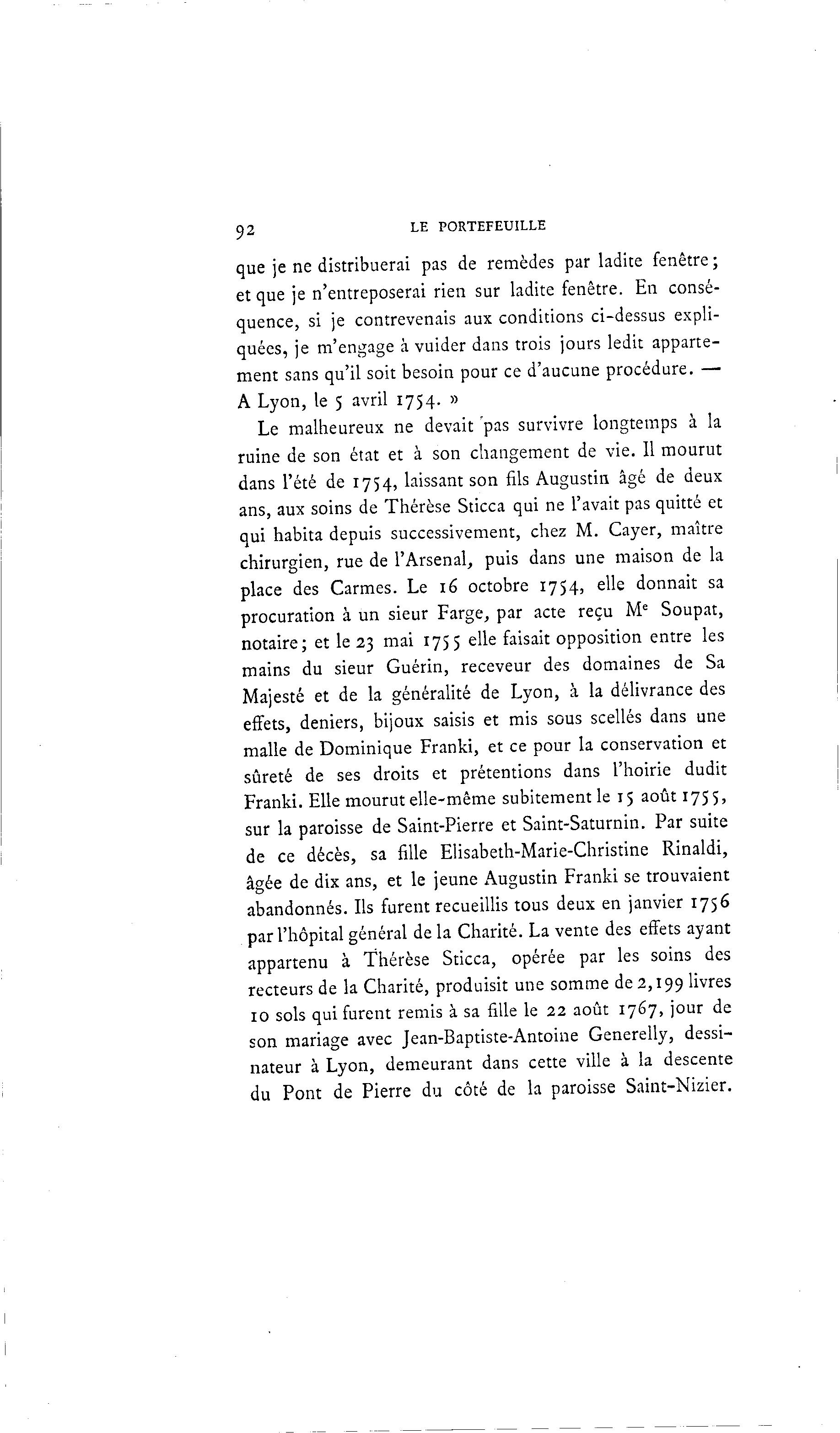 92 LE PORTEFEUILLE que je ne distribuerai pas de remèdes par ladite fenêtre ; et que je n'entreposerai rien sur ladite fenêtre. En consé- quence, si je contrevenais aux conditions ci-dessus expli- quées, je m'engage à vuider dans trois jours ledit apparte- ment sans qu'il soit besoin pour ce d'aucune procédure. — A Lyon, le 5 avril 1754. » Le malheureux ne devait pas survivre longtemps à la ruine de son état et à son changement de vie. 11 mourut dans l'été de 1754, laissant son fils Augustin âgé de deux ans, aux soins de Thérèse Sticca qui ne l'avait pas quitté et qui habita depuis successivement, chez M. Cayer, maître chirurgien, rue de l'Arsenal, puis dans une maison de la place des Carmes. Le 16 octobre 1754, elle donnait sa procuration à un sieur Farge, par acte reçu Me Soupat, notaire; et le 23 mai 1755 elle faisait opposition entre les mains du sieur Guérin, receveur des domaines de Sa Majesté et de la généralité de Lyon, à la délivrance des effets, deniers, bijoux saisis et mis sous scellés dans une malle de Dominique Franki, et ce pour la conservation et sûreté de ses droits et prétentions dans l'hoirie dudit Franki. Elle mourut elle-même subitement le 15 août 1755, sur la paroisse de Saint-Pierre et Saint-Saturnin. Par suite de ce décès, sa fille Elisabeth-Marie-Christine Rinaldi, âgée de dix ans, et le jeune Augustin Franki se trouvaient abandonnés. Ils furent recueillis tous deux en janvier 1756 par l'hôpital général de la Charité. La vente des effets ayant appartenu à Thérèse Sticca, opérée par les soins des recteurs de la Charité, produisit une somme de 2,199 livres 10 sols qui furent remis à sa fille le 22 août 1767, jour de son mariage avec Jean-Baptiste-Antoine Generelly, dessi- nateur à Lyon, demeurant dans cette ville à la descente du Pont de Pierre du côté de la paroisse Saint-Nizier.