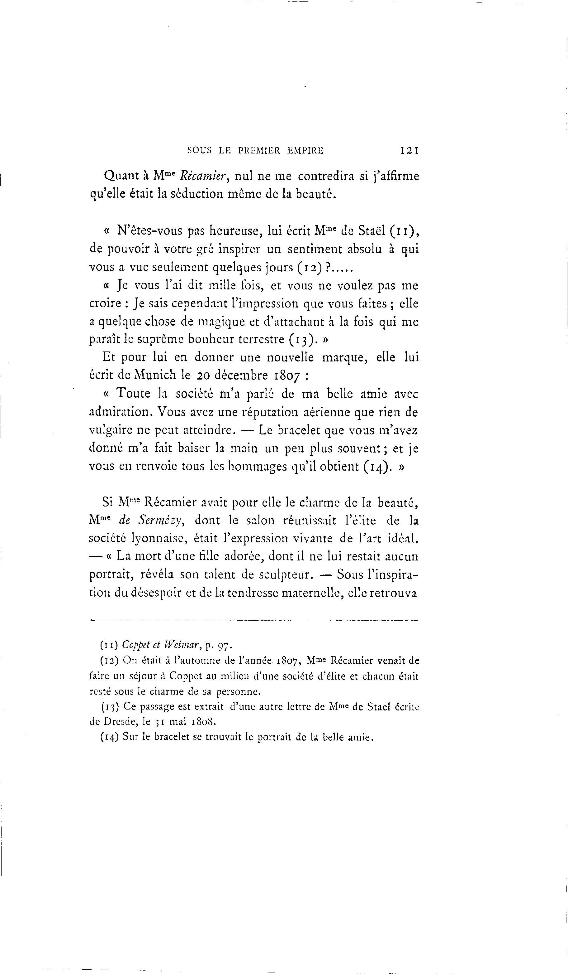 SOUS LE PREMIER EMPIRE 121 Quant à Mme Récamier, nul ne me contredira si j'affirme qu'elle était la séduction même de la beauté. « N'êtes-vous pas heureuse, lui écrit Mme de Staël ( n ) , de pouvoir à votre gré inspirer un sentiment absolu à qui vous a vue seulement quelques jours (12) ? « Je vous l'ai dit mille fois, et vous ne voulez pas me croire : Je sais cependant l'impression que vous faites ; elle a quelque chose de magique et d'attachant à la fois qui me paraît le suprême bonheur terrestre (13). » Et pour lui en donner une nouvelle marque, elle lui écrit de Munich le 20 décembre 1807 : « Toute la société m'a parlé de ma belle amie avec admiration. Vous avez une réputation aérienne que rien de vulgaire ne peut atteindre. — Le bracelet que vous m'avez donné m'a fait baiser la main un peu plus souvent; et je vous en renvoie tous les hommages qu'il obtient (14). » Si Mme Récamier avait pour elle le charme de la beauté, me M de Sermézy, dont le salon réunissait l'élite de la société lyonnaise, était l'expression vivante de l'art idéal. — « La mort d'une fille adorée, dont il ne lui restait aucun portrait, révéla son talent de sculpteur. — Sous l'inspira- tion du désespoir et de la tendresse maternelle, elle retrouva (11) Coppet et Weimar, p. 97. (12) On était à l'automne de l'année 1807, M me Récamier venait de faire un séjour à Coppet au milieu d'une société d'élite et chacun était resté sous le charme de sa personne. (15) Ce passage est extrait d'une autre lettre de M1»' de Staël écrite de Dresde, le 31 mai 1808. (14) Sur le bracelet se trouvait le portrait de la belle amie.
